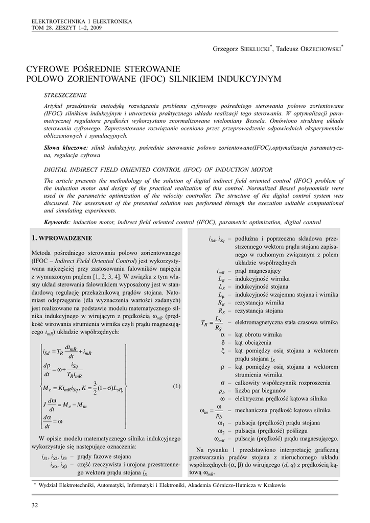 ELEKTROTECHNIKA Grzegorz SIEKLUCKI, Tadeusz I ELEKTRONIKA ORZECHOWSKI CYFROWE TOM 28. ZESZYT POREDNIE 12, 2009 STEROWANIE POLOWO ZORIENTOWANE (IFOC) SILNIKIEM INDUKCYJNYM Grzegorz SIEKLUCKI*, Tadeusz ORZECHOWSKI* CYFROWE POREDNIE STEROWANIE POLOWO ZORIENTOWANE (IFOC) SILNIKIEM INDUKCYJNYM STRESZCZENIE Artyku³ przedstawia metodykê rozwi¹zania problemu cyfrowego poredniego sterowania polowo zorientowane (IFOC) silnikiem indukcyjnym i utworzenia praktycznego uk³adu realizacji tego sterowania. W optymalizacji parametrycznej regulatora prêdkoci wykorzystano znormalizowane wielomiany Bessela. Omówiono strukturê uk³adu sterowania cyfrowego. Zaprezentowane rozwi¹zanie oceniono przez przeprowadzenie odpowiednich eksperymentów obliczeniowych i symulacyjnych. S³owa kluczowe: silnik indukcyjny, porednie sterowanie polowo zorientowane(IFOC),optymalizacja parametryczna, regulacja cyfrowa DIGITAL INDIRECT FIELD ORIENTED CONTROL (IFOC) OF INDUCTION MOTOR The article presents the methodology of the solution of digital indirect field oriented control (IFOC) problem of the induction motor and design of the practical realization of this control. Normalized Bessel polynomials were used in the parametric optimization of the velocity controller. The structure of the digital control system was discussed. The assessment of the presented solution was performed through the execution suitable computational and simulating experiments. Keywords: induction motor, indirect field oriented control (IFOC), parametric optimization, digital control 1. WPROWADZENIE Metoda poredniego sterowania polowo zorientowanego (IFOC Indirect Field Oriented Control) jest wykorzystywana najczêciej przy zastosowaniu falowników napiêcia z wymuszonym pr¹dem [1, 2, 3, 4]. W zwi¹zku z tym w³asny uk³ad sterowania falownikiem wyposa¿ony jest w standardow¹ regulacjê przekanikow¹ pr¹dów stojana. Natomiast odsprzêganie (dla wyznaczenia wartoci zadanych) jest realizowane na podstawie modelu matematycznego silnika indukcyjnego w wiruj¹cym z prêdkoci¹ ωmR (prêdkoæ wirowania strumienia wirnika czyli pr¹du magnesuj¹cego imR) uk³adzie wspó³rzêdnych: dimR ⎧ ⎫ ⎪iSd = TR dt + imR ⎪ ⎪ ⎪ iSq ⎪ dρ ⎪ = ω+ ⎪ ⎪ TR imR ⎪ dt ⎪ ⎪ ⎪ 3 ⎨ M e = KimR iSq , K = (1 − σ) LsP ⎬ b 2 ⎪ ⎪ ⎪ dω ⎪ = Me − Mm ⎪J ⎪ ⎪ dt ⎪ ⎪dα ⎪ =ω ⎪ ⎪ ⎩ dt ⎭ (1) W opisie modelu matematycznego silnika indukcyjnego wykorzystuje siê nastêpuj¹ce oznaczenia: iS1, iS2, iS3 pr¹dy fazowe stojana iSα, iSβ czêæ rzeczywista i urojona przestrzennego wektora pr¹du stojana iS * 32 iSd, iSq pod³u¿na i poprzeczna sk³adowa przestrzennego wektora pr¹du stojana zapisanego w ruchomym zwi¹zanym z polem uk³adzie wspó³rzêdnych imR pr¹d magnesuj¹cy LR indukcyjnoæ wirnika LS indukcyjnoæ stojana Lμ indukcyjnoæ wzajemna stojana i wirnika RR rezystancja wirnika RS rezystancja stojana L TR = S elektromagnetyczna sta³a czasowa wirnika RS α k¹t obrotu wirnika δ k¹t obci¹¿enia ξ k¹t pomiêdzy osi¹ stojana a wektorem pr¹du stojana iS ρ k¹t pomiêdzy osi¹ stojana a wektorem strumienia wirnika σ ca³kowity wspó³czynnik rozproszenia pb liczba par biegunów ω elektryczna prêdkoæ k¹towa silnika ω mechaniczna prêdkoæ k¹towa silnika ωm = pb ω1 pulsacja (prêdkoæ) pr¹du stojana ω2 pulsacja (prêdkoæ) polizgu ωmR pulsacja (prêdkoæ) pr¹du magnesuj¹cego. Na rysunku 1 przedstawiono interpretacjê graficzn¹ przetwarzania pr¹dów stojana z nieruchomego uk³adu wspó³rzêdnych (α, β) do wiruj¹cego (d, q) z prêdkoci¹ k¹tow¹ ωmR. Wydzia³ Elektrotechniki, Automatyki, Informatyki i Elektroniki, Akademia Górniczo-Hutnicza w Krakowie ELEKTROTECHNIKA I ELEKTRONIKA TOM 28. ZESZYT 12, 2009 2. STRUKTURA UK£ADU STEROWANIA Rys. 1. Zale¿noci k¹towe pomiêdzy pr¹dami w stanie ustalonym Do obliczenia pr¹dów stojana w uk³adzie stacjonarnym wykorzystuje siê transformacjê Clarke w postaci iS α (t ) = iS1 ⎧ ⎫ ⎪ ⎪ 1 2 ⎨ ⎬ = + ( ) ( ) i t i t i S1 S2 ⎪ ⎪ Sβ 3 3 ⎩ ⎭ (2) Natomiast do wyznaczenia pr¹dów w uk³adzie wiruj¹cym stosuje siê transformacjê Parka ⎪⎧ iSd = iS α cos ρ + iSβ sin ρ ⎪⎫ ⎨ ⎬ ⎩⎪iSq = −iS α sin ρ + iSβ cos ρ ⎭⎪ (3) Odsprzêganie w uk³adzie IFOC jest realizowane bez zastosowania obserwatorów lub specjalistycznych uk³adów pomiarowych. Jest to najprostszy sposób sterowania silnikiem wg polowo zorientowanych sk³adowych pr¹du stojana. Metoda ta pozwala na uzyskanie lepszych w³aciwoci dynamicznych ni¿ metody oparte na zasadzie U/f = const. Nazwa porednie sterowanie polowo zorientowane (IFOC) pochodzi od zasady wyznaczenia zadanych pr¹dów iSdref oraz iSqref na podstawie zadanego pr¹du magnesuj¹cego imRref oraz zadanej prêdkoci polizgu ω2ref , przy czym w uk³adzie sterowania nie wykorzystuje siê sprzê¿eñ zwrotnych od pr¹dów iSd i iSq. W przeciwieñstwie do bezporedniego sterowania polowo zorientowanego (DFOC), w którym wystêpuj¹ regulatory podrzêdne pr¹dów iSd i iSq, które s¹ wyznaczane na podstawie sygna³ów pomiarowych. Dodatkowo w metodzie IFOC k¹t ρ wykorzystywany w transformacji (3) jest wielkoci¹ zadan¹, a w metodzie DFOC jest obliczany w obserwatorze lub symulatorze [5, 6]. Wzwi¹zku z tym sterowanie bezporednie [1, 4, 7, 8] jest znacznie bardziej skomplikowane ni¿ sterowanie porednie. Na podstawie modelu matematycznego (1) wyznaczana jest struktura uk³adu odsprzêgaj¹cego. Procedura ta polega na wyznaczeniu zale¿noci na zadane pr¹dy iSd oraz iSq ref iSd ref = (TRs + 1)imR iSq ref = TRω2 ref i ref mRref ref (4) (5) oraz po¿¹danego k¹ta po³o¿enia wiruj¹cego uk³adu wspó³rzêdnych 1 ρref = ωmRref s (6) K¹t ten jest potrzebny do przeprowadzenia odwrotnej transformaty Parka i jego wyznaczenie odbywa siê na podstawie sygna³u zadanego polizgu ω2 , który jest wytwaref rzany przez regulator prêdkoci GR(s). Wniektórych przypadkach konieczne jest zastosowanie filt