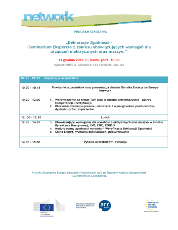 PROGRAM SZKOLENIA „Deklaracje Zgodności -Seminarium Ekspercie z zakresu obowiązujących wymagań dla urządzeń elektrycznych oraz maszyn.” 13 grudnia 2016 r., Konin, godz. 10:00 Budynek WORD ul. Zakładowa 4,62-510 Konin, Sala 128 09.30 – 09.55 10.00 – 10.15 10.20 – 12.00 12. 00 – 12.30 12.30 – 14.30 14.30 – 15.00 Rejestracja uczestników Powitanie uczestników oraz prezentacja działań Ośrodka Enterprise Europe Network 1. Wprowadzenie na temat TUV jako jednostki certyfikacyjnej – zakres kompetencji i certyfikacji 2. Otoczenie formalno-prawne - obowiązki i wymogi wobec producentów, dystrybutorów, importerów Lunch 3. Obowiązujące wymagania dla wyrobów elektrycznych oraz maszyn w świetle Dyrektywy Maszynowej, LVD, EMC, ROHS II 4. Moduły oceny zgodności wyrobów – Weryfikacja Deklaracji Zgodności 5. China Export, wymiana doświadczeń, podsumowanie Pytania uczestników, dyskusja Projekt Enterprise Europe Network finansowany jest ze środków Komisji Europejskiej i Ministerstwa Gospodarki.