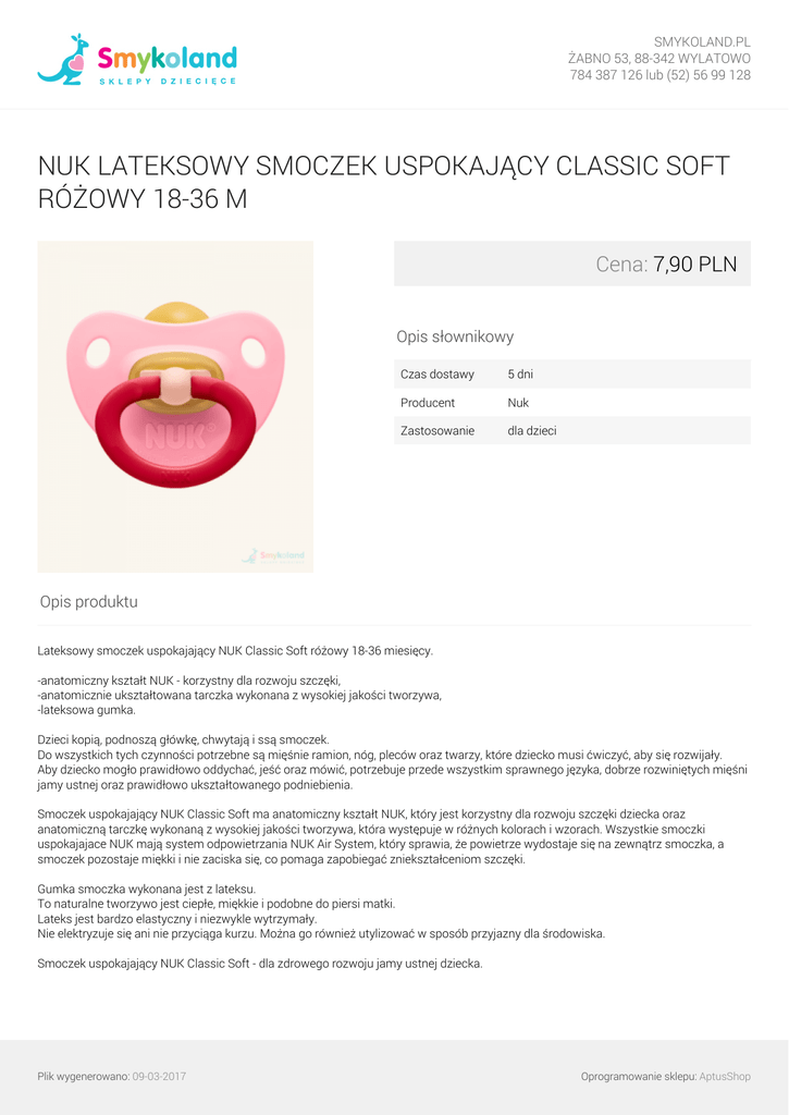 SMYKOLAND.PL ŻABNO 53, 88-342 WYLATOWO 784 387 126 lub (52) 56 99 128 NUK LATEKSOWY SMOCZEK USPOKAJĄCY CLASSIC SOFT RÓŻOWY 18-36 M Cena: 7,90 PLN Opis słownikowy Czas dostawy 5 dni Producent Nuk Zastosowanie dla dzieci Opis produktu Lateksowy smoczek uspokajający NUK Classic Soft różowy 18-36 miesięcy. -anatomiczny kształt NUK - korzystny dla rozwoju szczęki, -anatomicznie ukształtowana tarczka wykonana z wysokiej jakości tworzywa, -lateksowa gumka. Dzieci kopią, podnoszą główkę, chwytają i ssą smoczek. Do wszystkich tych czynności potrzebne są mięśnie ramion, nóg, pleców oraz twarzy, które dziecko musi ćwiczyć, aby się rozwijały. Aby dziecko mogło prawidłowo oddychać, jeść oraz mówić, potrzebuje przede wszystkim sprawnego języka, dobrze rozwiniętych mięśni jamy ustnej oraz prawidłowo ukształtowanego podniebienia. Smoczek uspokajający NUK Classic Soft ma anatomiczny kształt NUK, który jest korzystny dla rozwoju szczęki dziecka oraz anatomiczną tarczkę wykonaną z wysokiej jakości tworzywa, która występuje w różnych kolorach i wzorach. Wszystkie smoczki uspokajajace NUK mają system odpowietrzania NUK Air System, który sprawia, że powietrze wydostaje się na zewnątrz smoczka, a smoczek pozostaje miękki i nie zaciska się, co pomaga zapobiegać zniekształceniom szczęki. Gumka smoczka wykonana jest z lateksu. To naturalne tworzywo jest ciepłe, miękkie i podobne do piersi matki. Lateks jest bardzo elastyczny i niezwykle wytrzymały. Nie elektryzuje się ani nie przyciąga kurzu. Można go również utylizować w sposób przyjazny dla środowiska. Smoczek uspokajający NUK Classic Soft - dla zdrowego rozwoju jamy ustnej dziecka. Plik wygenerowano: 09-03-2017 Oprogramowanie sklepu: AptusShop SMYKOLAND.PL ŻABNO 53, 88-342 WYLATOWO 784 387 126 lub (52) 56 99 128 Plik wygenerowano: 09-03-2017 Powered by TCPDF (www.tcpdf.org) Oprogramowanie sklepu: AptusShop