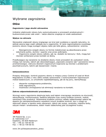 Wybrane zagroŜenia Ołów ZagroŜenie i jego skutki zdrowotne Unikalne właściwości ołowiu były wykorzystywane w procesach produkcyjnych i budownictwie przez całe wieki – takŜe obecnie znajduje on wiele zastosowań. Wpływ na zdrowie Wprawdzie większość ołowiu krąŜącego we krwi jest wydalana w sposób naturalny, to jednak pewna jego część odkłada się w organizmie. W razie nagromadzenia wysokiego poziomu ołowiu mogą wystąpić objawy takie jak bóle głowy, zatwardzenia i anemia. • • Nieorganiczne związki ołowiu (w formie metalicznej) są absorbowane przez wdychanie pyłów, dymów i oparów oraz przez połknięcie. Organiczne związki ołowiu (alkile), jak np. dodatki do benzyny i farb, mogą być równieŜ wchłaniane przez kontakt ze skórą. PrzedłuŜające się naraŜenie na działanie ołowiu moŜe prowadzić do uszkodzeń nerek, mózgu lub nerwów, takich jak obezwładniające „cepowate zwisanie ręki” (poraŜenie nerwu promieniowego). Zatrucia ołowiem organicznym kojarzone są równieŜ z problemami psychiatrycznymi, takimi jak bezsenność i manie. Ustawodawstwo Przepisy dotyczące kontroli poziomu ołowiu w miejscu pracy Control of Lead at Work Regulations (CLAW) z roku 2002 zostały opracowane z wykorzystaniem najnowszych metod badawczych, co umoŜliwiło najdokładniejszą, jak do tej pory, identyfikację: • • • obszarów występowania problemów, osób zagroŜonych, moŜliwości zmniejszenia lub eliminacji naraŜenia na kontakt. Zakres odpowiedzialności pracodawcy Wymogi oceny zagroŜenia obejmują testy pod kątem znaczącego naraŜenia na styczność, identyfikację, monitorowanie, badania lekarskie oraz ocenę środków kontroli, metod, wentylacji oraz produkcji. Stosowanie środków ochrony układu oddechowego zaleca się dopiero po zaimplementowaniu wszelkich innych środków kontroli, lecz z uwagi na obecność ołowiu w bardzo wielu obszarach, takich jak wytop, ceramika, niektóre farby, odzysk metali i emaliowanie, dobór maski oddechowej jest szczególnie trudny. 3 3M Poland Sp. z o.o. al. Katowicka 117 Kajetany, 05-830 Nadarzyn Tel.: +48 22 739 60 00 Fax: + 48 22 739 60 01 www.3m.pl/bezpieczenstwo_pracy
