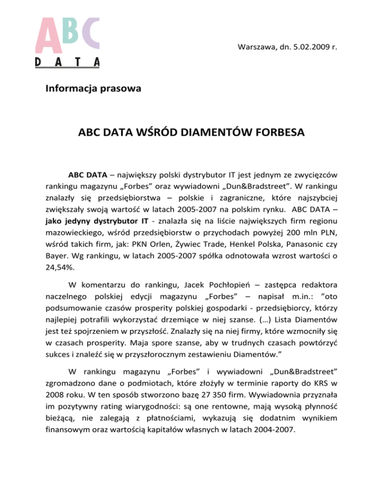 Warszawa, dn. 5.02.2009 r. Informacja prasowa ABC DATA WŚRÓD DIAMENTÓW FORBESA ABC DATA – największy polski dystrybutor IT jest jednym ze zwycięzców rankingu magazynu „Forbes” oraz wywiadowni „Dun&Bradstreet”. W rankingu znalazły się przedsiębiorstwa – polskie i zagraniczne, które najszybciej zwiększały swoją wartość w latach 2005-2007 na polskim rynku. ABC DATA – jako jedyny dystrybutor IT - znalazła się na liście największych firm regionu mazowieckiego, wśród przedsiębiorstw o przychodach powyżej 200 mln PLN, wśród takich firm, jak: PKN Orlen, Żywiec Trade, Henkel Polska, Panasonic czy Bayer. Wg rankingu, w latach 2005-2007 spółka odnotowała wzrost wartości o 24,54%. W komentarzu do rankingu, Jacek Pochłopień – zastępca redaktora naczelnego polskiej edycji magazynu „Forbes” – napisał m.in.: ”oto podsumowanie czasów prosperity polskiej gospodarki - przedsiębiorcy, którzy najlepiej potrafili wykorzystać drzemiące w niej szanse. (…) Lista Diamentów jest też spojrzeniem w przyszłość. Znalazły się na niej firmy, które wzmocniły się w czasach prosperity. Maja spore szanse, aby w trudnych czasach powtórzyć sukces i znaleźć się w przyszłorocznym zestawieniu Diamentów.” W rankingu magazynu „Forbes” i wywiadowni „Dun&Bradstreet” zgromadzono dane o podmiotach, które złożyły w terminie raporty do KRS w 2008 roku. W ten sposób stworzono bazę 27 350 firm. Wywiadownia przyznała im pozytywny rating wiarygodności: są one rentowne, mają wysoką płynność bieżącą, nie zalegają z płatnościami, wykazują się dodatnim wynikiem finansowym oraz wartością kapitałów własnych w latach 2004-2007. ABC Data Sp. z o.o. to największa spółka należąca do ABC DATA Holding SA. Spółka od lat pozostaje liderem branży IT w Polsce i w Europie Środkowo-Wschodniej. Wg czerwcowego rankingu Teleinfo 500 to największa polska firma informatyczna, największy dystrybutor sprzętu IT i największy eksporter produktów IT. W dniu 28 grudnia 2007 roku 80% udziałów właściciela spółki – firmy ABC DATA Holding SA zostało nabytych przez fundusz MCI Investment Fund SA. Właścicielem pozostałych 20% udziałów stał się Actebis Holding GmbH. Więcej informacji na temat ABC DATA Holding SA i ABC DATA Sp. z o.o. udziela KancelariaPR. Kontakt: Katarzyna Łastowiecka Tel. Kom. +48 518 930 101 Kancelaria PR Sp. z o.o. Ul. Krasińskiego 2A/20 01-601 Warszawa Tel.: +48 22 869 77 84 Fax: +48 22 869 77 88