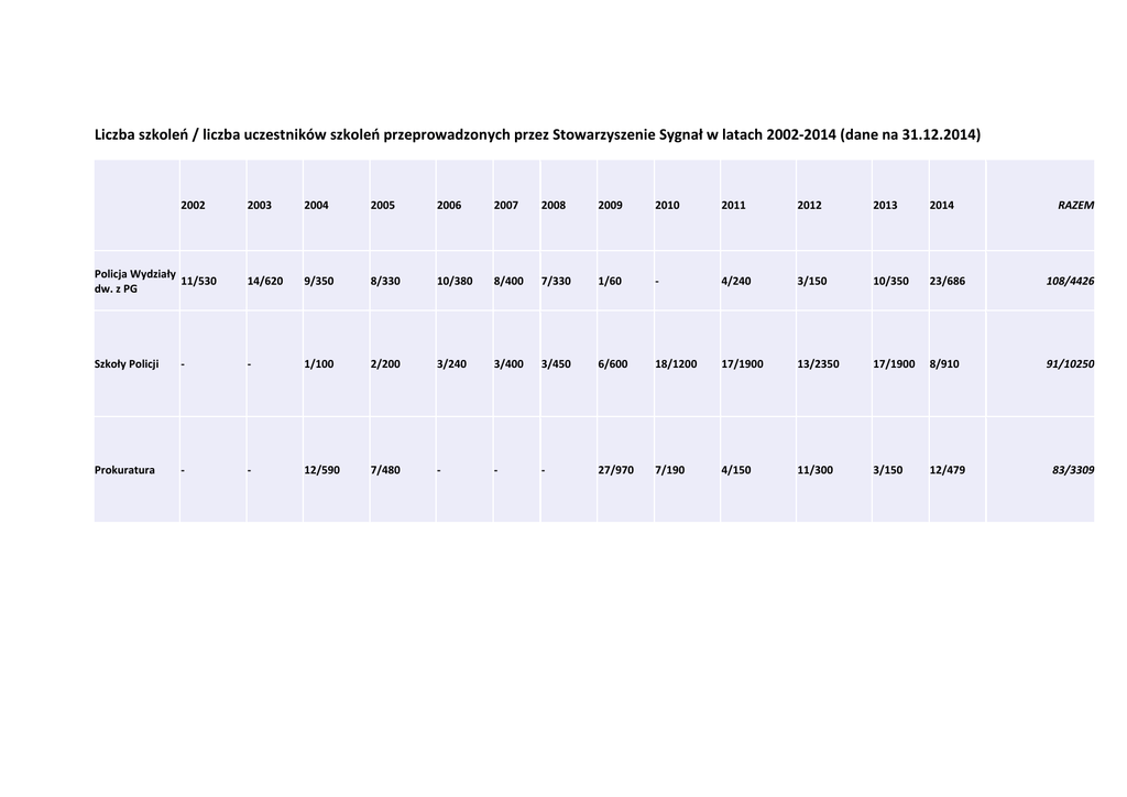 Liczba szkoleń / liczba uczestników szkoleń przeprowadzonych przez Stowarzyszenie Sygnał w latach 2002-2014 (dane na 31.12.2014) 2002 2003 2004 2005 2006 2007 2008 2009 2010 2011 2012 2013 2014 RAZEM Policja Wydziały 11/530 dw. z PG 14/620 9/350 8/330 10/380 8/400 7/330 1/60 - 4/240 3/150 10/350 23/686 108/4426 Szkoły Policji - - 1/100 2/200 3/240 3/400 3/450 6/600 18/1200 17/1900 13/2350 17/1900 8/910 91/10250 Prokuratura - - 12/590 7/480 - - - 27/970 7/190 4/150 11/300 3/150 12/479 83/3309