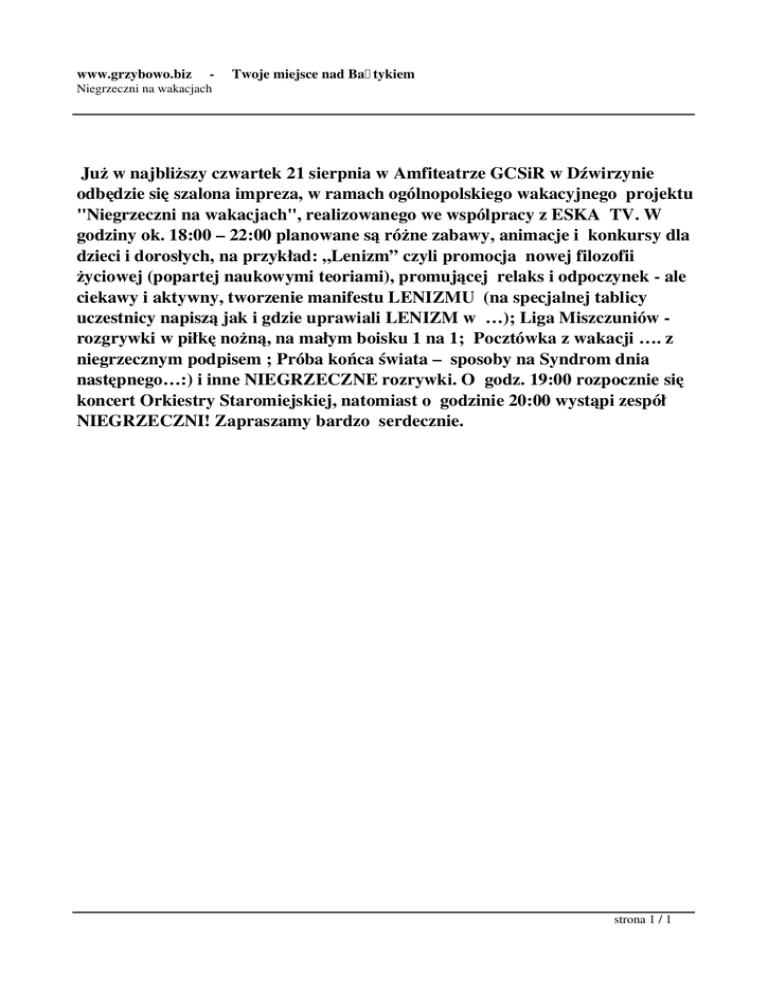 www.grzybowo.biz - Niegrzeczni na wakacjach Twoje miejsce nad Ba�tykiem Już w najbliższy czwartek 21 sierpnia w Amfiteatrze GCSiR w Dźwirzynie odbędzie się szalona impreza, w ramach ogólnopolskiego wakacyjnego projektu "Niegrzeczni na wakacjach", realizowanego we wspólpracy z ESKA TV. W godziny ok. 18:00 – 22:00 planowane są różne zabawy, animacje i konkursy dla dzieci i dorosłych, na przykład: „Lenizm” czyli promocja nowej filozofii życiowej (popartej naukowymi teoriami), promującej relaks i odpoczynek - ale ciekawy i aktywny, tworzenie manifestu LENIZMU (na specjalnej tablicy uczestnicy napiszą jak i gdzie uprawiali LENIZM w …); Liga Miszczuniów rozgrywki w piłkę nożną, na małym boisku 1 na 1; Pocztówka z wakacji …. z niegrzecznym podpisem ; Próba końca świata – sposoby na Syndrom dnia następnego…:) i inne NIEGRZECZNE rozrywki. O godz. 19:00 rozpocznie się koncert Orkiestry Staromiejskiej, natomiast o godzinie 20:00 wystąpi zespół NIEGRZECZNI! Zapraszamy bardzo serdecznie. strona 1 / 1