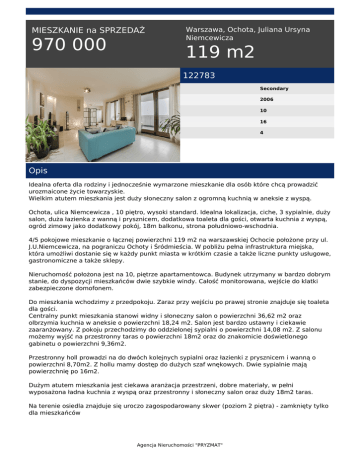 MIESZKANIE na SPRZEDAŻ 970 000 Warszawa, Ochota, Juliana Ursyna Niemcewicza 119 m2 122783 Secondary 2006 10 16 4 Opis Idealna oferta dla rodziny i jednocześnie wymarzone mieszkanie dla osób które chcą prowadzić urozmaicone życie towarzyskie. Wielkim atutem mieszkania jest duży słoneczny salon z ogromną kuchnią w aneksie z wyspą. Ochota, ulica Niemcewicza , 10 piętro, wysoki standard. Idealna lokalizacja, ciche, 3 sypialnie, duży salon, duża łazienka z wanną i prysznicem, dodatkowa toaleta dla gości, otwarta kuchnia z wyspą, ogród zimowy jako dodatkowy pokój, 18m balkonu, strona południowo-wschodnia. 4/5 pokojowe mieszkanie o łącznej powierzchni 119 m2 na warszawskiej Ochocie położone przy ul. J.U.Niemcewicza, na pograniczu Ochoty i Śródmieścia. W pobliżu pełna infrastruktura miejska, która umożliwi dostanie się w każdy punkt miasta w krótkim czasie a także liczne punkty usługowe, gastronomiczne a także sklepy. Nieruchomość położona jest na 10, piętrze apartamentowca. Budynek utrzymany w bardzo dobrym stanie, do dyspozycji mieszkańców dwie szybkie windy. Całość monitorowana, wejście do klatki zabezpieczone domofonem. Do mieszkania wchodzimy z przedpokoju. Zaraz przy wejściu po prawej stronie znajduje się toaleta dla gości. Centralny punkt mieszkania stanowi widny i słoneczny salon o powierzchni 36,62 m2 oraz olbrzymia kuchnia w aneksie o powierzchni 18,24 m2. Salon jest bardzo ustawny i ciekawie zaaranżowany. Z pokoju przechodzimy do oddzielonej sypialni o powierzchni 14,08 m2. Z salonu możemy wyjść na przestronny taras o powierzchni 18m2 oraz do znakomicie doświetlonego gabinetu o powierzchni 9,36m2. Przestronny holl prowadzi na do dwóch kolejnych sypialni oraz łazienki z prysznicem i wanną o powierzchni 8,70m2. Z hollu mamy dostęp do dużych szaf wnękowych. Dwie sypialnie mają powierzchnię po 16m2. Dużym atutem mieszkania jest ciekawa aranżacja przestrzeni, dobre materiały, w pełni wyposażona ładna kuchnia z wyspą oraz przestronny i słoneczny salon oraz duży 18m2 taras. Na terenie osiedla znajduje się uroczo zagospodarowany skwer (poziom 2 piętra) - zamknięty tylko dla mieszkańców Agencja Nieruchomości "PRYZMAT" Koniecznie zadzwoń i umów się na prezentację- już dziś zamieszkaj w jednym z najlepszych punktów miasta, nie trać czasu na długie dojazdy i ciesz się komfortem i wygodą. Agencja Nieruchomości "PRYZMAT" tel. 25 758 66 26 email: [email protected] Agencja Nieruchomości "PRYZMAT" Powered by TCPDF (www.tcpdf.org)