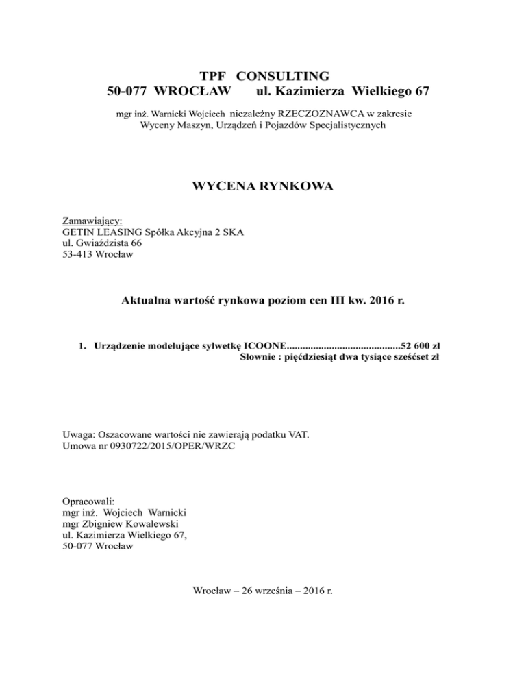 TPF CONSULTING 50-077 WROCŁAW ul. Kazimierza Wielkiego 67 mgr inż. Warnicki Wojciech niezależny RZECZOZNAWCA w zakresie Wyceny Maszyn, Urządzeń i Pojazdów Specjalistycznych WYCENA RYNKOWA Zamawiający: GETIN LEASING Spółka Akcyjna 2 SKA ul. Gwiaździsta 66 53-413 Wrocław Aktualna wartość rynkowa poziom cen III kw. 2016 r. 1. Urządzenie modelujące sylwetkę ICOONE...........................................52 600 zł Słownie : pięćdziesiąt dwa tysiące sześćset zł Uwaga: Oszacowane wartości nie zawierają podatku VAT. Umowa nr 0930722/2015/OPER/WRZC Opracowali: mgr inż. Wojciech Warnicki mgr Zbigniew Kowalewski ul. Kazimierza Wielkiego 67, 50-077 Wrocław Wrocław – 26 września – 2016 r. 3.0. PRZEDMIOT WYCENY. 3.3. Urządzenie modelujące sylwetkę ICOONE Brak dokumentacji technicznej i deklaracji zgodności. 3.3.1. Charakterystyka techniczna - Producent/importer - Typ - Numer serii - Rok produkcji - Zasilanie - Wymiary zewnętrzne - długość - szerokość - wysokość Wyposażenie: - 4 głowice zabiegowe - pendrive USB - płyta CD - I-TECH INDUSTRIES Włochy - ICOONE - 002127 - 2015 - 230 V - 900 mm - 400 mm - 130 mm 3.3.2. Przeznaczenie i opis. Urządzenie modelujące sylwetkę ICOONE to najnowsza technologia drenażu limfatycznego połączona z masażem pod ciśnieniem. Aparat do próżniowego masażu mechanicznego, który można było wykonywać bezpośrednio na tkance łącznej. Za producentem: bardzo duża ilość programów zarówno medycznych jak i kosmetycznych pozwala poradzić sobie z każdym problem skóry. Ogromną zaletą tego urządzenia jest to, że można opracowywać kilka problemów w tym samym czasie. Uporczywy cellulit, luźna skóra, rozstępy czy nagromadzona tkanka tłuszczowa. Doskonale sprawdza się również po zabiegach liposukcji. Urządzenie modelujące sylwetkę ICOONE złożone w magazynie, brak możliwości sprawdzenia urządzenia w działaniu i potwierdzenia jego sprawności, brak specyfikacji zakupu i możliwości potwierdzenia kompletności, widoczne ślady eksploatacji, uszkodzenia mechaniczne i zabrudzenia, wymaga przeglądu serwisowego, ewentualnych napraw i uzupełnień. Opinia o cenie – po demontażu i przeniesieniu, nie jest ekspertyzą techniczną.