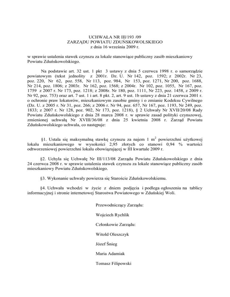 UCHWAŁA NR III/193 /09 ZARZĄDU POWIATU ZDUŃSKOWOLSKIEGO z dnia 16 września 2009 r. w sprawie ustalenia stawek czynszu za lokale stanowiące publiczny zasób mieszkaniowy Powiatu Zduńskowolskiego. Na podstawie art. 32 ust. 1 pkt 3 ustawy z dnia 5 czerwca 1998 r. o samorządzie powiatowym (tekst jednolity z 2001r. Dz. U. Nr 142, poz. 1592; z 2002r. Nr 23, poz. 220, Nr 62, poz. 558, Nr 113, poz. 984, Nr 153, poz. 1271, Nr 200, poz. 1688, Nr 214, poz. 1806; z 2003r. Nr 162, poz. 1568; z 2004r. Nr 102, poz. 1055, Nr 167, poz. 1759 z 2007 r. Nr 173, poz. 1218; z 2008r. Nr 180, poz. 1111, Nr 223, poz. 1458, z 2009 r. Nr 92, poz. 753) oraz art. 7 ust. 1 i art. 8 pkt. 2, art. 9 ust. 1b ustawy z dnia 21 czerwca 2001 r. o ochronie praw lokatorów, mieszkaniowym zasobie gminy i o zmianie Kodeksu Cywilnego (Dz. U. z 2005 r. Nr 31, poz. 266; z 2006 r. Nr 94, poz. 657, Nr 167, poz. 1193, Nr 249, poz. 1833; z 2007 r. Nr 128, poz. 902, Nr 173, poz. 1218), § 2 Uchwały Nr XVII/20/08 Rady Powiatu Zduńskowolskiego z dnia 28 marca 2008 r. w sprawie zasad polityki czynszowej, zmienionej uchwałą Nr XVIII/36/08 z dnia 25 kwietnia 2008 r. Zarząd Powiatu Zduńskowolskiego uchwala, co następuje: §1. Ustala się maksymalną stawkę czynszu za najem 1 m2 powierzchni użytkowej lokalu mieszkaniowego w wysokości 2,95 złotych co stanowi 0,94 % wartości odtworzeniowej powierzchni lokalu obowiązującej w III kwartale 2009 r. §2. Uchyla się Uchwałę Nr III/113/08 Zarządu Powiatu Zduńskowolskiego z dnia 24 czerwca 2008 r. w sprawie ustalenia stawek czynszu za lokale stanowiące publiczny zasób mieszkaniowy Powiatu Zduńskowolskiego. §3. Wykonanie uchwały powierza się Staroście Zduńskowolskiemu. §4. Uchwała wchodzi w życie z dniem podjęcia i podlega ogłoszeniu na tablicy informacyjnej i stronie internetowej Starostwa Powiatowego w Zduńskiej Woli. Przewodniczący Zarządu: Wojciech Rychlik Członkowie Zarządu: Witold Oleszczyk Józef Śnieg Maria Adamiak Tomasz Filipowski