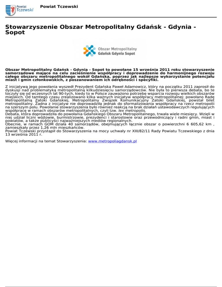 Powiat Tczewski Stowarzyszenie Obszar Metropolitalny Gdańsk - Gdynia Sopot Obszar Metropolitalny Gdańsk - Gdynia - Sopot to powołane 15 września 2011 roku stowarzyszenie samorządowe mające na celu zacieśnienie współpracy i doprowadzenie do harmonijnego rozwoju całego obszaru metropolitalnego wokół Gdańska, poprzez jak najlepsze wykorzystanie potencjału miast i gmin członkowskich, z poszanowaniem ich odrębności i specyfiki. Z inicjatywą jego powołania wyszedł Prezydent Gdańska Paweł Adamowicz, który na początku 2011 zaprosił do dyskusji nad problematyką metropolitalną kilkudziesięciu samorządowców. Nie była to pierwsza debata, bo te toczyły się od wczesnych lat 90-tych, kiedy to w Polsce zauważono potrzebę wsparcia rozwoju wielkich obszarów miejskich. Od tamtego czasu zrealizowano kilka ważnych inicjatyw współpracy metropolitalnej: powołano Radę Metropolitalną Zatoki Gdańskiej, Metropolitalny Związek Komunikacyjny Zatoki Gdańskiej, powstał bilet metropolitalny. Żadna z inicjatyw nie doprowadziła jednak do sformalizowania współpracy na rzecz metropolii na szerszym polu. Powołanie stowarzyszenia było również reakcją na brak działań ustawodawczych regulujących współpracę w ramach obszarów metropolitalnych, czyli tzw. lex metropolis. Debata, która doprowadziła do powołania Gdańskiego Obszaru Metropolitalnego, trwała wiele miesięcy. Wzięli w niej udział liczni wójtowie, burmistrzowie, prezydenci i starostowie oraz przewodniczący i radni gmin, miast i powiatów, a także publicyści najważniejszych mediów regionalnych. Obecnie, w ramach GOM działa 40 samorządów, obejmujących łącznie obszar o powierzchni 6 605,62 km , zamieszkały przez 1,26 mln mieszkańców. Powiat Tczewski przystąpił do Stowarzyszenia na mocy uchwały nr XIII/82/11 Rady Powiatu Tczewskiego z dnia 13 września 2011 r. Więcej informacji na temat Stowarzyszenia: www.metropoliagdansk.pl Powered by TCPDF (www.tcpdf.org)