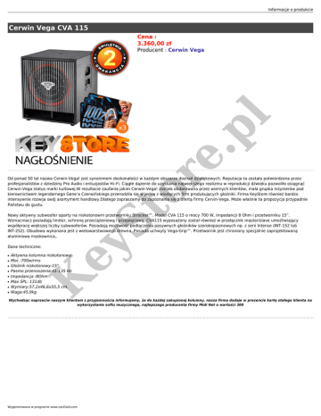 Informacje o produkcie Cerwin Vega CVA 115 Cena : 3.360,00 zł or e. pl Producent : Cerwin Vega St Od ponad 50 lat nazwa Cerwin-Vega! jest synonimem doskonałości w każdym obszarze doznań dźwiękowych. Reputacja ta została potwierdzona przez profesjonalistów z dziedziny Pro Audio i entuzjastów Hi–Fi. Ciągłe dążenie do uzyskania największego realizmu w reprodukcji dźwięku pozwoliło osiągnąć Cerwin-Vega status marki kultowej.W rezultacie zaufania jakim Cerwin-Vega! została obdarowana przez wiernych klientów, mała grupka inżynierów pod kierownictwem legendarnego Gene’a Czerwińskiego przerodziła się w jedną z wiodących firm produkujących głośniki. Firma KeyStore również bardzo intensywnie rozwija swój asortyment handlowy.Dlatego zapraszamy do zapoznania się z ofertą firmy Cervin-Vega. Może właśnie ta propozycja przypadnie Państwu do gustu. Dane techniczne: ● ● ● ● ● ● ● Aktywna kolumna niskotonowa Moc :700w/rms Głośnik niskotonowy:15'' Pasmo przenoszenia:41-135 Hz Impedancja :8Ohm Max SPL: 131db Wymiary:57,2x46,6x55,5 cm. Waga:45,9kg K ● ey Nowy aktywny subwoofer oparty na niskotonowm przetworniku Strocker™. Model CVA 115 o mocy 700 W, impedancji 8 Ohm i przetworniku 15”. Wzmacniacz posiadają limiter, ochronę przeciążeniową i przepięciową. CVA115 wyposażony został również w przełącznik master/slave umożliwiający współpracę większej liczby subwooferów. Posiadają możliwość podłączenia pasywnych głośników szerokopasmowych np. z serii Intense (INT-152 lub INT-252). Obudowa wykonana jest z wielowarstwowego drewna. Posiada uchwyty Vega-Grip™. Przetwornik jest chroniony specjalnie zaprojektowaną aluminiowa maskownica,. Wychodząc naprzeciw naszym klientom z przyjemnością informujemy, że do każdej zakupionej kolumny, nasza firma dodaje w prezencie kartę stałego klienta na wykorzystanie softu muzycznego, najlepszego producenta firmy Midi Net o wartości 300 Wygenerowano w programie www.oscGold.com