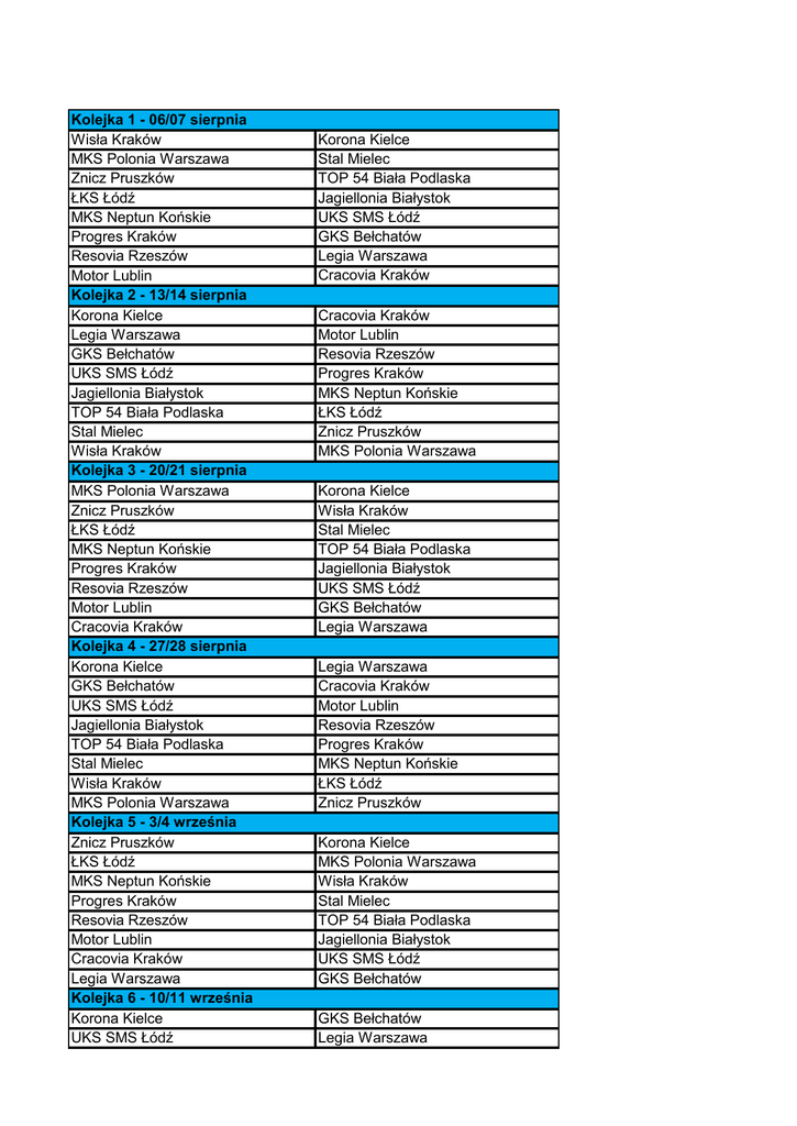 Kolejka 1 - 06/07 sierpnia Wisła Kraków MKS Polonia Warszawa Znicz Pruszków ŁKS Łódź MKS Neptun Końskie Progres Kraków Resovia Rzeszów Motor Lublin Kolejka 2 - 13/14 sierpnia Korona Kielce Legia Warszawa GKS Bełchatów UKS SMS Łódź Jagiellonia Białystok TOP 54 Biała Podlaska Stal Mielec Wisła Kraków Kolejka 3 - 20/21 sierpnia MKS Polonia Warszawa Znicz Pruszków ŁKS Łódź MKS Neptun Końskie Progres Kraków Resovia Rzeszów Motor Lublin Cracovia Kraków Kolejka 4 - 27/28 sierpnia Korona Kielce GKS Bełchatów UKS SMS Łódź Jagiellonia Białystok TOP 54 Biała Podlaska Stal Mielec Wisła Kraków MKS Polonia Warszawa Kolejka 5 - 3/4 września Znicz Pruszków ŁKS Łódź MKS Neptun Końskie Progres Kraków Resovia Rzeszów Motor Lublin Cracovia Kraków Legia Warszawa Kolejka 6 - 10/11 września Korona Kielce UKS SMS Łódź Korona Kielce Stal Mielec TOP 54 Biała Podlaska Jagiellonia Białystok UKS SMS Łódź GKS Bełchatów Legia Warszawa Cracovia Kraków Cracovia Kraków Motor Lublin Resovia Rzeszów Progres Kraków MKS Neptun Końskie ŁKS Łódź Znicz Pruszków MKS Polonia Warszawa Korona Kielce Wisła Kraków Stal Mielec TOP 54 Biała Podlaska Jagiellonia Białystok UKS SMS Łódź GKS Bełchatów Legia Warszawa Legia Warszawa Cracovia Kraków Motor Lublin Resovia Rzeszów Progres Kraków MKS Neptun Końskie ŁKS Łódź Znicz Pruszków Korona Kielce MKS Polonia Warszawa Wisła Kraków Stal Mielec TOP 54 Biała Podlaska Jagiellonia Białystok UKS SMS Łódź GKS Bełchatów GKS Bełchatów Legia Warszawa Jagiellonia Białystok TOP 54 Biała Podlaska Stal Mielec Wisła Kraków MKS Polonia Warszawa Znicz Pruszków Kolejka 7 - 17/18 września ŁKS Łódź MKS Neptun Końskie Progres Kraków Resovia Rzeszów Motor Lublin Cracovia Kraków Legia Warszawa GKS Bełchatów Kolejka 8 - 24/25 września Korona Kielce Jagiellonia Białystok TOP 54 Biała Podlaska Stal Mielec Wisła Kraków MKS Polonia Warszawa Znicz Pruszków ŁKS Łódź Kolejka 9 - 1/2 października MKS Neptun Końskie Progres Kraków Resovia Rzeszów Motor Lublin Cracovia Kraków Legia Warszawa GKS Bełchatów UKS SMS Łódź Kolejka 10 - 8/9 października Korona Kielce TOP 54 Biała Podlaska Stal Mielec Wisła Kraków MKS Polonia Warszawa Znicz Pruszków ŁKS Łódź MKS Neptun Końskie Kolejka 11 - 15/16 października Progres Kraków Resovia Rzeszów Motor Lublin Cracovia Kraków Legia Warszawa GKS Bełchatów UKS SMS Łódź Cracovia Kraków Motor Lublin Resovia Rzeszów Progres Kraków MKS Neptun Końskie ŁKS Łódź Korona Kielce Znicz Pruszków MKS Polonia Warszawa Wisła Kraków Stal Mielec TOP 54 Biała Podlaska Jagiellonia Białystok UKS SMS Łódź UKS SMS Łódź GKS Bełchatów Legia Warszawa Cracovia Kraków Motor Lublin Resovia Rzeszów Progres Kraków MKS Neptun Końskie Korona Kielce ŁKS Łódź Znicz Pruszków MKS Polonia Warszawa Wisła Kraków Stal Mielec TOP 54 Biała Podlaska Jagiellonia Białystok Jagiellonia Białystok UKS SMS Łódź GKS Bełchatów Legia Warszawa Cracovia Kraków Motor Lublin Resovia Rzeszów Progres Kraków Korona Kielce MKS Neptun Końskie ŁKS Łódź Znicz Pruszków MKS Polonia Warszawa Wisła Kraków Stal Mielec Jagiellonia Białystok Kolejka 12 - 22/23 października Korona Kielce Stal Mielec Wisła Kraków MKS Polonia Warszawa Znicz Pruszków ŁKS Łódź MKS Neptun Końskie Progres Kraków Kolejka 13 - 29/30 października Resovia Rzeszów Motor Lublin Cracovia Kraków Legia Warszawa GKS Bełchatów UKS SMS Łódź Jagiellonia Białystok TOP 54 Biała Podlaska Kolejka 14 - 05/06 listopada Korona Kielce Wisła Kraków MKS Polonia Warszawa Znicz Pruszków ŁKS Łódź MKS Neptun Końskie Progres Kraków Resovia Rzeszów Kolejka 15 - 12/13 listopada Motor Lublin Cracovia Kraków Legia Warszawa GKS Bełchatów UKS SMS Łódź Jagiellonia Białystok TOP 54 Biała Podlaska Stal Mielec Kolejka 16 - 19/20 listopada Korona Kielce Stal Mielec TOP 54 Biała Podlaska Jagiellonia Białystok UKS SMS Łódź GKS Bełchatów Legia Warszawa Cracovia Kraków Kolejka 17 - 26/27 listopada Cracovia Kraków Motor Lublin Resovia Rzeszów TOP 54 Biała Podlaska TOP 54 Biała Podlaska Jagiellonia Białystok UKS SMS Łódź GKS Bełchatów Legia Warszawa Cracovia Kraków Motor Lublin Resovia Rzeszów Korona Kielce Progres Kraków MKS Neptun Końskie ŁKS Łódź Znicz Pruszków MKS Polonia Warszawa Wisła Kraków Stal Mielec Stal Mielec TOP 54 Biała Podlaska Jagiellonia Białystok UKS SMS Łódź GKS Bełchatów Legia Warszawa Cracovia Kraków Motor Lublin Korona Kielce Resovia Rzeszów Progres Kraków MKS Neptun Końskie ŁKS Łódź Znicz Pruszków MKS Polonia Warszawa Wisła Kraków Wisła Kraków MKS Polonia Warszawa Znicz Pruszków ŁKS Łódź MKS Neptun Końskie Progres Kraków Resovia Rzeszów Motor Lublin Korona Kielce Legia Warszawa GKS Bełchatów Progres Kraków MKS Neptun Końskie ŁKS Łódź Znicz Pruszków MKS Polonia Warszawa UKS SMS Łódź Jagiellonia Białystok TOP 54 Biała Podlaska Stal Mielec Wisła Kraków