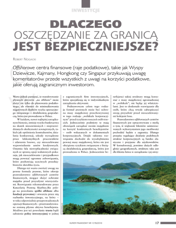 INWESTYCJE Dlaczego oszczędzanie za granicą jest bezpieczniejsze? Robert Nogacki O W Offshorowe centra finansowe (raje podatkowe), takie jak Wyspy Dziewicze, Kajmany, Hongkong czy Singapur przykuwają uwagę komentatorów przede wszystkich z uwagi na korzyści podatkowe, jakie oferują zagranicznym inwestorom. z zagranicznych firm inwestycyjnych, które specjalizują się w indywidualnym zarządzaniu aktywami. Podstawowym celem tego rodzaju formuł prawnych może być ochrona masy majątkowej przechowywanej w tego rodzaju „wehikule korporacyjnym” przed ryzykiem roszczeń osób trzecich. Jednocześnie podmioty te mają obowiązek zarządzać swoim majątkiem na korzyść konkretnych beneficjentów – osób wskazanych w dokumentach korporacyjnych. Dzięki takiemu rozwiązaniu dochodzi do wyodrębnienia pewnej masy majątkowej, która nie jest obciążona ryzykiem związanym z bieżącą działalnością gospodarczą, która jest prowadzona w Polsce. Jednocześnie be- neficjenci takiej struktury mogą korzystać z masy majątkowej zgromadzonej w „wehikule”, nie będąc jej właścicielami. Jest to doskonałe rozwiązanie dla osób, które chcą trwale zabezpieczyć swoją przyszłość przed nieoczekiwanymi kolejami losu. Prawodawstwo offshorowych centrów finansowych jest opracowywane z myślą o tym, iż większość klientów zainteresowanych wykorzystaniem jego możliwości pochodzić będzie z zagranicy. Dlatego przepisy regulujące działanie podobnych struktur korporacyjnych są bardzo elastyczne i przyjazne dla użytkowników. W konsekwencji, pomimo dużych odległości geograficznych, struktura taka jest dla klienta łatwa w zarządzaniu i jej utrzy- Fot. www.fotolia.com Warto jednak pamiętać, że transferowanie płynnych aktywów „na offshore” może służyć nie tylko do planowania podatkowego, ale również do minimalizowania negatywnych skutków ryzyka operacyjnego związanego z działalnością gospodarczą, która jest prowadzona w Polsce. W każdym, nawet najlepiej zarządzanym biznesie, istnieje ryzyko bankructwa na skutek niezawinionych i nieprzewidzianych okoliczności zewnętrznych, takich jak opóźnienia kontrahentów, działania konkurencji, szkody wyrządzone przez lekkomyślnych pracowników i zdarzenia losowe, czy nieoczekiwane wypowiedzenie umów kredytowych. Ostatnia fala niewypłacalności związanych ze sprawą opcji walutowych pokazuje, jak nieoczekiwanie i przypadkowo mogą powstać ogromne zobowiązania, które pozbawiają uczciwych przedsiębiorców dorobku życia. Dlatego też warto zwrócić uwagę na pewne formuły prawne, które oferuje prawodawstwo offshorowych centrów finansowych, mogące służyć ochronie majątku przed przyszłymi wierzycielami. Rozwiązanie rekomendowane przez Kancelarię Prawną Skarbiec.Biz polega na powołaniu spółki offshore albo fundacji prywatnej i otwarciu przez nią rachunku inwestycyjnego, na który – w toku odpowiednio przeprowadzonych operacji finansowych – przetransferowane zostaną płynne aktywa beneficjenta. Możliwe jest też powołanie trustu bądź założenie polisy inwestycyjnej w jednej KURIER FINANSOWY NR 1(19)/2010 17 Fot. www.fotolia.com INWESTYCJE manie wymaga od niego nie większych formalności niż utrzymanie spółki z ograniczoną odpowiedzialności w Polsce. Należy też pamiętać, iż offshorowa struktura korporacyjna z siedzibą w odległej, egzotycznej jurysdykcji wcale nie musi lokować swojego majątku w kraju gdzie znajduje się jej siedziba. Równie dobrze może korzystać z usług bankowości w Szwajcarii, Austrii, Liechtensteinie, Monako czy na Jersey, gdzie klienci posługujący się strukturami offshore stanowią dla private bankierów chleb powszedni. Łącząc offshorowe struktury korporacyjne z europejską bankowością, klient nie odczuwa więc w praktyce żadnych ryzyk związanych z odległościami geograficznymi, różnicami kulturowymi czy zmianami politycznymi. Konkretne korzyści Przeniesienie płynnych aktywów do zagranicznego banku bądź firmy inwestycyjnej pozwala osiągnąć między innymi następujące korzyści: 1) minimalizację ryzyk związanych z przypadkami bezprawia urzędniczego Jak opisuje w jednym z wywiadów Roman Kluska: „Urzędnicy nie ponoszą odpowiedzialności za samowolne decyzje.Jeśli firma odwoła się do sądu, to zwykle nic nie osiągnie. Bo na wyrok musi czekać lata. Może splajtować, zanim wygra (...) Kiedy oskarżenie urzędu skarbowego kończy się zajęciem majątku, 18 człowiek staje się całkowicie bezbronny. Może po to zajmuje się ten majątek, aby nie było pieniędzy na obronę? Dokładnie tak. Dlatego urzędnik może iść w ciemno. Potem przychodzi komornik i zabiera wszystko, co ma jakąkolwiek wartość. Podatnik nie ma z czego żyć. Trudno się dziwić, że w takiej sytuacji ktoś może całkowicie się załamać”. O tym, że przykład Optimusa nie jest jedyny w swoim rodzaju, świadczyć może choćby niedawne orzeczenie wrocławskiego sądu okręgowego, który zobowiązał Skarb Państwa do zapłaty funduszowi MCI Management 38,521 mln zł odszkodowania za straty poniesione w wyniku upadku spółki JTT, której udziałowcem był MCI Management. Sprawa ciągnęła się od grudnia 1999 r., gdy inspektor kontroli skarbowej błędnie uznał, że JTT ma zapłacić 10,5 mln zł podatku VAT i kar. Jednak nie każdy biznesmen ma wystarczające zasoby finansowe, aby „przetrwać” konieczność zapłaty fikcyjnej zaległości podatkowej, a następnie prowadzić dziesięcioletnią kampanię wojenną w sądach i urzędach o wyrównanie wyrządzonej szkody... Oczywiście, transfer aktywów za granicę nie uchyla możliwości dochodzenia przez Skarb Państwa słusznych roszczeń względem podatników czy sprawców przestępstw. Jednakże przed zagranicznymi sądami dochodzi do zrównania szans. KURIER FINANSOWY NR 1(19)/2010 Polski urzędnik nie jest w stanie prowadzić tam sporu z obywatelem z pozycji siły, al