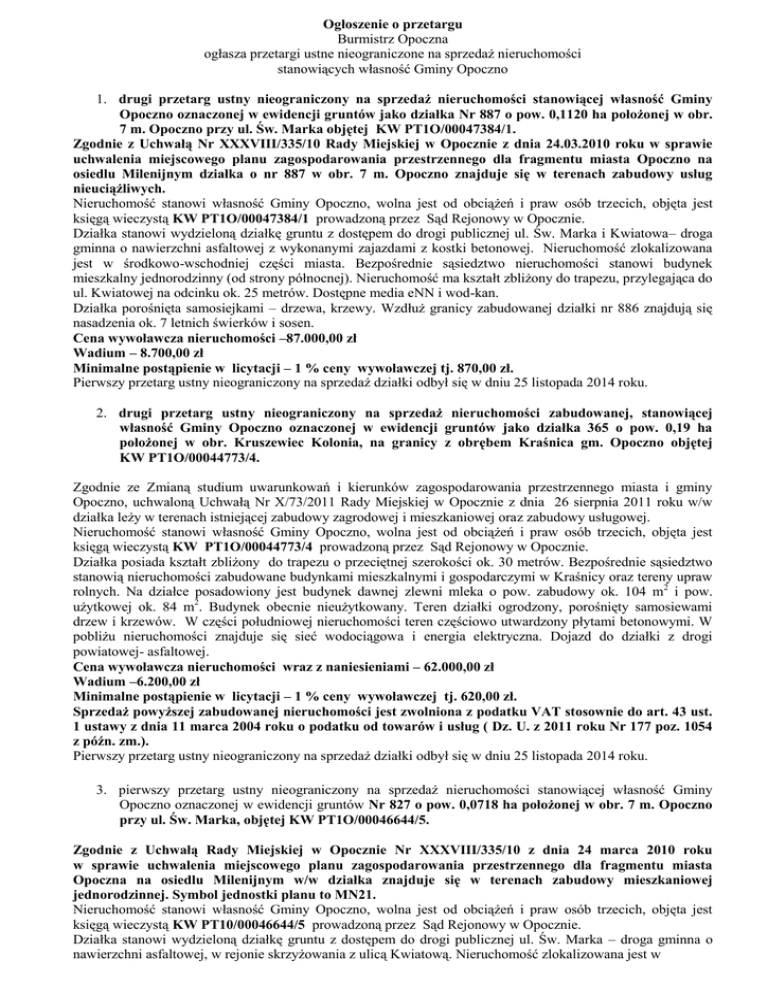 Ogłoszenie o przetargu Burmistrz Opoczna ogłasza przetargi ustne nieograniczone na sprzedaż nieruchomości stanowiących własność Gminy Opoczno 1. drugi przetarg ustny nieograniczony na sprzedaż nieruchomości stanowiącej własność Gminy Opoczno oznaczonej w ewidencji gruntów jako działka Nr 887 o pow. 0,1120 ha położonej w obr. 7 m. Opoczno przy ul. Św. Marka objętej KW PT1O/00047384/1. Zgodnie z Uchwałą Nr XXXVIII/335/10 Rady Miejskiej w Opocznie z dnia 24.03.2010 roku w sprawie uchwalenia miejscowego planu zagospodarowania przestrzennego dla fragmentu miasta Opoczno na osiedlu Milenijnym działka o nr 887 w obr. 7 m. Opoczno znajduje się w terenach zabudowy usług nieuciążliwych. Nieruchomość stanowi własność Gminy Opoczno, wolna jest od obciążeń i praw osób trzecich, objęta jest księgą wieczystą KW PT1O/00047384/1 prowadzoną przez Sąd Rejonowy w Opocznie. Działka stanowi wydzieloną działkę gruntu z dostępem do drogi publicznej ul. Św. Marka i Kwiatowa– droga gminna o nawierzchni asfaltowej z wykonanymi zajazdami z kostki betonowej. Nieruchomość zlokalizowana jest w środkowo-wschodniej części miasta. Bezpośrednie sąsiedztwo nieruchomości stanowi budynek mieszkalny jednorodzinny (od strony północnej). Nieruchomość ma kształt zbliżony do trapezu, przylegająca do ul. Kwiatowej na odcinku ok. 25 metrów. Dostępne media eNN i wod-kan. Działka porośnięta samosiejkami – drzewa, krzewy. Wzdłuż granicy zabudowanej działki nr 886 znajdują się nasadzenia ok. 7 letnich świerków i sosen. Cena wywoławcza nieruchomości –87.000,00 zł Wadium – 8.700,00 zł Minimalne postąpienie w licytacji – 1 % ceny wywoławczej tj. 870,00 zł. Pierwszy przetarg ustny nieograniczony na sprzedaż działki odbył się w dniu 25 listopada 2014 roku. 2. drugi przetarg ustny nieograniczony na sprzedaż nieruchomości zabudowanej, stanowiącej własność Gminy Opoczno oznaczonej w ewidencji gruntów jako działka 365 o pow. 0,19 ha położonej w obr. Kruszewiec Kolonia, na granicy z obrębem Kraśnica gm. Opoczno objętej KW PT1O/00044773/4. Zgodnie ze Zmianą studium uwarunkowań i kierunków zagospodarowania przestrzennego miasta i gminy Opoczno, uchwaloną Uchwałą Nr X/73/2011 Rady Miejskiej w Opocznie z dnia 26 sierpnia 2011 roku w/w działka leży w terenach istniejącej zabudowy zagrodowej i mieszkaniowej oraz zabudowy usługowej. Nieruchomość stanowi własność Gminy Opoczno, wolna jest od obciążeń i praw osób trzecich, objęta jest księgą wieczystą KW PT1O/00044773/4 prowadzoną przez Sąd Rejonowy w Opocznie. Działka posiada kształt zbliżony do trapezu o przeciętnej szerokości ok. 30 metrów. Bezpośrednie sąsiedztwo stanowią nieruchomości zabudowane budynkami mieszkalnymi i gospodarczymi w Kraśnicy oraz tereny upraw rolnych. Na działce posadowiony jest budynek dawnej zlewni mleka o pow. zabudowy ok. 104 m2 i pow. użytkowej ok. 84 m2. Budynek obecnie nieużytkowany. Teren działki ogrodzony, porośnięty samosiewami drzew i krzewów. W części południowej nieruchomości teren częściowo utwardzony płytami betonowymi. W pobliżu nieruchomości znajduje się sieć wodociągowa i energia elektryczna. Dojazd do działki z drogi powiatowej- asfaltowej. Cena wywoławcza nieruchomości wraz z naniesieniami – 62.000,00 zł Wadium –6.200,00 zł Minimalne postąpienie w licytacji – 1 % ceny wywoławczej tj. 620,00 zł. Sprzedaż powyższej zabudowanej nieruchomości jest zwolniona z podatku VAT stosownie do art. 43 ust. 1 ustawy z dnia 11 marca 2004 roku o podatku od towarów i usług ( Dz. U. z 2011 roku Nr 177 poz. 1054 z późn. zm.). Pierwszy przetarg ustny nieograniczony na sprzedaż działki odbył się w dniu 25 listopada 2014 roku. 3. pierwszy przetarg ustny nieograniczony na sprzedaż nieruchomości stanowiącej własność Gminy Opoczno oznaczonej w ewidencji gruntów Nr 827 o pow. 0,0718 ha położonej w obr. 7 m. Opoczno przy ul. Św. Marka, objętej KW PT1O/00046644/5. Zgodnie z Uchwałą Rady Miejskiej w Opocznie Nr XXXVIII/335/10 z dnia 24 marca 2010 roku w sprawie uchwalenia miejscowego planu zagospodarowania przestrzennego dla fragmentu miasta Opoczna na osiedlu Milenijnym w/w działka znajduje się w terenach zabudowy mieszkaniowej jednorodzinnej. Symbol jednostki planu to MN21. Nieruchomość stanowi własność Gminy Opoczno, wolna jest od obciążeń i praw osób trzecich, objęta jest księgą wieczystą KW PT10/00046644/5 prowadzoną przez Sąd Rejonowy w Opocznie. Działka stanowi wydzieloną działkę gruntu z dostępem do drogi publicznej ul. Św. Marka – droga gminna o nawierzchni asfaltowej, w rejonie skrzyżowania z ulicą Kwiatową. Nieruchomość zlokalizowana jest w środkowo-wschodniej części miasta, w południowej części osiedla Milenijnego. Bezpośrednie sąsiedztwo nieruchomości stanowią podobne nieruchomości niezabudowane. Nieruchomość przylega do ul. Św. Marka na odcinku ok. 18 m. W części wewnętrznej działka ma szerokość ok. 30 m. Głębokość działki ok. 30 m. Dostęp do sieci uzbrojenia jest niczym nieutrudniony – w ul. Św. Marka. Działka porośnięta drzewami owocowymi nie posiadającymi wartości gospodarczej oraz samosiejkami drzew i krzewów. Cena wywoławcza nieruchomości –52.300,00 zł Wadium – 5.230,00 zł Minimalne postąpienie w licytacji – 1 % ceny wywoławczej z zaokrągleniem w górę do pełnych dziesiątek złotych tj. 530,00 zł. Przetargi na sprzedaż wymienionych wyżej nieruchomości odbędą się w Urzędzie Miejskim w Opocznie ul. Staromiejska 6 Wydział Rolnictwa i Gospodarki Gruntami budynek E w dniu 31 marca 2015 roku. poz. 1 – godzina 10.30 poz. 2 – godzina 11.00 poz. 3 – godzina 11.30 Warunkiem przystąpienia do przetargu jest: - dokonanie wpłaty wadium w pieniądzu w kasie Urzędu Miejskiego lub na konto Urzędu Miejskiego – Bank BPH Kraków 14 1060 0076 0000 3310 0019 2236 do dnia 25 marca 2015 roku. Za 