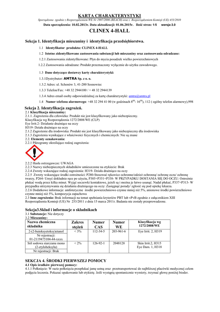 KARTA CHARAKTERYSTYKI Sporządzona zgodnie z Rozporządzeniem WE Nr 1907/2006 (REACH) oraz z Rozporządzeniem Komisji (UE) 453/2010 Data sporządzenia: 10.02.2013r. Data aktualizacji: 01.06.2015r. Ilość stron: 1/5 wersja:3.0 CLINEX 4-HALL Sekcja 1. Identyfikacja mieszaniny i identyfikacja przedsiębiorstwa. 1.1 Identyfikator produktu: CLINEX 4-HALL 1.2 Istotne zidentyfikowane zastosowania substancji lub mieszaniny oraz zastosowania odradzane: 1.2.1 Zastosowania zidentyfikowane: Płyn do mycia posadzek wielko powierzchniowych 1.2.2 Zastosowania odradzane: Produkt przeznaczony wyłącznie do użytku zawodowego. 1.3 Dane dotyczące dostawcy karty charakterystyki: 1.3.1Dystrybutor: AMTRA Sp. z o. o. 1.3.2 Adres: ul. Schonów 3, 41-200 Sosnowiec 1.3.3 Telefon/Fax: +48 32 2944100 / + 48 32 2944139 1.3.4 Adres email osoby odpowiedzialnej za kartę charakterystyki: [email protected] 1.4 Numer telefonu alarmowego: +48 32 294 41 00 (w godzinach 800- 1600), 112 ( ogólny telefon alarmowy),998 Sekcja 2. Identyfikacja zagrożeń. 2.1 Klasyfikacja mieszaniny: 2.1.1. Zagrożenia dla człowieka: Produkt nie jest klasyfikowany jako niebezpieczny. Klasyfikacja wg Rozporządzenia 1272/2008/WE (CLP) Eye Irrit.2- Działanie drażniące na oczy H319- Działa drażniąco na oczy 2.1.2 Zagrożenie dla środowiska: Produkt nie jest klasyfikowany jako niebezpieczny dla środowiska 2.1.3 Zagrożenia wynikające z właściwości fizycznych i chemicznych: Nie są znane 2.2. Elementy oznakowania: 2.2.1 Piktogramy określające rodzaj zagrożenia: 2.2.2 Hasła ostrzegawcze: UWAGA 2.2.3 Nazwy niebezpiecznych składników umieszczone na etykiecie: Brak 2.2.4 Zwroty wskazujące rodzaj zagrożenia: H319- Działa drażniąco na oczy 2.2.5 Zwroty wskazujące środki ostrożności: P280-Stosować rękawice ochronne/odzież ochronną/ ochronę oczu/ ochronę twarzy, P264- Umyć dokładnie ręce po użyciu, P305+P351+P338- W PRZYPADKU DOSTANIA SIĘ DO OCZU: Ostrożnie płukać wodą przez kilka minut. Wyjąć soczewki kontaktowe, jeżeli są i można je łatwo usunąć. Nadal płukać, P337+P313- W przypadku utrzymywania się działania drażniącego na oczy: Zasięgnąć porady/ zgłosić się pod opiekę lekarza. 2.2.6 Dodatkowe informacje: amfoteryczne środki powierzchniowo czynne mniej niż 5%, anionowe środki powierzchniowo czynne mniej niż 5%, kompozycja zapachowa 2.3 Inne zagrożenia: Brak informacji na temat spełniania kryteriów PBT lub vPvB zgodnie z załącznikiem XIII Rozporządzenia Komisji (UE) Nr 253/2011 z dnia 15 marca 2011r. Badania nie zostały przeprowadzone. Sekcja3.Skład i informacje o składnikach 3.1 Substancje: Nie dotyczy 3.2 Mieszaniny: Nazwa chemiczna składnika 2-(2-butoksyetoksy)etanol Nr rejestracji: 01-2119475104-44-xxxx Sól sodowa siarczanu mono (2-etyloheksylu) Nr rejestracji: Brak Zakres stężeń Numer CAS Numer WE Klasyfikacja wg 1272/2008/WE < 3% 112-34-5 203-961-6 Eye Irrit. 2, H319 < 2% 126-92-1 2048128 Skin Irrit.2, H315 Eye Dam. 1, H318 SEKCJA 4. ŚRODKI PIERWSZEJ POMOCY 4.1 Opis środków pierwszej pomocy: 4.1.1 Połknięcie: W razie połknięcia przepłukać jamę ustną oraz przetransportować do najbliższej placówki medycznej celem podjęcia leczenia. Pokazać opakowanie lub etykietę. Jeśli wystąpią spontanicznie wymioty, trzymać głowę poniżej bioder. KARTA CHARAKTERYSTYKI Sporządzona zgodnie z Rozporządzeniem WE Nr 1907/2006 (REACH) oraz z Rozporządzeniem Komisji (UE) 453/2010 Data sporządzenia: 10.02.2013r. Data aktualizacji: 01.06.2015r. Ilość stron: 2/5 wersja:3.0 CLINEX 4-HALL 4.1.2. Zatrucie inhalacyjne: Wynieść poszkodowanego z miejsca narażenia i zapewnić dostęp świeżego powietrza oraz spokój i odpoczynek. W przypadku dolegliwości (kaszel, wymioty, zawroty głowy, świszczący oddech) zapewnić pomoc lekarską. Nieprzytomnego ułożyć w pozycji bocznej. 4.1.3. Skażenie skóry: Zdjąć skażoną odzież. Skórę zmyć ciepłą wodą z mydłem. W razie wystąpienia podrażnienia skóry skontaktować się z lekarzem. 4.1.4.Skażenie oczu: Jeżeli poszkodowany nosi szkła kontaktowe niezwłocznie je wyjąć. Dokładnie przemyć oczy dużą ilością wody, wywijając powieki. Zapewnić pomoc okulisty. Uwaga: osoby narażone na skażenie oczu powinny być pouczone o konieczności i sposobie natychmiastowego płukania oczu 4.2 Najważniejsze ostre i opóźnione objawy oraz skutki narażenia: 4.2.1 Skażenie oczu: Może wystąpić podrażnienie, zaczerwienienie oraz łzawienie 4.2.2 Połknięcie: Mogą pojawić się mdłości, wymioty oraz ból brzucha 4.3 Wskazania dotyczące wszelkiej natychmiastowej pomocy lekarskiej i szczególnego postępowania z poszkodowanym: Nie dotyczy. Podjąć leczenie objawowe. SEKCJA 5. POSTĘPOWANIE W PRZYPADKU POŻARU 5.1 Środki gaśnicze: 5.1.1 Odpowiednie środki gaśnicze: Stosować powszechne środki gaśnicze; w zależności od otoczenia. 5.1.2 Niewłaściwe środki gaśnicze: Nie są znane. 5.2 Szczególne zagrożenia związane z mieszaniną: Nie są znane. Należy unikać wdychania produktów spalania. 5.3 Informacje dla straży pożarnej: Środki ochrony ogólnej typowe w przypadku pożaru. Nie należy przebywać w zagrożonej ogniem strefie bez odpowiedniego ubrania odpornego na chemikalia i aparatu do oddychania z niezależnym obiegiem powietrza. Zagrożone pożarem zbiorniki usunąć jeśli to możliwe i nie wiąże się z nadmiernym ryzykiem lub chłodzić rozpyloną wodą z odpowiedniej odległości. SEKCJA 6. POSTĘPOWANIE W PRZYPADKU NIEZAMIERZONEGO UWOLNIENIA DO ŚRODOWISKA 6.1 Indywidualne środki ostrożności, wyposażenie ochronne i procedury w sytuacjach awaryjnych: 6.1.1 Dla osób niezależących do personelu likwidującego skutki awarii: Ograniczyć dostęp osób postronnych do obszaru awarii do czasu usunięcia awarii. W przypadku dużych wycieków odizolować zagrożony obszar. Stosować środki ochrony indywidualnej. Unikać długotrwałego kontaktu ze skórą. Unikać kontaktu z oczami. P
