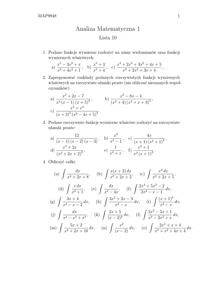 MAP9948 1 Analiza Matematyczna 1 Lista 10 1. Podane funkcje wymierne rozłożyć na sumy wielomianów oraz funkcji wymiernych właściwych: x5 − 3x2 + x x5 + 3 x4 + 2x3 + 3x2 + 4x + 5 a) 3 , b) , c) , x + 4x2 + 1 x5 + 4 x3 + 2x2 + 3x + 4 2. Zaproponować rozkłady podanych rzeczywistych funkcji wymiernych właściwych na rzeczywiste ułamki proste (nie obliczać nieznanych współczynników): x3 − 8x − 4 x2 + 2x − 7 , b) , x3 (x − 1) (x + 5)2 (x2 + 4) (x2 + x + 3)3 x4 + x3 c) . (x + 3)2 (x2 − 4x + 5)2 a) 3. Podane rzeczywiste funkcje wymierne właściwe rozłożyć na rzeczywiste ułamki proste: x2 4x 12 , b) 4 , c) , (x − 1) (x − 2) (x − 3) x −1 (x + 1) (x2 + 1)2 1 x2 + 1 x2 + 2x , e) , f) . d) x3 + x (x2 + 2x + 2)2 x3 (x + 1)2 a) 4. Obliczyć całki: Z Z Z x(x + 2) dx x2 dx dx , (b) , (c) , (a) x2 + 2x + 8 x2 + 2x + 2 x2 + 2x + 5 Z Z Z x dx dx 2x4 + 5x2 − 2 (d) , (e) , (f) dx, x3 + 1 x3 − 4x 2x3 − x − 1 Z Z Z 3x + 4 3x2 + 2x − 3 (x + 1)3 (g) dx, (h) dx, (i) dx, x2 − x − 2 x3 − x x2 − x Z Z Z dx 2x + 5 2x2 − 5x + 1 (j) , (k) dx, (l) dx, x4 − x3 + x2 (x − 2)2 x3 − 2x2 + x Z Z Z x2 2x2 + x + 4 5x + 2 (m) dx, (n) dx, (o) dx. x2 + 2x + 10 (x − 2) x3 + x2 + 4x + 4