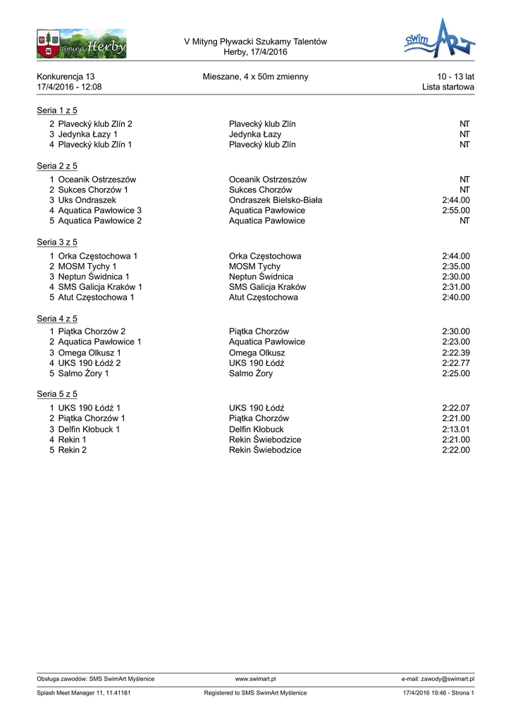 V Mityng Pływacki Szukamy Talentów Herby, 17/4/2016 Konkurencja 13 17/4/2016 - 12:08 Mieszane, 4 x 50m zmienny 10 - 13 lat Lista startowa Seria 1 z 5 2 Plavecký klub Zlín 2 3 Jedynka Łazy 1 4 Plavecký klub Zlín 1 Plavecký klub Zlín Jedynka Łazy Plavecký klub Zlín NT NT NT Seria 2 z 5 1 2 3 4 5 Oceanik Ostrzeszów Sukces Chorzów 1 Uks Ondraszek Aquatica Pawłowice 3 Aquatica Pawłowice 2 Oceanik Ostrzeszów Sukces Chorzów Ondraszek Bielsko-Biała Aquatica Pawłowice Aquatica Pawłowice NT NT 2:44.00 2:55.00 NT Orka Częstochowa 1 MOSM Tychy 1 Neptun Świdnica 1 SMS Galicja Kraków 1 Atut Częstochowa 1 Orka Częstochowa MOSM Tychy Neptun Świdnica SMS Galicja Kraków Atut Częstochowa 2:44.00 2:35.00 2:30.00 2:31.00 2:40.00 Seria 4 z 5 1 Piątka Chorzów 2 2 Aquatica Pawłowice 1 3 Omega Olkusz 1 4 UKS 190 Łódź 2 5 Salmo Żory 1 Piątka Chorzów Aquatica Pawłowice Omega Olkusz UKS 190 Łódź Salmo Żory 2:30.00 2:23.00 2:22.39 2:22.77 2:25.00 UKS 190 Łódź Piątka Chorzów Delfin Kłobuck Rekin Świebodzice Rekin Świebodzice 2:22.07 2:21.00 2:13.01 2:21.00 2:22.00 Seria 3 z 5 1 2 3 4 5 Seria 5 z 5 1 2 3 4 5 UKS 190 Łódź 1 Piątka Chorzów 1 Delfin Kłobuck 1 Rekin 1 Rekin 2 Obsługa zawodów: SMS SwimArt Myślenice Splash Meet Manager 11, 11.41181 www.swimart.pl e-mail: [email protected] Registered to SMS SwimArt Myślenice 17/4/2016 19:46 - Strona 1