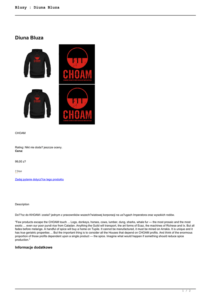 Bluzy : Diuna Bluza Diuna Bluza CHOAM Rating: Nikt nie doda? jeszcze oceny. Cena: 99,00 z? Zadaj pytanie dotycz?ce tego produktu Description Do??cz do KHOAM i zosta? jednym z pracowników wszech?wiatowej korporacji na us?ugach Imperatora oraz wysokich rodów. "Few products escape the CHOAM touch ... Logs, donkeys, horses, cows, lumber, dung, sharks, whale fur — the most prosaic and the most exotic ... even our poor pundi rice from Caladan. Anything the Guild will transport, the art forms of Ecaz, the machines of Richese and Ix. But all fades before melange. A handful of spice will buy a home on Tupile. It cannot be manufactured, it must be mined on Arrakis. It is unique and it has true geriatric properties ... But the important thing is to consider all the Houses that depend on CHOAM profits. And think of the enormous proportion of those profits dependent upon a single product — the spice. Imagine what would happen if something should reduce spice production." Informacje dodatkowe 1 / 2 Bluzy : Diuna Bluza ?redni czas dostawy oko?o 7 dni Dost?pne kolory: tylko czarny Zwroty i reklamacja Wed?ug regulaminu sklepu Dost?pno?? Na terenie Polski Dost?pne ?rodki p?atno?ci Przedp?ata na konto / p?atno?ci elektroniczne online 2 / 2 Powered by TCPDF (www.tcpdf.org)