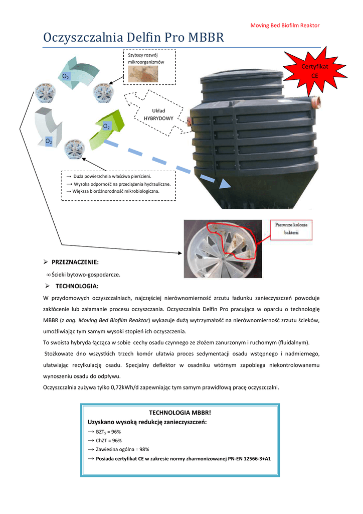 Moving Bed Biofilm Reaktor Oczyszczalnia Delfin Pro MBBR Szybszy rozwój mikroorganizmów Certyfikat CE Układ HYBRYDOWY → Duża powierzchnia właściwa pierścieni. → Wysoka odporność na przeciążenia hydrauliczne. → Większa bioróżnorodność mikrobiologiczna. PRZEZNACZENIE: • Ścieki bytowo-gospodarcze. TECHNOLOGIA: W przydomowych oczyszczalniach, najczęściej nierównomierność zrzutu ładunku zanieczyszczeń powoduje zakłócenie lub załamanie procesu oczyszczania. Oczyszczalnia Delfin Pro pracująca w oparciu o technologię MBBR (z ang. Moving Bed Biofilm Reaktor) wykazuje dużą wytrzymałość na nierównomierność zrzutu ścieków, umożliwiając tym samym wysoki stopień ich oczyszczenia. To swoista hybryda łącząca w sobie cechy osadu czynnego ze złożem zanurzonym i ruchomym (fluidalnym). Stożkowate dno wszystkich trzech komór ułatwia proces sedymentacji osadu wstępnego i nadmiernego, ułatwiając recylkulację osadu. Specjalny deflektor w osadniku wtórnym zapobiega niekontrolowanemu wynoszeniu osadu do odpływu. Oczyszczalnia zużywa tylko 0,72kWh/d zapewniając tym samym prawidłową pracę oczyszczalni. TECHNOLOGIA MBBR! Uzyskano wysoką redukcję zanieczyszczeń: → BZT5 = 96% → ChZT = 96% → Zawiesina ogólna = 98% → Posiada certyfikat CE w zakresie normy zharmonizowanej PN-EN 12566-3+A1