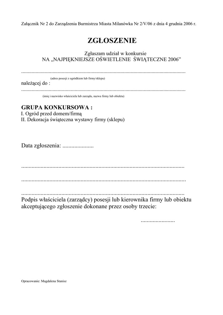 Załącznik Nr 2 do Zarządzenia Burmistrza Miasta Milanówka Nr 2/V/06 z dnia 4 grudnia 2006 r. ZGŁOSZENIE Zgłaszam udział w konkursie NA „NAJPIĘKNIEJSZE OŚWIETLENIE ŚWIĄTECZNE 2006” .............................................................................................................................. (adres posesji z ogródkiem lub firmy/sklepu) należącej do : .............................................................................................................................. (imię i nazwisko właściciela lub zarządu, nazwa firmy lub obiektu) GRUPA KONKURSOWA : I. Ogród przed domem/firmą II. Dekoracja świąteczna wystawy firmy (sklepu) Data zgłoszenia: ..................... .............................................................................................................. ............................................................................................................... .............................................................................................................. Podpis właściciela (zarządcy) posesji lub kierownika firmy lub obiektu akceptującego zgłoszenie dokonane przez osoby trzecie: ....................... Opracowanie: Magdalena Stanisz