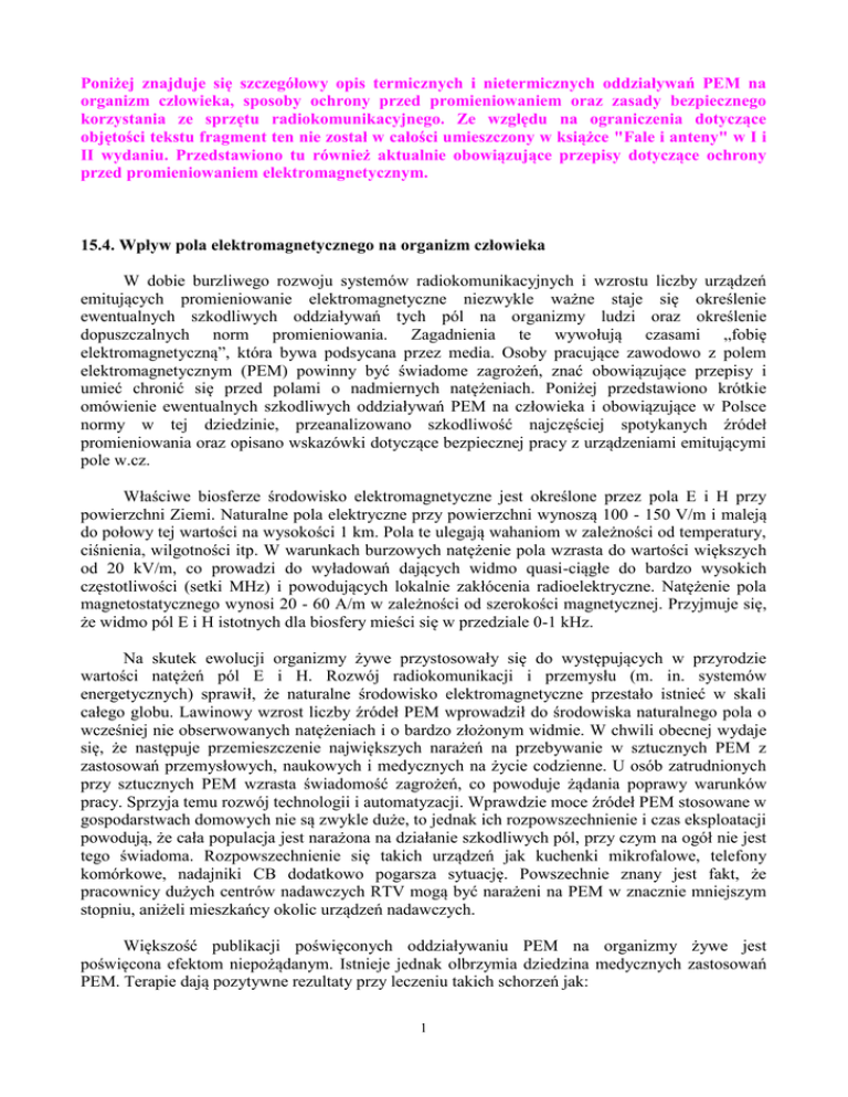 Poniżej znajduje się szczegółowy opis termicznych i nietermicznych oddziaływań PEM na organizm człowieka, sposoby ochrony przed promieniowaniem oraz zasady bezpiecznego korzystania ze sprzętu radiokomunikacyjnego. Ze względu na ograniczenia dotyczące objętości tekstu fragment ten nie został w całości umieszczony w książce "Fale i anteny" w I i II wydaniu. Przedstawiono tu również aktualnie obowiązujące przepisy dotyczące ochrony przed promieniowaniem elektromagnetycznym. 15.4. Wpływ pola elektromagnetycznego na organizm człowieka W dobie burzliwego rozwoju systemów radiokomunikacyjnych i wzrostu liczby urządzeń emitujących promieniowanie elektromagnetyczne niezwykle ważne staje się określenie ewentualnych szkodliwych oddziaływań tych pól na organizmy ludzi oraz określenie dopuszczalnych norm promieniowania. Zagadnienia te wywołują czasami „fobię elektromagnetyczną”, która bywa podsycana przez media. Osoby pracujące zawodowo z polem elektromagnetycznym (PEM) powinny być świadome zagrożeń, znać obowiązujące przepisy i umieć chronić się przed polami o nadmiernych natężeniach. Poniżej przedstawiono krótkie omówienie ewentualnych szkodliwych oddziaływań PEM na człowieka i obowiązujące w Polsce normy w tej dziedzinie, przeanalizowano szkodliwość najczęściej spotykanych źródeł promieniowania oraz opisano wskazówki dotyczące bezpiecznej pracy z urządzeniami emitującymi pole w.cz. Właściwe biosferze środowisko elektromagnetyczne jest określone przez pola E i H przy powierzchni Ziemi. Naturalne pola elektryczne przy powierzchni wynoszą 100 - 150 V/m i maleją do połowy tej wartości na wysokości 1 km. Pola te ulegają wahaniom w zależności od temperatury, ciśnienia, wilgotności itp. W warunkach burzowych natężenie pola wzrasta do wartości większych od 20 kV/m, co prowadzi do wyładowań dających widmo quasi-ciągłe do bardzo wysokich częstotliwości (setki MHz) i powodujących lokalnie zakłócenia radioelektryczne. Natężenie pola magnetostatycznego wynosi 20 - 60 A/m w zależności od szerokości magnetycznej. Przyjmuje się, że widmo pól E i H istotnych dla biosfery mieści się w przedziale 0-1 kHz. Na skutek ewolucji organizmy żywe przystosowały się do występujących w przyrodzie wartości natężeń pól E i H. Rozwój radiokomunikacji i przemysłu (m. in. systemów energetycznych) sprawił, że naturalne środowisko elektromagnetyczne przestało istnieć w skali całego globu. Lawinowy wzrost liczby źródeł PEM wprowadził do środowiska naturalnego pola o wcześniej nie obserwowanych natężeniach i o bardzo złożonym widmie. W chwili obecnej wydaje się, że następuje przemieszczenie największych narażeń na przebywanie w sztucznych PEM z zastosowań przemysłowych, naukowych i medycznych na życie codzienne. U osób zatrudnionych przy sztucznych PEM wzrasta świadomość zagrożeń, co powoduje żądania poprawy warunków pracy. Sprzyja temu rozwój technologii i automatyzacji. Wprawdzie moce źródeł PEM stosowane w gospodarstwach domowych nie są zwykle duże, to jednak ich rozpowszechnienie i czas eksploatacji powodują, że cała populacja jest narażona na działanie szkodliwych pól, przy czym na ogół nie jest tego świadoma. Rozpowszechnienie się takich urządzeń jak kuchenki mikrofalowe, telefony komórkowe, nadajniki CB dodatkowo pogarsza sytuację. Powszechnie znany jest fakt, że pracownicy dużych centrów nadawczych RTV mogą być narażeni na PEM w znacznie mniejszym stopniu, aniżeli mieszkańcy okolic urządzeń nadawczych. Większość publikacji poświęconych oddziaływaniu PEM na organizmy żywe jest poświęcona efektom niepożądanym. Istnieje jednak olbrzymia dziedzina medycznych zastosowań PEM. Terapie dają pozytywne rezultaty przy leczeniu takich schorzeń jak: 1 - oparzenia, owrzodzenia wewnętrzne i zewnętrzne, trudno gojące się rany, stany zapalne skóry, - ortopedia pooperacyjna i zachowawcza, leczenie pooperacyjne, choroby zwyrodnieniowe i reumatyczne, stany zapalne stawów i mięśni, rehabilitacja pourazowa, - choroby układu krążenia, - zaziębienia, choroby układu oddechowego, wyczerpania, zmiany pogody, - nerwobóle, migreny, choroby nerwowe i psychosomatyczne, stwardnienie rozsiane, - geriatria i dolegliwości okresu pokwitania, - medycyna sportowa, leczenie urazów, immunostymulacja, doping, - bezpłodność, choroby kobiece, - nowotwory. Leczenie za pomocą PEM powinno być jednak prowadzone przez specjalistów, a nie przygodnych lekarzy czy nawet hochsztaplerów liczących na ludzką naiwność. Należy w tym miejscu zaznaczyć, że nadmiar każdego oddziaływania korzystnego może dawać rezultaty niepożądane. Okazuje się też, że brak kontaktu z naturalnymi polami elektromagnetycznymi powoduje zbliżone objawy i dolegliwości jak oddziaływanie sztucznych PEM (m. in. zaburzenia snu, podwyższona pobudliwość, wzrost ciśnienia krwi czy zaburzenia świadomości). Istnieją także wykorzystania militarno-policyjne, np. system ADS (Active Denial System), wykorzystujący skoncentrowaną wiązkę mikrofal o częstotliwości 95 GHz do rozpraszania tłumów, zamieszek, zgrupowań żołnierzy. Wykorzystuje się tu oddziaływania termiczne – energia mikrofal wywołuje silny ból i zmusza człowieka do ucieczki poza wiązkę emitowaną z anteny. Zakres fal radiowych rozciąga się od bardzo niskich częstotliwości aż do 300 GHz. Fale z tego zakresu nie powodują jonizacji atomów. Ostatnio dużą uwagę naukowców zyskały badania nad falami o bardzo małych częstotliwościach (30 - 1000 Hz - zakres ELF). Ze względu na powszechność telefonii komórkowej od kilku lat prowadzone są intensywne badania nad zakresem mikrofalowym (450 - 2000 MHz). Ciało człowieka jest niejednorodne pod względem parametrów dielektrycznych ze względu na zmienną zawartość tłuszczu, białka, węglowodanów i elektrolitu (woda + sole) w zależn