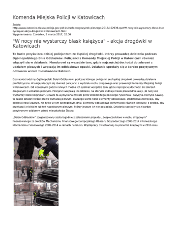 Komenda Miejska Policji w Katowicach Źródło: http://www.katowice.slaska.policja.gov.pl/k14/ruch-drogowy/rok-pieszego-2016/192939,quotW-nocy-nie-wystarczy-blask-ksie zycaquot-akcja-drogowki-w-Katowicach.html Wygenerowano: Czwartek, 9 marca 2017, 02:00 "W nocy nie wystarczy blask księżyca" - akcja drogówki w Katowicach To hasło przyświeca dzisiaj policjantom ze śląskiej drogówki, którzy prowadzą działania podczas Ogólnopolskiego Dnia Odblasków. Policjanci z Komendy Miejskiej Policji w Katowicach również włączyli się w działania. Mundurowi są wszędzie tam, gdzie najczęściej dochodzi do zdarzeń z udziałem pieszych i wręczają im odblaskowe opaski. Działania spotkały się z bardzo pozytywnym odbiorem wśród mieszkańców Katowic. Dzisiaj obchodzimy Ogólnopolski Dzień Odblasków, podczas którego policjanci ze śląskiej drogówki prowadzą działania profilaktyczne. W akcję właczyli się również policjanci z wydziału ruchu drogowego oraz prewencji Komendy Miejskiej Policji w Katowicach. Od wczesnych godzin rannych można ich spotkać wszędzie tam, gdzie najczęściej dochodzi do zdarzeń drogowych z udziałem pieszych. Policjanci wręczają im odblaski, na których widnieje hasło przewodnie akcji „W nocy nie wystarczy blask księżyca!”. Dewiza ta wymyślona została przez znakomitego polskiego rysownika i satyryka Henryka Sawkę. W czasie działań stróże prawa tłumaczą pieszym, dlaczego warto nosić elementy odblaskowe. Dodatkowo zachęcają, aby odblaski nosić zawsze, nie tylko w tym szczególnym dniu. Elementy odblaskowe otrzymywali również kierowcy, z prośbą, aby przekazali je bliskim lub też napotkanym pieszym, którzy jeszcze ich nie posiadają. Działania spotkały się z bardzo pozytywnym odbiorem wśród mieszkańców Śląska. „Dzień Odblasków” zorganizowany został zgodnie z założeniami projektu „Bezpieczeństwo w ruchu drogowym” finansowanego ze środków Mechanizmu Finansowego Europejskiego Obszaru Gospodarczego 2009-2014 i Norweskiego Mechanizmu Finansowego 2009-2014 w ramach Funduszu Współpracy Dwustronnej na poziomie krajowym w 2016 roku. Zainstaluj wtyczkę Flash, aby zobaczyć odtwarzacz. pobierz film - 21.93 MB Ocena: 0/5 (0) Tweetnij