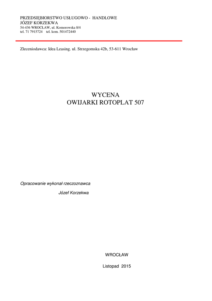 PRZEDSIĘBIORSTWO USŁUGOWO - HANDLOWE JÓZEF KORZEKWA 54-436 WROCŁAW, ul. Komorowska 8/4 tel. 71 7915724 tel. kom. 501472440 Zleceniodawca: Idea Leasing. ul. Strzegomska 42b, 53-611 Wrocław WYCENA OWIJARKI ROTOPLAT 507 Opracowanie wykonał rzeczoznawca Józef Korzekwa WROCŁAW Listopad 2015 2 WYCENA OWIJARKI ROTOPLAT 507 1.Podstawa formalna Podstawą niniejszego opracowania jest zlecenie firmy Idea Leasing Wrocław z dnia 23.11.2015 r. 2.Podstawa merytoryczna Merytoryczną podstawę opracowania stanowią: - Informacje o wyposażeniu i cenach maszyn strony internetowe - Oferty sprzedaży VINCENT 3.Cel opracowania Celem opracowania jest określenie stanu technicznego i ustalenie aktualnej wartości rynkowej używanej owijarki pionowej do palet ROBOPAC celem jej zbycia. 4.Wizja lokalna W dniu 24.11.2015 r. dokonano oględzin, oraz wykonano fotografie maszyny w miejscu jej skladowania tj. w magazynie składowym firmy Idea Leasing we Wrocławiu przy ul. Góralskiej 46. Wyjaśnień oraz pomocy podczas oględzin udzielił przedstawiciel Idea Leasing. 5. Identyfikacja maszyn Na podstawie dokumentacji techniczno-ruchowej, tabliczki znamionowej przymocowanej trwale na korpusie urządzenia jak również wiedzy własnej, stwierdzam pełną zgodność rzeczową maszyny. 6. Analiza wyników oględzin W wyniku oględzin ustalono następujące dane: Producent ROBOPAC – San Marino - ROTOPLAT 507 PDS - Nr fabryczny KN/114212 - Rok produkcji 2012 - Waga urządzenia 435 kg Owijarka pionowa do palet z talerzem obrotowym przeznaczona do owijania folią materiałów załadowanych na paletę. Rozmiar talerza obrotowego 1650 mm, prędkość obrotów talerza 4 – 12 obr/min. Zasilanie silnik elektryczny 1,3 kW, 230V,1 faza, 50/60Hz. Wymiar ładunku do owinięcia 1000 x 1200 mm, maksymalna wysokość owijania 22000 mm, maksymalny ciężar ładunku 2 000 kg. Maszyna sprawdzona wizualnie jest kompletna i sprawna.