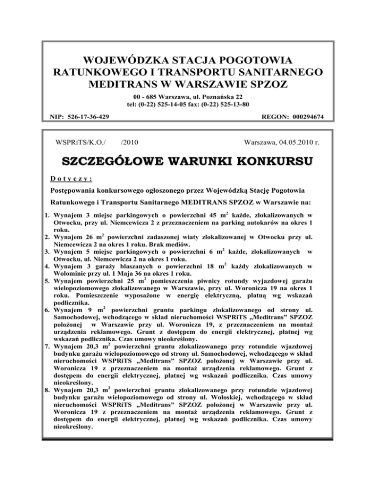 WOJEWÓDZKA STACJA POGOTOWIA RATUNKOWEGO I TRANSPORTU SANITARNEGO MEDITRANS W WARSZAWIE SPZOZ 00 - 685 Warszawa, ul. Poznańska 22 tel: (0-22) 525-14-05 fax: (0-22) 525-13-80 NIP: 526-17-36-429 WSPRiTS/K.O./ REGON: 000294674 /2010 Warszawa, 04.05.2010 r. SZCZEGÓŁOWE WARUNKI KONKURSU Dotyczy: Postępowania konkursowego ogłoszonego przez Wojewódzką Stację Pogotowia Ratunkowego i Transportu Sanitarnego MEDITRANS SPZOZ w Warszawie na: 1. Wynajem 3 miejsc parkingowych o powierzchni 45 m2 kaŜde, zlokalizowanych w Otwocku, przy ul. Niemcewicza 2 z przeznaczeniem na parking autokarów na okres 1 roku. 2. Wynajem 26 m2 powierzchni zadaszonej wiaty zlokalizowanej w Otwocku przy ul. Niemcewicza 2 na okres 1 roku. Brak mediów. 3. Wynajem 5 miejsc parkingowych o powierzchni 6 m2 kaŜde, zlokalizowanych w Otwocku, ul. Niemcewicza 2 na okres 1 roku. 4. Wynajem 3 garaŜy blaszanych o powierzchni 18 m2 kaŜdy zlokalizowanych w Wołominie przy ul. 1 Maja 36 na okres 1 roku. 5. Wynajem powierzchni 25 m2 pomieszczenia piwnicy rotundy wyjazdowej garaŜu wielopoziomowego zlokalizowanego w Warszawie, przy ul. Woronicza 19 na okres 1 roku. Pomieszczenie wyposaŜone w energię elektryczną, płatną wg wskazań podlicznika. 6. Wynajem 9 m2 powierzchni gruntu parkingu zlokalizowanego od strony ul. Samochodowej, wchodzącego w skład nieruchomości WSPRiTS „Meditrans” SPZOZ połoŜonej w Warszawie przy ul. Woronicza 19, z przeznaczeniem na montaŜ urządzenia reklamowego. Grunt z dostępem do energii elektrycznej, płatnej wg wskazań podlicznika. Czas umowy nieokreślony. 7. Wynajem 20,3 m2 powierzchni gruntu zlokalizowanego przy rotundzie wjazdowej budynku garaŜu wielopoziomowego od strony ul. Samochodowej, wchodzącego w skład nieruchomości WSPRiTS „Meditrans” SPZOZ połoŜonej w Warszawie przy ul. Woronicza 19 z przeznaczeniem na montaŜ urządzenia reklamowego. Grunt z dostępem do energii elektrycznej, płatnej wg wskazań podlicznika. Czas umowy nieokreślony. 8. Wynajem 20,3 m2 powierzchni gruntu zlokalizowanego przy rotundzie wjazdowej budynku garaŜu wielopoziomowego od strony ul. Wołoskiej, wchodzącego w skład nieruchomości WSPRiTS „Meditrans” SPZOZ połoŜonej w Warszawie przy ul. Woronicza 19 z przeznaczeniem na montaŜ urządzenia reklamowego. Grunt z dostępem do energii elektrycznej, płatnej wg wskazań podlicznika. Czas umowy nieokreślony. I. OPIS SPOSOBU PRZYGOTOWANIA OFERTY 1. Oferent składa ofertę zgodnie z wymaganiami określonymi w Szczegółowych Warunkach Konkursu. ▪ KaŜdy oferent moŜe złoŜyć ofertę na kaŜdą z wynajmowanych powierzchni ▪ Oferta zawierająca wariantowe propozycje cenowe zostanie odrzucona. 2. Oferenci ponoszą wszelkie koszty związane z przygotowaniem i złoŜeniem oferty. 3. Ofertę naleŜy opracować na druku "OFERTA". Oferentowi nie wolno dokonywać Ŝadnych zmian merytorycznych we wzorze druku „OFERTA”, (w załączeniu: pisemny wzór dokumentu). 4. Oferta - pod rygorem jej odrzucenia - powinna być napisana w języku polskim, na maszynie, komputerze lub ręcznie nieścieralnym atramentem oraz podpisana przez osobę / osoby upowaŜnione do złoŜenia oferty. UpowaŜnienie do podpisania oferty powinno być dołączone do oferty, o ile nie wynika ono z innych dokumentów dołączonych do oferty. 5. KaŜda strona oferty powinna być parafowana przez osobę podpisującą ofertę. 6. Wszystkie dokumenty i oświadczenia sporządzone w językach obcych naleŜy złoŜyć wraz z tłumaczeniami na język polski sporządzonymi przez tłumaczy przysięgłych. 7. Ofertę wraz ze wszystkimi załącznikami na ponumerowanych stronach naleŜy umieścić w zapieczętowanej kopercie opatrzonej danymi Oferenta oraz napisem: Konkurs na: 1. Wynajem 3 miejsc parkingowych o powierzchni 45 m2 kaŜde, zlokalizowanych w Otwocku, przy ul. Niemcewicza 2 z przeznaczeniem na parking autokarów na okres 1 roku. 2. Wynajem 26 m2 powierzchni zadaszonej wiaty zlokalizowanej w Otwocku przy ul. Niemcewicza 2 na okres 1 roku. Brak mediów. 3. Wynajem 5 miejsc parkingowych o powierzchni 6 m2 kaŜde, zlokalizowanych w Otwocku, ul. Niemcewicza 2 na okres 1 roku. 4. Wynajem 3 garaŜy blaszanych o powierzchni 18 m2 kaŜdy zlokalizowanych w Wołominie przy ul. 1 Maja 36 na okres 1 roku. 5. Wynajem powierzchni 25 m2 pomieszczenia piwnicy rotundy wyjazdowej garaŜu wielopoziomowego zlokalizowanego w Warszawie, przy ul. Woronicza 19 na okres 1 roku. Pomieszczenie wyposaŜone w energię elektryczną, płatną wg wskazań podlicznika. 6. Wynajem 9 m2 powierzchni gruntu parkingu zlokalizowanego od strony ul. Samochodowej, wchodzącego w skład nieruchomości WSPRiTS „Meditrans” SPZOZ połoŜonej w Warszawie przy ul. Woronicza 19, z przeznaczeniem na montaŜ urządzenia reklamowego. Grunt z dostępem do energii elektrycznej, płatnej wg wskazań podlicznika. Czas umowy nieokreślony. 7. Wynajem 20,3 m2 powierzchni gruntu zlokalizowanego przy rotundzie wjazdowej budynku garaŜu wielopoziomowego od strony ul. Samochodowej, wchodzącego w skład nieruchomości WSPRiTS „Meditrans” SPZOZ połoŜonej w Warszawie przy ul. Woronicza 19 z przeznaczeniem na montaŜ urządzenia reklamowego. Grunt z dostępem do energii elektrycznej, płatnej wg wskazań podlicznika. Czas umowy nieokreślony. 8. Wynajem 20,3 m2 powierzchni gruntu zlokalizowanego przy rotundzie wjazdowej budynku garaŜu wielopoziomowego od strony ul. Wołoskiej, wchodzącego w skład nieruchomości WSPRiTS „Meditrans” SPZOZ połoŜonej w Warszawie przy ul. Woronicza 19 z przeznaczeniem na montaŜ urządzenia reklamowego. Grunt z dostępem do energii elektrycznej, płatnej wg wskazań podlicznika. Czas umowy nieokreślony. Nie otwierać przed 26.05.2010 r. do godziny 10.00 9. Oferta pod rygorem odrzucenia musi zawierać wszystkie wymagane w Szczegółowych Warunkach Konkursu dokumenty wymienione w rozdziale II. Jeśli dokument przedstawiony jest w postaci kserokopii - poświadczenie, oprócz adnotacji: „za z