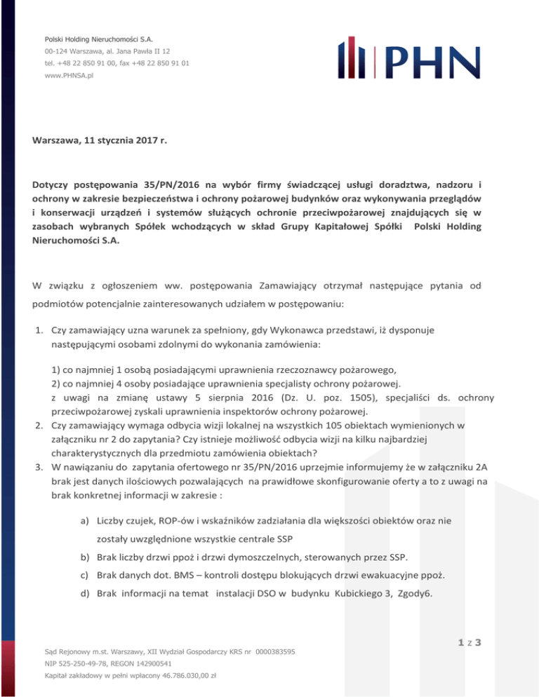 Polski Holding Nieruchomości S.A. 00-124 Warszawa, al. Jana Pawła II 12 tel. +48 22 850 91 00, fax +48 22 850 91 01 www.PHNSA.pl Warszawa, 11 stycznia 2017 r. Dotyczy postępowania 35/PN/2016 na wybór firmy świadczącej usługi doradztwa, nadzoru i ochrony w zakresie bezpieczeństwa i ochrony pożarowej budynków oraz wykonywania przeglądów i konserwacji urządzeń i systemów służących ochronie przeciwpożarowej znajdujących się w zasobach wybranych Spółek wchodzących w skład Grupy Kapitałowej Spółki Polski Holding Nieruchomości S.A. W związku z ogłoszeniem ww. postępowania Zamawiający otrzymał następujące pytania od podmiotów potencjalnie zainteresowanych udziałem w postępowaniu: 1. Czy zamawiający uzna warunek za spełniony, gdy Wykonawca przedstawi, iż dysponuje następującymi osobami zdolnymi do wykonania zamówienia: 1) co najmniej 1 osobą posiadającymi uprawnienia rzeczoznawcy pożarowego, 2) co najmniej 4 osoby posiadające uprawnienia specjalisty ochrony pożarowej. z uwagi na zmianę ustawy 5 sierpnia 2016 (Dz. U. poz. 1505), specjaliści ds. ochrony przeciwpożarowej zyskali uprawnienia inspektorów ochrony pożarowej. 2. Czy zamawiający wymaga odbycia wizji lokalnej na wszystkich 105 obiektach wymienionych w załączniku nr 2 do zapytania? Czy istnieje możliwość odbycia wizji na kilku najbardziej charakterystycznych dla przedmiotu zamówienia obiektach? 3. W nawiązaniu do zapytania ofertowego nr 35/PN/2016 uprzejmie informujemy że w załączniku 2A brak jest danych ilościowych pozwalających na prawidłowe skonfigurowanie oferty a to z uwagi na brak konkretnej informacji w zakresie : a) Liczby czujek, ROP-ów i wskaźników zadziałania dla większości obiektów oraz nie zostały uwzględnione wszystkie centrale SSP b) Brak liczby drzwi ppoż i drzwi dymoszczelnych, sterowanych przez SSP. c) Brak danych dot. BMS – kontroli dostępu blokujących drzwi ewakuacyjne ppoż. d) Brak informacji na temat instalacji DSO w budynku Kubickiego 3, Zgody6. 1z3 Sąd Rejonowy m.st. Warszawy, XII Wydział Gospodarczy KRS nr 0000383595 NIP 525-250-49-78, REGON 142900541 Kapitał zakładowy w pełni wpłacony 46.786.030,00 zł e) INTRACO - brak jest informacji o gaśnicach, hydrantach, czujkach, ROP-ach. f) Brak informacji o ilości pompowni ppoż hydrantowych i sposobie zasilania instalacji hydrantowej w większości obiektów, g) Brak czytelnej informacji o przeciwpożarowych klapach odcinających w Budynku Kaskada, Domaniewska, Krywulta 2 , h) Czy należy to rozumieć, że instalacje te będą rozpatrywane osobno? i) Czy w tabeli 5A wpisujemy ryczałt miesięczny, czy roczny, netto czy brutto? j) W załączniku 5A tabela nie obejmuje p.4 z załącznika 5 4. Usuwanie awarii w zakresie bezpieczeństwa pożarowego wymaga współpracy z podmiotami ze sfery utrzymania ruchu budynków np. : instalacji elektrycznych, wod.-kan, wentylacji itp. zatem konieczne są dane dotyczące firm bądź zespołów , które będą odpowiadały za ten obszar w związku z podziałem kompetencji w trakcie usuwania awarii lub przeprowadzania przeglądu technicznego. np. oświetlenia ewakuacyjnego , wykonywania testów urządzeń ppoż na zgodność z algorytmami scenariusza pożarowego z matrycy sterowań. Przeciwpożarowe klapy odcinające, zgodnie z dokumentacją projektową, są integralna częścią instalacji wentylacji budynku bytowej lub przeciwpożarowej oddymiającej i konserwacja powinna być zlecona Firmie konserwującej te instalacje w całym obiekcie gdyż w czasie naprawy będzie następowała ingerencja w cały system wentylacji . Odpowiedzi: 1. Zamawiający uzna warunek za spełniony, gdy Wykonawca przedstawi, iż dysponuje następującymi osobami zdolnymi do wykonania zamówienia: 1) co najmniej 1 osobą posiadającą uprawnienia rzeczoznawcy pożarowego, 2) co najmniej 4 osoby posiadające uprawnienia specjalisty ochrony pożarowej. Przy czym spełnienie warunku posiadania co najmniej czterech osób posiadających uprawnienia specjalisty ochrony pożarowej będzie uznane w przypadku przedstawienia Zamawiającemu aktualnych zaświadczeń/świadectw odbycia szkolenia aktualizującego inspektorów ochrony pożarowej. 2z3 Sąd Rejonowy m.st. Warszawy, XII Wydział Gospodarczy KRS nr 0000383595 NIP 525-250-49-78, REGON 142900541 Kapitał zakładowy w pełni wpłacony 46.786.030,00 zł 2. Zamawiający wymaga podpisania oświadczenia o przeprowadzeniu wizji lokalnej oraz udostępnia w tym celu oferentom wszystkie nieruchomości. Zamawiający dopuszcza aby oferent dokonał wizji wybranych przez siebie lokalizacji. 3. a)- g) Zamawiający informuje, że wszystkie elementy bezpieczeństwa pożarowego w tym m.in. czujki, ROP-y, centrale drzwi ppoż. i drzwi dymoszczelne, pompownie ppoż. hydrantowe, klapy przeciwpożarowe odcinające objęte są postępowaniem. Zamawiający udostępnia dodatkowo wstępny harmonogram przeglądów instalacji i urządzeń ppoż. będący uzupełnieniem załącznikiem nr 2A i informacji w nim zawartych. Zamawiający dodatkowo informuje, że zgodnie z Par. 2 ust. 2 Załącznika nr 13 „Projekt Umowy” informuje, iż zestawienie będące załącznikiem 2A należy uznać za zestawienie otwarte. h) W myśl powyższego instalacje te nie będą rozpatrywane osobno. i) Zamawiający wyjaśnia, iż w tabeli 5A należy określić ryczałt miesięczny netto. j) Zamawiający załącza poprawiony Załącznik nr 5A. 4. Zamawiający przekaże wybranemu w postępowaniu wykonawcy listę firm konserwujących poszczególne instalacje i urządzenia. Z poważaniem Marzena Krajewska Główny Specjalista tel. +48 22 850 91 85 tel. kom. +48 603 978 479 3z3 Sąd Rejonowy m.st. Warszawy, XII Wydział Gospodarczy KRS nr 0000383595 NIP 525-250-49-78, REGON 142900541 Kapitał zakładowy w pełni wpłacony 46.786.030,00 zł