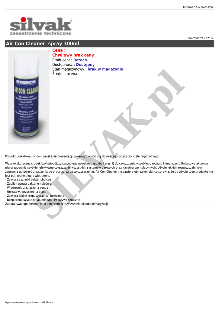 Informacje o produkcie Utworzono 09-03-2017 Air Con Cleaner spray 300ml Cena : Chwilowy brak ceny AK .p l Producent : Retech Dostępność : Dostępny Stan magazynowy : brak w magazynie Średnia ocena : LV Produkt unikatowy - w celu uzyskania prezentacji, prosimy zwrócić się do naszego przedstawiciela regionalnego. SI Wysoko skuteczny środek bakteriobójczy (zapobiega powstaniu grzyba i pleśni) do czyszczenia wszelkiego rodzaju klimatyzacji. Unikatowa aktywna piana zapewnia szybkie, efektywne czyszczenie wszystkich systemów parowych oraz kanałów wentylacyjnych. Użycie lekkich rozpuszczalników zapewnia gotowość urządzenia do pracy zaraz po wyczyszczeniu. Air Con Cleaner nie zawiera etyloalkoholu, co sprawia, że po użyciu tego produktu nie jest potrzebne długie wietrzenie. - Zawiera czynniki bakteriobójcze - Zabija i usuwa bakterie i pleśnie - W aerozolu z załączoną sondą - Unikatowa przyczepna piana - Zawiera lekkie rozpuszczalniki, bezwonny - Bezpieczne użycie na aluminium i tworzywa sztuczne Zapytaj swojego mechanika o konieczność czyszczenia układu klimatyzacji. Wygenerowano w programie www.oscGold.com