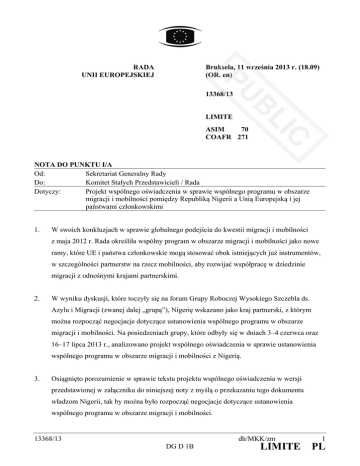 RADA UNII EUROPEJSKIEJ Bruksela, 11 września 2013 r. (18.09) (OR. en) B PU 13368/13 ASIM 70 COAFR 271 C LI LIMITE NOTA DO PUNKTU I/A Od: Sekretariat Generalny Rady Do: Komitet Stałych Przedstawicieli / Rada Dotyczy: Projekt wspólnego oświadczenia w sprawie wspólnego programu w obszarze migracji i mobilności pomiędzy Republiką Nigerii a Unią Europejską i jej państwami członkowskimi 1. W swoich konkluzjach w sprawie globalnego podejścia do kwestii migracji i mobilności z maja 2012 r. Rada określiła wspólny program w obszarze migracji i mobilności jako nowe ramy, które UE i państwa członkowskie mogą stosować obok istniejących już instrumentów, w szczególności partnerstw na rzecz mobilności, aby rozwijać współpracę w dziedzinie migracji z odnośnymi krajami partnerskimi. 2. W wyniku dyskusji, które toczyły się na forum Grupy Roboczej Wysokiego Szczebla ds. Azylu i Migracji (zwanej dalej „grupą”), Nigerię wskazano jako kraj partnerski, z którym można rozpocząć negocjacje dotyczące ustanowienia wspólnego programu w obszarze migracji i mobilności. Na posiedzeniach grupy, które odbyły się w dniach 3–4 czerwca oraz 16–17 lipca 2013 r., analizowano projekt wspólnego oświadczenia w sprawie ustanowienia wspólnego programu w obszarze migracji i mobilności z Nigerią. 3. Osiągnięto porozumienie w sprawie tekstu projektu wspólnego oświadczenia w wersji przedstawionej w załączniku do niniejszej noty z myślą o przekazaniu tego dokumentu władzom Nigerii, tak by można było rozpocząć negocjacje dotyczące ustanowienia wspólnego programu w obszarze migracji i mobilności. 13368/13 Conseil UE DG D 1B dh/MKK/zm 1 LIMITE PL 4. Po negocjacjach z władzami Nigerii zaktualizowana wersja tekstu projektu wspólnego oświadczenia zostanie przekazana grupie do uzgodnienia. Następnie Komitet Stałych Przedstawicieli i Rada zostaną poproszone o przeanalizowanie i zatwierdzenie tekstu przed ustanowieniem wspólnego programu w obszarze migracji i mobilności z Nigerią. 5. Komitet Stałych Przedstawicieli jest proszony o zapoznanie się z tekstem projektu wspólnego oświadczenia w sprawie ustanowienia wspólnego programu w obszarze migracji i mobilności w wersji przedstawionej w załączniku do niniejszej noty; dokument ten ma być przedmiotem negocjacji z Nigerią. ______________ 13368/13 DG D 1B dh/MKK/zm 2 LIMITE PL ZAŁĄCZNIK Projekt wspólnego oświadczenia w sprawie wspólnego programu w obszarze migracji i mobilności pomiędzy Republiką Nigerii a Unią Europejską i jej państwami członkowskimi Republika Nigerii i Unia Europejska oraz uczestniczące państwa członkowskie Unii Europejskiej (zwane dalej „sygnatariuszami”); PRZYWOŁUJĄC pogłębiony dialog polityczny między UE a Nigerią w kontekście dialogu EU– Nigeria „Wspólna droga naprzód”, a zwłaszcza posiedzenie ministerialne, które odbyło się w Brukseli w dniu 16 maja 2013 r. i podczas którego strony zobowiązały się do przeanalizowania możliwości wzmocnienia aktualnych wspólnych ram współpracy w obszarze migracji i mobilności; W OPARCIU o doroczny dialog między UE a Nigerią w sprawie migracji i rozwoju ustanowiony w 2008 r. oraz o pozytywne wyniki, które do tej pory przyniósł, a zwłaszcza o wnioski z dialogu, który odbył się w dniu 20 marca 2013 r. w Abudży; PRZYWOŁUJĄC porozumienie robocze zawarte w dniu 19 stycznia 2012 r. między Nigerią a Europejską Agencją Zarządzania Współpracą Operacyjną na Zewnętrznych Granicach Państw Członkowskich Unii Europejskiej (FRONTEX); PRZYWOŁUJĄC programy w zakresie współpracy na rzecz rozwoju w dziedzinie migracji (projekt dotyczący współpracy na rzecz rozwoju w zakresie zarządzania migracją finansowany ze środków 10. Europejskiego Funduszu Rozwoju i inne projekty obejmujące wszystkie kraje AKP); PRZYWOŁUJĄC stosowne regionalne ramy współpracy i dialogu, zwłaszcza partnerstwo strategiczne między Unią Afrykańską a Unią Europejską, a w szczególności partnerstwo w dziedzinie migracji, mobilności i zatrudnienia, euroafrykański dialog w sprawie migracji i rozwoju (Proces Rabacki) oraz dialog między AKP a UE w sprawie migracji i rozwoju oparty na art. 13 umowy z Kotonu; 13368/13 ZAŁĄCZNIK DG D 1B dh/MKK/zm 3 LIMITE PL PODKREŚLAJĄC korzyści i możliwości, jakie dobrze zarządzane migracja i mobilność mogą przynieść zarówno migrantom, jaki i sygnatariuszom oraz ich wspólne zobowiązanie do zapewnienia lepszego zarządzania przepływami migracyjnymi między Nigerią a Unią Europejską; POTWIERDZAJĄC wolę zapobiegania nielegalnej imigracji i zwalczania tego zjawiska zgodnie z mającymi zastosowanie standardami międzynarodowymi oraz PODKREŚLAJĄC znaczenie, jakie dla osiągnięcia tego celu mają programy w zakresie dobrowolnego powrotu oraz reintegracji; UZNAJĄC fakt, że dalsze analizowanie możliwości współpracy w zakresie powrotu osób przebywających nielegalnie leży we wspólnym interesie UE i Nigerii; PRZYWOŁUJĄC zdecydowane zobowiązanie obu stron do dalszego zapobiegania handlowi ludźmi i zwalczania tego zjawiska oraz do lepszej ochrony i wspierania ofiar tego procederu; UZNAJĄC znaczenie zwiększania zdolności właściwych nigeryjskich służb zajmujących się zarządzaniem przepływami migracyjnymi; PODKREŚLAJĄC znaczenie wolumenu przekazów pieniężnych wysyłanych do Nigerii i możliwości jego wzrostu; UZNAJĄC fakt, że kontynuowanie ogólnego dialogu między UE a Nigerią dotyczącego wiz oraz analizowanie możliwości poprawy współpracy między obu stronami w zakresie ich stosownych ram prawnych leży we wspólnym interesie UE i Nigerii; DZIAŁAJĄC bez uszczerbku dla kompetencji państw członkowskich UE i samej UE określonych w Traktacie o funkcjonowaniu Unii Europejskiej; PRZYWOŁUJĄC unijne globalne podejście do kwestii migracji i mobilności przyjęte przez Radę Unii Europejskiej w dniu 29 maja 2012 r. [dodać ewentua