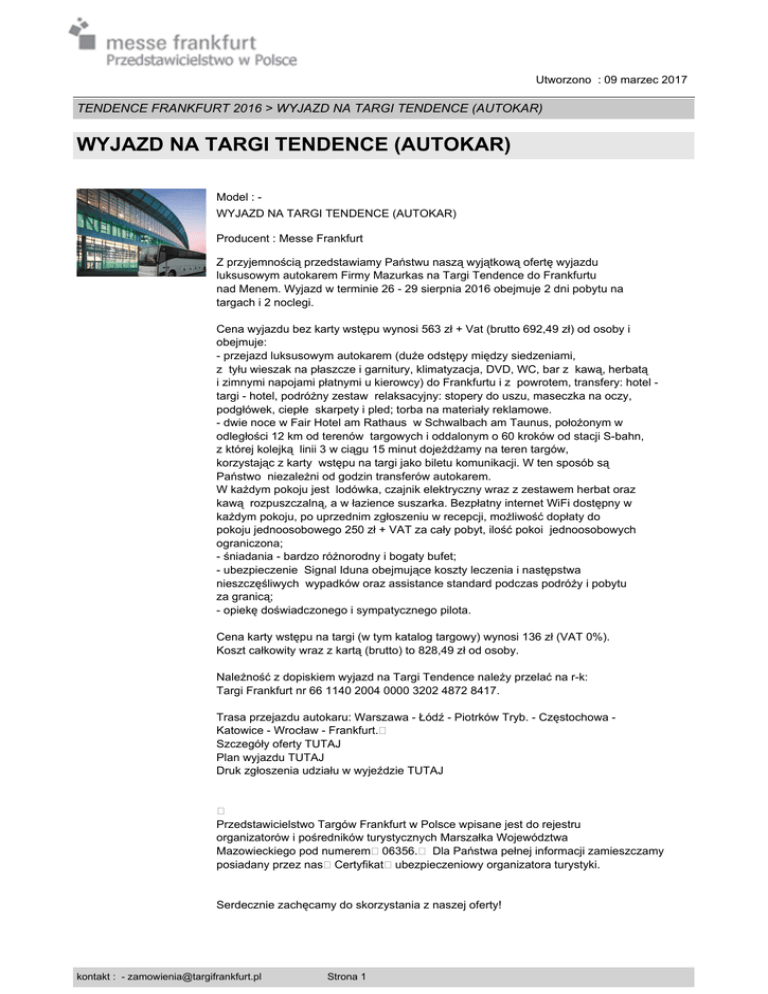 Utworzono : 09 marzec 2017 TENDENCE FRANKFURT 2016 > WYJAZD NA TARGI TENDENCE (AUTOKAR) WYJAZD NA TARGI TENDENCE (AUTOKAR) Model : WYJAZD NA TARGI TENDENCE (AUTOKAR) Producent : Messe Frankfurt Z przyjemnością przedstawiamy Państwu naszą wyjątkową ofertę wyjazdu luksusowym autokarem Firmy Mazurkas na Targi Tendence do Frankfurtu nad Menem. Wyjazd w terminie 26 - 29 sierpnia 2016 obejmuje 2 dni pobytu na targach i 2 noclegi. Cena wyjazdu bez karty wstępu wynosi 563 zł + Vat (brutto 692,49 zł) od osoby i obejmuje: - przejazd luksusowym autokarem (duże odstępy między siedzeniami, z tyłu wieszak na płaszcze i garnitury, klimatyzacja, DVD, WC, bar z kawą, herbatą i zimnymi napojami płatnymi u kierowcy) do Frankfurtu i z powrotem, transfery: hotel targi - hotel, podróżny zestaw relaksacyjny: stopery do uszu, maseczka na oczy, podgłówek, ciepłe skarpety i pled; torba na materiały reklamowe. - dwie noce w Fair Hotel am Rathaus w Schwalbach am Taunus, położonym w odległości 12 km od terenów targowych i oddalonym o 60 kroków od stacji S-bahn, z której kolejką linii 3 w ciągu 15 minut dojeżdżamy na teren targów, korzystając z karty wstępu na targi jako biletu komunikacji. W ten sposób są Państwo niezależni od godzin transferów autokarem. W każdym pokoju jest lodówka, czajnik elektryczny wraz z zestawem herbat oraz kawą rozpuszczalną, a w łazience suszarka. Bezpłatny internet WiFi dostępny w każdym pokoju, po uprzednim zgłoszeniu w recepcji, możliwość dopłaty do pokoju jednoosobowego 250 zł + VAT za cały pobyt, ilość pokoi jednoosobowych ograniczona; - śniadania - bardzo różnorodny i bogaty bufet; - ubezpieczenie Signal Iduna obejmujące koszty leczenia i następstwa nieszczęśliwych wypadków oraz assistance standard podczas podróży i pobytu za granicą; - opiekę doświadczonego i sympatycznego pilota. Cena karty wstępu na targi (w tym katalog targowy) wynosi 136 zł (VAT 0%). Koszt całkowity wraz z kartą (brutto) to 828,49 zł od osoby. Należność z dopiskiem wyjazd na Targi Tendence należy przelać na r-k: Targi Frankfurt nr 66 1140 2004 0000 3202 4872 8417. Trasa przejazdu autokaru: Warszawa - Łódź - Piotrków Tryb. - Częstochowa Katowice - Wrocław - Frankfurt.� Szczegóły oferty TUTAJ Plan wyjazdu TUTAJ Druk zgłoszenia udziału w wyjeździe TUTAJ � Przedstawicielstwo Targów Frankfurt w Polsce wpisane jest do rejestru organizatorów i pośredników turystycznych Marszałka Województwa Mazowieckiego pod numerem�06356.� Dla Państwa pełnej informacji zamieszczamy posiadany przez nas�Certyfikat�ubezpieczeniowy organizatora turystyki. Serdecznie zachęcamy do skorzystania z naszej oferty! kontakt : - [email protected] Strona 1 Utworzono : 09 marzec 2017 TENDENCE FRANKFURT 2016 > WYJAZD NA TARGI TENDENCE (AUTOKAR) WYJAZD NA TARGI TENDENCE (AUTOKAR) Normal 0 21 false false false PL X-NONE X-NONE DefSemiHidden="true" DefQFormat="false" DefPriority="99" LatentStyleCount="267"> UnhideWhenUsed="false" QFormat="true" Name="Normal" /> UnhideWhenUsed="false" QFormat="true" Name="heading 1" /> kontakt : - [email protected] Strona 2 Utworzono : 09 marzec 2017 TENDENCE FRANKFURT 2016 > WYJAZD NA TARGI TENDENCE (AUTOKAR) WYJAZD NA TARGI TENDENCE (AUTOKAR) UnhideWhenUsed="false" QFormat="true" Name="Title" /> UnhideWhenUsed="false" QFormat="true" Name="Subtitle" /> UnhideWhenUsed="false" QFormat="true" Name="Strong" /> UnhideWhenUsed="false" QFormat="true" Name="Emphasis" /> UnhideWhenUsed="false" Name="Table Grid" /> UnhideWhenUsed="false" QFormat="true" Name="No Spacing" /> UnhideWhenUsed="false" Name="Light Shading" /> UnhideWhenUsed="false" Name="Light List" /> UnhideWhenUsed="false" Name="Light Grid" /> UnhideWhenUsed="false" Name="Medium Shading 1" /> UnhideWhenUsed="false" Name="Medium Shading 2" /> UnhideWhenUsed="false" Name="Medium List 1" /> UnhideWhenUsed="false" Name="Medium List 2" /> UnhideWhenUsed="false" Name="Medium Grid 1" /> UnhideWhenUsed="false" Name="Medium Grid 2" /> UnhideWhenUsed="false" Name="Medium Grid 3" /> UnhideWhenUsed="false" Name="Dark List" /> UnhideWhenUsed="false" Name="Colorful Shading" /> kontakt : - [email protected] Strona 3 Utworzono : 09 marzec 2017 TENDENCE FRANKFURT 2016 > WYJAZD NA TARGI TENDENCE (AUTOKAR) WYJAZD NA TARGI TENDENCE (AUTOKAR) UnhideWhenUsed="false" Name="Colorful List" /> UnhideWhenUsed="false" Name="Colorful Grid" /> UnhideWhenUsed="false" Name="Light Shading Accent 1" /> UnhideWhenUsed="false" Name="Light List Accent 1" /> UnhideWhenUsed="false" Name="Light Grid Accent 1" /> UnhideWhenUsed="false" Name="Medium Shading 1 Accent 1" /> UnhideWhenUsed="false" Name="Medium Shading 2 Accent 1" /> UnhideWhenUsed="false" Name="Medium List 1 Accent 1" /> UnhideWhenUsed="false" QFormat="true" Name="List Paragraph" /> UnhideWhenUsed="false" QFormat="true" Name="Quote" /> UnhideWhenUsed="false" QFormat="true" Name="Intense Quote" /> UnhideWhenUsed="false" Name="Medium List 2 Accent 1" /> UnhideWhenUsed="false" Name="Medium Grid 1 Accent 1" /> UnhideWhenUsed="false" Name="Medium Grid 2 Accent 1" /> UnhideWhenUsed="false" Name="Medium Grid 3 Accent 1" /> UnhideWhenUsed="false" Name="Dark List Accent 1" /> UnhideWhenUsed="false" Name="Colorful Shading Accent 1" /> UnhideWhenUsed="false" Name="Colorful List Accent 1" /> UnhideWhenUsed="false" Name="Colorful Grid Accent 1" /> UnhideWhenUsed="false" Name="Light Shading Accent 2" /> UnhideWhenUsed="false" Name="Light List Accent 2" /> UnhideWhenUsed="false" Name="Light Grid Accent 2" /> UnhideWhenUsed="false" Name="Medium Shading 1 Accent 2" /> UnhideWhenUsed="false" Name="Medium Shading 2 Accent 2" /> UnhideWhenUsed="false" Name="Medium List 1 Accent 2" /> UnhideWhenUsed="false" Name="Medium List 2 Accent 2" /> UnhideWhenUsed="false" Name="Medium Grid 1 Accent 2" /> kontakt : - [email protected] Strona 4 Utworzono : 09 marzec 2017 TENDENCE FRANKFURT 2016 > WYJAZD NA TARGI TENDENCE (AUTOKAR) WYJAZD NA TARGI TENDENCE (AUTOKAR)