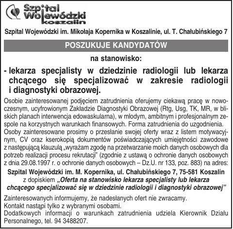 Szpital Wojewódzki im. Mikołaja Kopernika w Koszalinie, ul. T. Chałubińskiego 7 POSZUKUJE KANDYDATÓW na stanowisko: - lekarza specjalisty w dziedzinie radiologii lub lekarza chcącego się specjalizować w zakresie radiologii i diagnostyki obrazowej. Osobie zainteresowanej podjęciem zatrudnienia oferujemy ciekawą pracę w nowoczesnym, ucyfrowionym Zakładzie Diagnostyki Obrazowej (Rtg, Usg, TK, MR, w bliskich planach interwencja edowaskularna), w młodym, ambitnym i profesjonalnym zespole na korzystnych warunkach finansowych. Forma zatrudnienia do uzgodnienia. Osoby zainteresowane prosimy o przesłanie swojej oferty wraz z listem motywacyjnym, CV oraz kserokopią dokumentów poświadczających umiejętności zawodowe z następującą klauzulą „wyrażam zgodę na przetwarzanie moich danych osobowych dla potrzeb realizacji procesu rekrutacji” (zgodnie z ustawą o ochronie danych osobowych z dnia 29.08.1997 r. o ochronie danych osobowych – Dz.U. nr 133, poz. 883) na adres: Szpital Wojewódzki im. M. Kopernika, ul. Chałubińskiego 7, 75-581 Koszalin z dopiskiem „Oferta na stanowisko lekarza specjalisty lub lekarza chcącego specjalizować się w dziedzinie radiologii i diagnostyki obrazowej” Zainteresowanych informujemy, że nadesłanych ofert nie zwracamy. Kontakt nastąpi tylko z wybranymi osobami. Dodatkowych informacji o warunkach zatrudnienia udziela Kierownik Działu Personalnego, tel. 94 3488207.