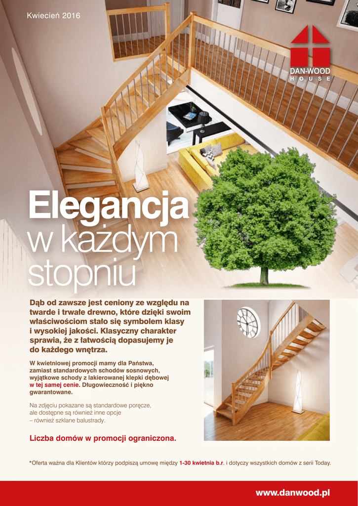 Kwiecień 2016 Elegancja w każdym stopniu Dąb od zawsze jest ceniony ze względu na twarde i trwałe drewno, które dzięki swoim właściwościom stało się symbolem klasy i wysokiej jakości. Klasyczny charakter sprawia, że z łatwością dopasujemy je do każdego wnętrza. W kwietniowej promocji mamy dla Państwa, zamiast standardowych schodów sosnowych, wyjątkowe schody z lakierowanej klepki dębowej w tej samej cenie. Długowieczność i piękno gwarantowane. Na zdjęciu pokazane są standardowe poręcze, ale dostępne są również inne opcje – również szklane balustrady. Liczba domów w promocji ograniczona. *Oferta ważna dla Klientów którzy podpiszą umowę między 1-30 kwietnia b.r. i dotyczy wszystkich domów z serii Today. www.danwood.pl