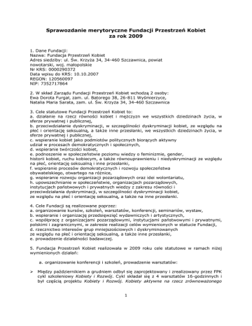 Sprawozdanie merytoryczne Fundacji Przestrzeń Kobiet za rok 2009 1. Dane Fundacji: Nazwa: Fundacja Przestrzeń Kobiet Adres siedziby: ul. Św. Krzyża 34, 34-460 Szczawnica, powiat nowotarski, woj. małopolskie Nr KRS: 0000290372 Data wpisu do KRS: 10.10.2007 REGON: 120560097 NIP: 7352717864 2. W skład Zarządu Fundacji Przestrzeń Kobiet wchodzą 2 osoby: Ewa Dorota Furgał, zam. ul. Batorego 38, 26-811 Wyśmierzyce, Natalia Maria Sarata, zam. ul. Św. Krzyża 34, 34-460 Szczawnica 3. Cele statutowe Fundacji Przestrzeń Kobiet to: a. działanie na rzecz równości kobiet i mężczyzn we wszystkich dziedzinach życia, w sferze prywatnej i publicznej, b. przeciwdziałanie dyskryminacji, w szczególności dyskryminacji kobiet, ze względu na płeć i orientację seksualną, a także inne przesłanki, we wszystkich dziedzinach życia, w sferze prywatnej i publicznej, c. wspieranie kobiet jako podmiotów politycznych biorących aktywny udział w procesach demokratycznych i społecznych, d. wspieranie twórczości kobiet, e. podnoszenie w społeczeństwie poziomu wiedzy o feminizmie, gender, historii kobiet, ruchu kobiecym, a także równouprawnieniu i niedyskryminacji ze względu na płeć, orientację seksualną i inne przesłanki, f. wspieranie procesów demokratycznych i rozwoju społeczeństwa obywatelskiego, otwartego na różnice, g. wspieranie rozwoju organizacji pozarządowych oraz idei wolontariatu, h. upowszechnianie w społeczeństwie, organizacjach pozarządowych, instytucjach państwowych i prywatnych wiedzy z zakresu równości i przeciwdziałania dyskryminacji, w szczególności dyskryminacji kobiet, ze względu na płeć i orientację seksualną, a także na inne przesłanki. 4. Cele Fundacji są realizowane poprzez: a. organizowanie kursów, szkoleń, warsztatów, konferencji, seminariów, wystaw, b. wspieranie i organizację przedsięwzięć wydawniczych i artystycznych, c. współpracę z organizacjami pozarządowymi, instytucjami państwowymi i prywatnymi, polskimi i zagranicznymi, w zakresie realizacji celów wymienionych w statucie Fundacji, d. rzecznictwo interesów grup mniejszościowych i dyskryminowanych ze względu na płeć i orientację seksualną, a także inne przesłanki, e. prowadzenie działalności badawczej. 5. Fundacja Przestrzeń Kobiet realizowała w 2009 roku cele statutowe w ramach niżej wymienionych działań: a. organizowanie konferencji i szkoleń, prowadzenie warsztatów: Między październikiem a grudniem odbył się zaprojektowany i zrealizowany przez FPK cykl szkoleniowy Kobiety i Rozwój. Cykl składał się z 4 warsztatów 16-godzinnych i był częścią projektu Kobiety i Rozwój. Kobiety aktywne na rzecz zrównoważonego 1 rozwoju lokalnych społeczności Organizacji Pozarządowych. współfinansowanego w ramach Funduszu dla Między wrześniem a listopadem odbyły się 2 cykle szkoleniowe w ramach projektu Instytut Liderek, przeznaczone dla działaczek społecznych i politycznych. Każdy cykl składał się z 4 warsztatów 16-godzinnych. Na zakończenie projektu, w grudniu 2009 roku, odbyła się debata oksfordzka przygotowana przez uczestniczki cyklu dla działaczek politycznych. W listopadzie odbył się pierwszy warsztat historii kobiet dla nauczycieli/ek w ramach projektu Krakowski Szlak Kobiet, który FPK realizuje w partnerstwie z Żydowskim Stowarzyszeniem Czulent w ramach Funduszu dla Organizacji Pozarządowych. W dniu 8 czerwca 2009 roku Fundacja Przestrzeń Kobiet przeprowadziła warsztat różnorodnościowy dla uczniów i uczennic gimnazjum w Szczawnicy. Warsztat odbył się w ramach projektu Wirtualny Szlak Szczawnicy Żydowskiej, realizowanego jako część programu Młodzi Menedżerowie Kultury. W dniach 15-17 października 2009 roku Fundacja Przestrzeń Kobiet zrealizowała warsztaty Zagadnienia genderowe w rozwoju w ramach projektu Druga Dolnośląska Inicjatywa Edukacyjna Dotycząca Międzynarodowej Współpracy Na Rzecz Rozwoju. Projekt realizowany był przez Dom Spotkań im. Angelusa Silesiusa we Wrocławiu, Fundacja Przestrzeń Kobiet była organizacją partnerską w projekcie. W lipcu, wrześniu i listopadzie 2009 roku FPK realizowała warsztaty antydyskryminacyjne, genderowe oraz warsztaty godzenia życia zawodowego z osobistym dla bezrobotnych kobiet do 25 roku życia z powiatu gorlickiego. Warsztaty odbywały się w ramach projektu 3 x K Kompetencje – Kreatywność - Kariera – warsztaty aktywizacyjne dla młodych kobiety z powiatu gorlickiego finansowanego ze środków EFS, realizowanego przez Biuro Inicjatyw Międzynarodowych. b. wspieranie i organizację przedsięwzięć wydawniczych i artystycznych: W czerwcu FPK wydała i rozpoczęła dystrybucję publikacji Krakowski Szlak Kobiet. Przewodniczka po Krakowie emancypantek, t. I pod red. Ewy Furgał, przygotowanej w ramach projektu Polki, Żydówki – krakowskie emancypantki. Historia i współczesność dla równości i różnorodności. Publikacja została wydana w nakładzie 1880 egzemplarzy. W ramach festiwalu literackiego Pora Prozy 2009, FPK współorganizowała spotkanie promocyjne książki Krakowski Szlak Kobiet. Przewodniczka po Krakowie emancypantek. Spotkanie odbyło się w dn. 7 października 2009 w Krakowie. W grudniu 2009 roku spotkanie promocyjne książki Krakowski Szlak Kobiet. Przewodniczka po Krakowie emancypantek odbyło się w Sądeckiej Bibliotece Publicznej im. Józefa Szujskiego w Nowym Sączu. Organizatorami spotkania były: Stowarzyszenie Europa Donna, Sądeckie Forum Kobiet oraz Sądecka Biblioteka Publiczna. c. współpracę z organizacjami pozarządowymi, instytucjami państwowymi i prywatnymi, polskimi i zagranicznymi, w zakresie realizacji celów wymienionych w statucie Fundacji: Projekt Polki, Żydówki – krakowskie emancypantki. Historia i współczesność dla równości i różnorodności, był realizowany przez FPK w partnerstwie z Żydowskim Stowarzyszeniem Czulent i Jewish Community Centre w Krakowie. 2 Projekt Krakow