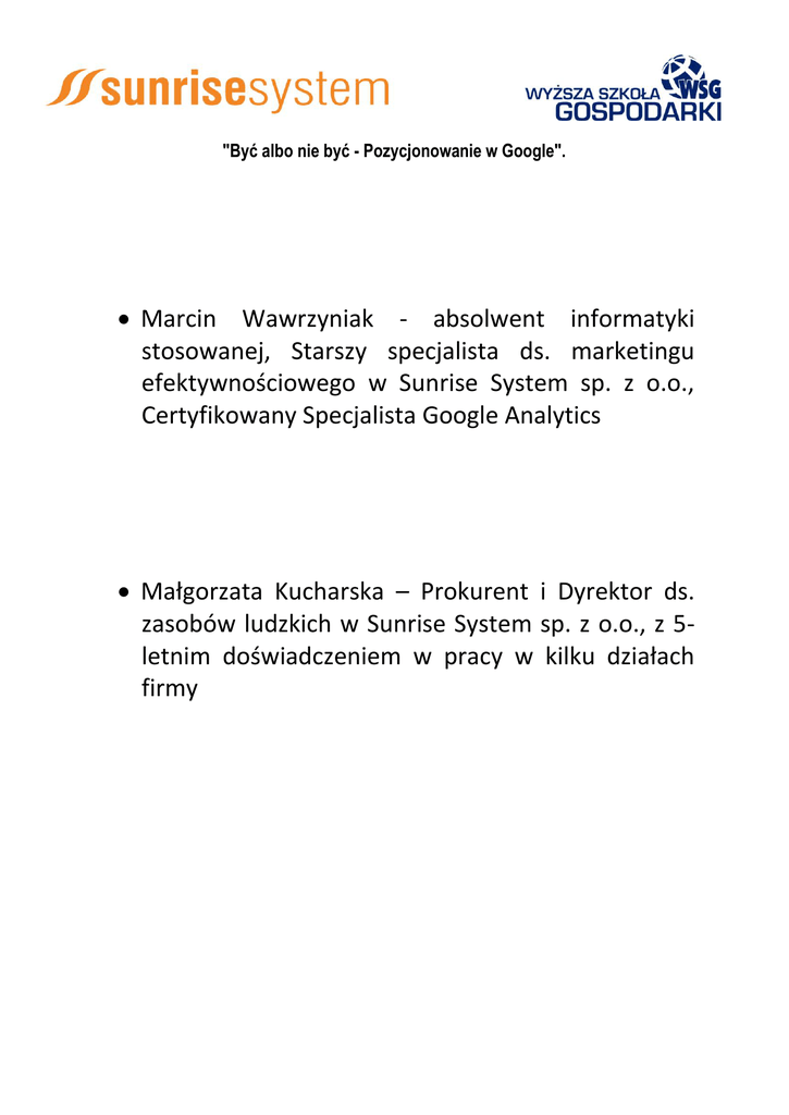 "Być albo nie być - Pozycjonowanie w Google". Marcin Wawrzyniak - absolwent informatyki stosowanej, Starszy specjalista ds. marketingu efektywnościowego w Sunrise System sp. z o.o., Certyfikowany Specjalista Google Analytics Małgorzata Kucharska – Prokurent i Dyrektor ds. zasobów ludzkich w Sunrise System sp. z o.o., z 5letnim doświadczeniem w pracy w kilku działach firmy