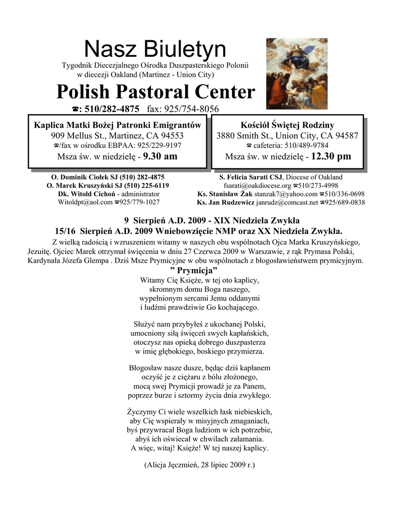 Nasz Biuletyn Tygodnik Diecezjalnego Ośrodka Duszpasterskiego Polonii w diecezji Oakland (Martinez - Union City) Polish Pastoral Center ?: 510/282-4875 fax: 925/754-8056 Kaplica Matki Bożej Patronki Emigrantów 909 Mellus St., Martinez, CA 94553 Kościół Świętej Rodziny 3880 Smith St., Union City, CA 94587 ?/fax w ośrodku EBPAA: 925/229-9197 ? cafeteria: 510/489-9784 Msza św. w niedzielę - 9.30 am Msza św. w niedzielę - 12.30 pm O. Dominik Ciołek SJ (510) 282-4875 O. Marek Kruszyński SJ (510) 225-6119 Dk. Witold Cichoń - administrator [email protected] ?925/779-1027 S. Felicia Sarati CSJ, Diocese of Oakland [email protected] ?510/273-4998 Ks. Stanisław Żak [email protected] ?510/336-0698 Ks. Jan Rudzewicz [email protected] ?925/689-0838 9 Sierpień A.D. 2009 - XIX Niedziela Zwykła 15/16 Sierpień A.D. 2009 Wniebowzięcie NMP oraz XX Niedziela Zwykła. Z wielką radością i wzruszeniem witamy w naszych obu wspólnotach Ojca Marka Kruszyńskiego, Jezuitę. Ojciec Marek otrzymał święcenia w dniu 27 Czerwca 2009 w Warszawie, z rąk Prymasa Polski, Kardynała Józefa Glempa . Dziś Msze Prymicyjne w obu wspólnotach z błogosławieństwem prymicyjnym. ” Prymicja” Witamy Cię Księże, w tej oto kaplicy, skromnym domu Boga naszego, wypełnionym sercami Jemu oddanymi i ludźmi prawdziwie Go kochającego. Służyć nam przybyłeś z ukochanej Polski, umocniony siłą święceń swych kapłańskich, otoczysz nas opieką dobrego duszpasterza w imię głębokiego, boskiego przymierza. Błogosław nasze dusze, będąc dziś kapłanem oczyść je z ciężaru z bólu złożonego, mocą swej Prymicji prowadź je za Panem, poprzez burze i sztormy życia dnia zwykłego. Życzymy Ci wiele wszelkich łask niebieskich, aby Cię wspierały w misyjnych zmaganiach, byś przywracał Boga ludziom w ich potrzebie, abyś ich oświecał w chwilach załamania. A więc, witaj! Księże! W tej naszej kaplicy. (Alicja Jęczmień, 28 lipiec 2009 r.) Z przykrością zawiadamiamy naszą wspólnotę parafialną o zgonie Pana Eugeniusza Kuroczko, który odszedł do Pana w wieku 89 lat w dniu 1-szego sierpnia. Pan Kuroczko, były więzień sowieckich łagrów, zaciągnął się do Armii Gen. Andersa i wraz z nią opuścił Rosję bolszewicką, walcząc aż do zakończenia działań wojennych w Europie w wojsku polskim przy boku wojsk alianckich. Z wykształcenia inżynier, wielce zasłużony Kapitan Wojska Polskiego, uczestnik bitwy o Monte Cassino, działacz organizacji polonijnych, prezes Koła SPK #49 w San Francisco, członek EBPAA, nasz parafianin od początku założenia naszej parafii. Msza Święta żałobna odbędzie się 12 sierpnia w Kościele Świętej Anny w Walnut Creek / Rossmoor o godz 10:00 am, na którą w imieniu rodziny zapraszamy wszystkich naszych parafian. Małżonce ś.p. Eugeniusza Kuroczko, Pani Zofii, która wraz z nim odbyła tę samą drogę wojny, drogę pełną poświęcenia i wielu wyrzeczeń, oraz całej rodzinie, składamy najserdeczniejsze wyrazy współczucia. Dobry Jezu, a nasz Panie, daj mu wieczne spoczywanie, światłość wieczna niech mu świeci gdzie królują wszyscy święci. Z Ogłoszenia parafialne Z . Witamy w naszej wspólnocie Ojca Marka Kruszyńskiego SJ, który z olbrzymim zrozumieniem dla wspólnoty Polonijnej w Diecezji Oakland, pomimo swych studiów na “Jesuit School of Theology” in Berkeley, CA, przychyla sie ku naszej prośbie i wyraża zgodę na posługę Sakramentalno-Eucharystyczną. . 16 sierpnia obchodzimy niedzielę czterech rocznic. Bardzo wiele ważnych wydarzeń historycznych w tym miesiącu dla naszego Narodu. Wspominamy wojnę Polsko-Bolszewicka z 1920 roku i Cud nad Wisłą, dzień Wojska Polskiego, narodzenie ruchu Solidarności z roku 1980-go, Wniebowzięcie NMP 15 sierpnia i Matki Boskiej Częstochowskiej 26 sierpnia. Módlmy się w tym dniu o Boże Błogosławieństwo i wstawiennictwo NMP Matki Bożej dla wszystkich rodaków w Kraju i rozsianych poza jego granicami. . Ks. dr. Zdzisław Madej, światowej klasy tenor, wystąpi również w naszej Kaplicy Matki Bożej Patronki Emigrantów w Martinez w dniu 16 Sierpnia po Mszy Św. Ks. dr. Zdzisław Madej bierze udział w licznych koncertach i festiwalach muzyki oratoryjno-kantatowej. Prowadzi ożywioną działalność artystyczną, współpracując z kilkoma orkiestrami, między innymi z Orkiestrą Filharmonii Sudeckiej, Orkiestrą Filharmonii Wrocławskiej, oraz Orkiestrą Akademii Muzycznej we Wrocławiu. Zapraszamy naszych parafian i wszystkich miłośników śpiewu, który proponuje nam nasz wybitny rodak z Wrocławia. . Druh Ryszard Urbaniak wydaje następny tomik wierszy zatytułowany “Zatoka Poezji”. Jak pamiętamy, druh wraz ze swoim Kołem Harcerskim corocznie organizuje pomoc dla polskiego harcerstwa w Kazachstanie. Dochód ze sprzedaży swego tomiku wierszy ponownie w całości przeznacza na ten piękny i zbożny cel. Prosimy o wsparcie. . Do wszystkich zainteresowanych odbiorem Naszego Biuletynu drogą internetową. Po otwarciu strony internetowej www.PolishPastoralCenter.org znajdziecie państwo linki do biuletynów. Każdy może sobie je otworzyć i zapoznać się z bieżącymi informacjami. . Szkoła Języka Polskiego w Walnut Creek poszukuje nauczycieli na nowy rok szkolny 2009-2010. Chętnych prosimy o kontakt z kierownikiem szkoły p. Tomkiem Kotlińskim [email protected] lub (707)480-8692. Więcej informacji można znaleźć na stronie internetowej szkoły www.polishschool.org . Zebrane składki kościelne. Za złożone ofiary składamy serdeczne Bóg zapłać: Martinez 06/28/09 07/05/09 07/12/09 $277 $322 $321 Tygodniowo potrzeba w Martinez: $342 Union City $294 $107 $276 + 48 lunch i w Union City: $480 BIURO PRAWNE FIRMY KEROSKY & ASSOCIATES Specjalizuje się we wszystkich sprawach cywilnych, takich jak: wypadki samochodowe - obrażenia ciała - sprawy spadkowe - prawo emigracyjne - prawo budowlane oraz nieruchomości - wszystkie sprawy biznesowe. 785 Ma