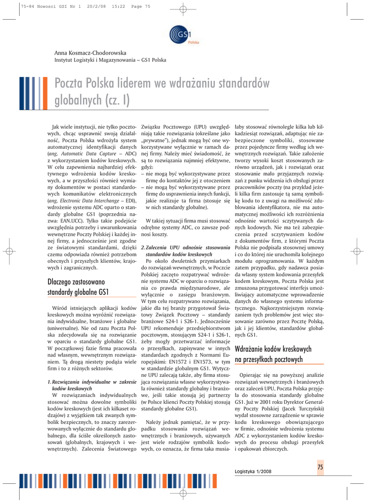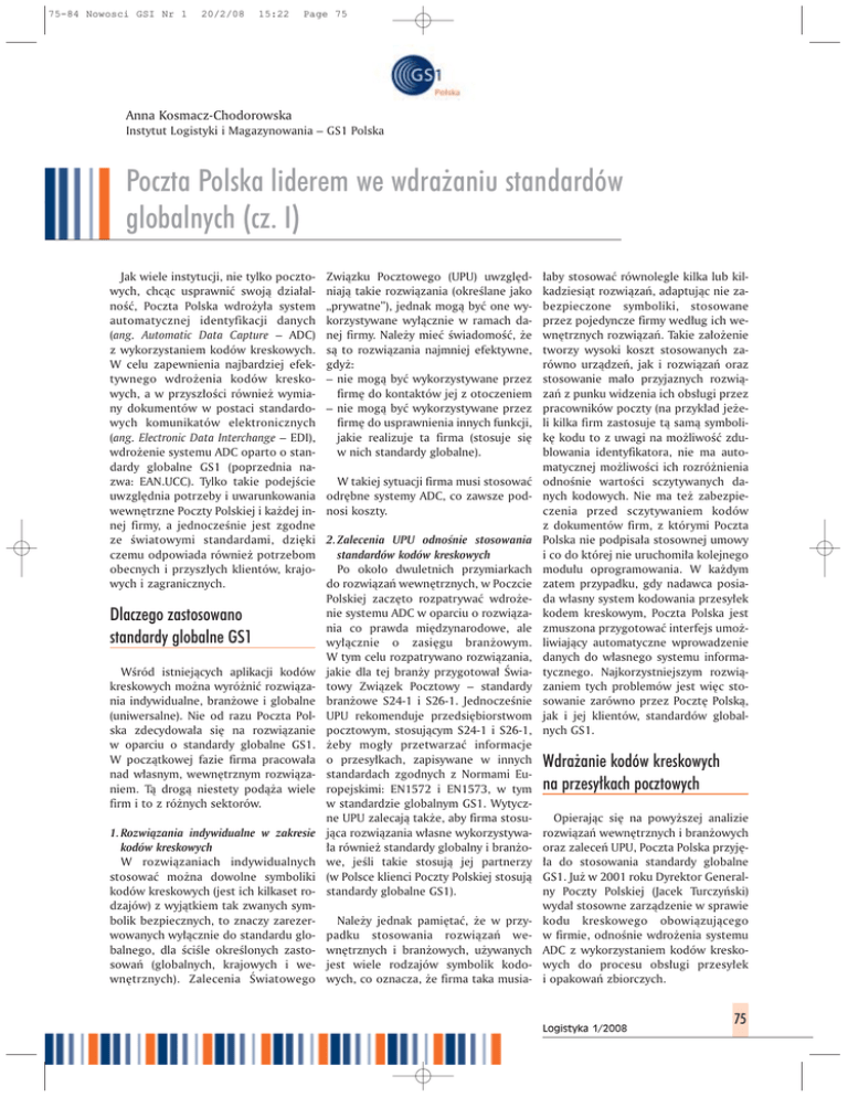 75-84 Nowosci GSI Nr 1 20/2/08 15:22 Page 75 Anna Kosmacz-Chodorowska Instytut Logistyki i Magazynowania – GS1 Polska Poczta Polska liderem we wdra˝aniu standardów globalnych (cz. I) Jak wiele instytucji, nie tylko pocztowych, chcàc usprawniç swojà dzia∏alnoÊç, Poczta Polska wdro˝y∏a system automatycznej identyfikacji danych (ang. Automatic Data Capture – ADC) z wykorzystaniem kodów kreskowych. W celu zapewnienia najbardziej efektywnego wdro˝enia kodów kreskowych, a w przysz∏oÊci równie˝ wymiany dokumentów w postaci standardowych komunikatów elektronicznych (ang. Electronic Data Interchange – EDI), wdro˝enie systemu ADC oparto o standardy globalne GS1 (poprzednia nazwa: EAN.UCC). Tylko takie podejÊcie uwzgl´dnia potrzeby i uwarunkowania wewn´trzne Poczty Polskiej i ka˝dej innej firmy, a jednoczeÊnie jest zgodne ze Êwiatowymi standardami, dzi´ki czemu odpowiada równie˝ potrzebom obecnych i przysz∏ych klientów, krajowych i zagranicznych. Dlaczego zastosowano standardy globalne GS1 WÊród istniejàcych aplikacji kodów kreskowych mo˝na wyró˝niç rozwiàzania indywidualne, bran˝owe i globalne (uniwersalne). Nie od razu Poczta Polska zdecydowa∏a si´ na rozwiàzanie w oparciu o standardy globalne GS1. W poczàtkowej fazie firma pracowa∏a nad w∏asnym, wewn´trznym rozwiàzaniem. Tà drogà niestety podà˝a wiele firm i to z ró˝nych sektorów. 1. Rozwiàzania indywidualne w zakresie kodów kreskowych W rozwiàzaniach indywidualnych stosowaç mo˝na dowolne symboliki kodów kreskowych (jest ich kilkaset rodzajów) z wyjàtkiem tak zwanych symbolik bezpiecznych, to znaczy zarezerwowanych wy∏àcznie do standardu globalnego, dla ÊciÊle okreÊlonych zastosowaƒ (globalnych, krajowych i wewn´trznych). Zalecenia Âwiatowego Zwiàzku Pocztowego (UPU) uwzgl´dniajà takie rozwiàzania (okreÊlane jako „prywatne”), jednak mogà byç one wykorzystywane wy∏àcznie w ramach danej firmy. Nale˝y mieç ÊwiadomoÊç, ˝e sà to rozwiàzania najmniej efektywne, gdy˝: – nie mogà byç wykorzystywane przez firm´ do kontaktów jej z otoczeniem – nie mogà byç wykorzystywane przez firm´ do usprawnienia innych funkcji, jakie realizuje ta firma (stosuje si´ w nich standardy globalne). W takiej sytuacji firma musi stosowaç odr´bne systemy ADC, co zawsze podnosi koszty. 2. Zalecenia UPU odnoÊnie stosowania standardów kodów kreskowych Po oko∏o dwuletnich przymiarkach do rozwiàzaƒ wewn´trznych, w Poczcie Polskiej zacz´to rozpatrywaç wdro˝enie systemu ADC w oparciu o rozwiàzania co prawda mi´dzynarodowe, ale wy∏àcznie o zasi´gu bran˝owym. W tym celu rozpatrywano rozwiàzania, jakie dla tej bran˝y przygotowa∏ Âwiatowy Zwiàzek Pocztowy – standardy bran˝owe S24-1 i S26-1. JednoczeÊnie UPU rekomenduje przedsi´biorstwom pocztowym, stosujàcym S24-1 i S26-1, ˝eby mog∏y przetwarzaç informacje o przesy∏kach, zapisywane w innych standardach zgodnych z Normami Europejskimi: EN1572 i EN1573, w tym w standardzie globalnym GS1. Wytyczne UPU zalecajà tak˝e, aby firma stosujàca rozwiàzania w∏asne wykorzystywa∏a równie˝ standardy globalny i bran˝owe, jeÊli takie stosujà jej partnerzy (w Polsce klienci Poczty Polskiej stosujà standardy globalne GS1). Nale˝y jednak pami´taç, ˝e w przypadku stosowania rozwiàzaƒ wewn´trznych i bran˝owych, u˝ywanych jest wiele rodzajów symbolik kodowych, co oznacza, ˝e firma taka musia- ∏aby stosowaç równolegle kilka lub kilkadziesiàt rozwiàzaƒ, adaptujàc nie zabezpieczone symboliki, stosowane przez pojedyncze firmy wed∏ug ich wewn´trznych rozwiàzaƒ. Takie za∏o˝enie tworzy wysoki koszt stosowanych zarówno urzàdzeƒ, jak i rozwiàzaƒ oraz stosowanie ma∏o przyjaznych rozwiàzaƒ z punku widzenia ich obs∏ugi przez pracowników poczty (na przyk∏ad je˝eli kilka firm zastosuje tà samà symbolik´ kodu to z uwagi na mo˝liwoÊç zdublowania identyfikatora, nie ma automatycznej mo˝liwoÊci ich rozró˝nienia odnoÊnie wartoÊci sczytywanych danych kodowych. Nie ma te˝ zabezpieczenia przed sczytywaniem kodów z dokumentów firm, z którymi Poczta Polska nie podpisa∏a stosownej umowy i co do której nie uruchomi∏a kolejnego modu∏u oprogramowania. W ka˝dym zatem przypadku, gdy nadawca posiada w∏asny system kodowania przesy∏ek kodem kreskowym, Poczta Polska jest zmuszona przygotowaç interfejs umo˝liwiajàcy automatyczne wprowadzenie danych do w∏asnego systemu informatycznego. Najkorzystniejszym rozwiàzaniem tych problemów jest wi´c stosowanie zarówno przez Poczt´ Polskà, jak i jej klientów, standardów globalnych GS1. Wdra˝anie kodów kreskowych na przesy∏kach pocztowych Opierajàc si´ na powy˝szej analizie rozwiàzaƒ wewn´trznych i bran˝owych oraz zaleceƒ UPU, Poczta Polska przyj´∏a do stosowania standardy globalne GS1. Ju˝ w 2001 roku Dyrektor Generalny Poczty Polskiej (Jacek Turczyƒski) wyda∏ stosowne zarzàdzenie w sprawie kodu kreskowego obowiàzujàcego w firmie, odnoÊnie wdro˝enia systemu ADC z wykorzystaniem kodów kreskowych do procesu obs∏ugi przesy∏ek i opakowaƒ zbiorczych. Logistyka 1/2008 75 75-84 Nowosci GSI Nr 1 20/2/08 15:23 Page 76 Na podstawie art. 23 ust. 1 Ustawy z dnia 30.07.1999 roku o Paƒstwowym Przedsi´biorstwie U˝ytecznoÊci Publicznej „Poczta Polska” (Dz.U. nr 106 poz. 675), zarzàdzi∏ wprowadzenie do stosowania w ruchu krajowym i zagranicznym kodu kreskowego UCC/EAN-128 (obecna nazwa: GS1-128) do identyfikacji przesy∏ek i opakowaƒ zbiorczych, wed∏ug standardu globalnego EAN.UCC (obecna nazwa: GS1), przy czym dla przesy∏ek zagranicznych i EMS-POCZTEX utrzyma∏ u˝ytkowany kod kreskowy 39, zgodnie ze standardami technicznymi przyj´tymi przez Âwiatowy Zwiàzek Pocztowy. Zobowiàza∏ te˝ do podj´cia dzia∏aƒ dostosowawczych komórki organizacyjne CZPP oraz 9 innych jednostek organizacyjnych Poczty Polskiej. Znak startowy „C” oznacza, ˝e ka˝dy znak symbolu kodu k