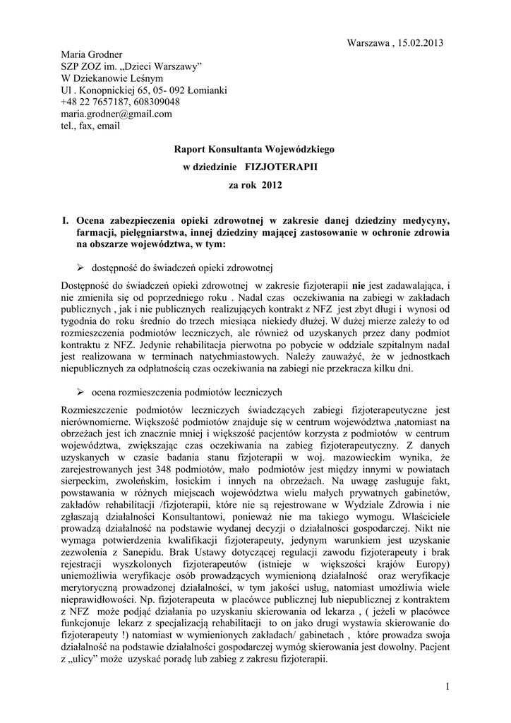 Warszawa , 15.02.2013 Maria Grodner SZP ZOZ im. „Dzieci Warszawy” W Dziekanowie Leśnym Ul . Konopnickiej 65, 05- 092 Łomianki +48 22 7657187, 608309048 [email protected] tel., fax, email Raport Konsultanta Wojewódzkiego w dziedzinie FIZJOTERAPII za rok 2012 I. Ocena zabezpieczenia opieki zdrowotnej w zakresie danej dziedziny medycyny, farmacji, pielęgniarstwa, innej dziedziny mającej zastosowanie w ochronie zdrowia na obszarze województwa, w tym: dostępność do świadczeń opieki zdrowotnej Dostępność do świadczeń opieki zdrowotnej w zakresie fizjoterapii nie jest zadawalająca, i nie zmieniła się od poprzedniego roku . Nadal czas oczekiwania na zabiegi w zakładach publicznych , jak i nie publicznych realizujących kontrakt z NFZ jest zbyt długi i wynosi od tygodnia do roku średnio do trzech miesiąca niekiedy dłużej. W dużej mierze zależy to od rozmieszczenia podmiotów leczniczych, ale również od uzyskanych przez dany podmiot kontraktu z NFZ. Jedynie rehabilitacja pierwotna po pobycie w oddziale szpitalnym nadal jest realizowana w terminach natychmiastowych. Należy zauważyć, że w jednostkach niepublicznych za odpłatnością czas oczekiwania na zabiegi nie przekracza kilku dni. ocena rozmieszczenia podmiotów leczniczych Rozmieszczenie podmiotów leczniczych świadczących zabiegi fizjoterapeutyczne jest nierównomierne. Większość podmiotów znajduje się w centrum województwa ,natomiast na obrzeżach jest ich znacznie mniej i większość pacjentów korzysta z podmiotów w centrum województwa, zwiększając czas oczekiwania na zabieg fizjoterapeutyczny. Z danych uzyskanych w czasie badania stanu fizjoterapii w woj. mazowieckim wynika, że zarejestrowanych jest 348 podmiotów, mało podmiotów jest między innymi w powiatach sierpeckim, zwoleńskim, łosickim i innych na obrzeżach. Na uwagę zasługuje fakt, powstawania w różnych miejscach województwa wielu małych prywatnych gabinetów, zakładów rehabilitacji /fizjoterapii, które nie są rejestrowane w Wydziale Zdrowia i nie zgłaszają działalności Konsultantowi, ponieważ nie ma takiego wymogu. Właściciele prowadzą działalność na podstawie wydanej decyzji o działalności gospodarczej. Nikt nie wymaga potwierdzenia kwalifikacji fizjoterapeuty, jedynym warunkiem jest uzyskanie zezwolenia z Sanepidu. Brak Ustawy dotyczącej regulacji zawodu fizjoterapeuty i brak rejestracji wyszkolonych fizjoterapeutów (istnieje w większości krajów Europy) uniemożliwia weryfikacje osób prowadzących wymienioną działalność oraz weryfikacje merytoryczną prowadzonej działalności, w tym jakości usług, natomiast umożliwia wiele nieprawidłowości. Np. fizjoterapeuta w placówce publicznej lub niepublicznej z kontraktem z NFZ może podjąć działania po uzyskaniu skierowania od lekarza , ( jeżeli w placówce funkcjonuje lekarz z specjalizacją rehabilitacji to on jako drugi wystawia skierowanie do fizjoterapeuty !) natomiast w wymienionych zakładach/ gabinetach , które prowadza swoja działalność na podstawie działalności gospodarczej wymóg skierowania jest dowolny. Pacjent z „ulicy” może uzyskać poradę lub zabieg z zakresu fizjoterapii. 1 ocena zabezpieczenia kadr medycznych w reprezentowanej dziedzinie, w tym ocena prawidłowości rozmieszczenia specjalistów na terenie województwa Zabezpieczenie kadr medycznych w dziedzinie fizjoterapii jest odpowiednie, znacznie przekraczające zapotrzebowanie. Osiem (w ostatnich latach przybyły 3) Wydziałów Fizjoterapii szkolących na poziomie licencjata i na poziomie magistra z nadwyżka zabezpiecza kadrę dla województwa mazowieckiego. Problemem jest rozmieszczenie fizjoterapeutów z tytułem magistra z specjalizacją fizjoterapii, którzy zgodnie z rozporządzeniem mogą być kierownikami Zakładów Rehabilitacji/Fizjoterapii, stąd niekiedy kierownikami są magistrzy bez specjalizacji, którym niekiedy przypisuje się stanowisko koordynatora do spraw organizacyjnych lub lekarz bez lub z specjalizacją rehabilitacji, który niekiedy pełni jednocześnie funkcje kierownika Zakładu, ordynatora Oddziału i dyrektora ds. medycznych. Sytuacja ta w wielu przypadkach umożliwia fizjoterapeucie samemu decydować o sposobie i rodzaju wykonywanych zabiegów, na podstawie skierowania z opisanymi procedurami, które nie zawsze są adekwatne do danej sytuacji. Decyzje podejmowane są samodzielnie również przez osoby o niższych kwalifikacjach (technik lub licencjat), którzy często wykorzystują wytyczne producenta aparatury a nie wytyczne medycyny opartej na dowodach lub na praktyce (EBM lub EBP) ocena kontraktowania świadczeń opieki zdrowotnej Kontraktowanie świadczeń z zakresu rehabilitacji leczniczej ma wykorzystać możliwości danej jednostki, jednakże jest nierównomierne i nie zawsze uwzględnia warunki oraz potencjał osób zatrudnionych w danym Zakładzie Fizjoterapii/Rehabilitacji. Duże jednostki z pełnym wyposażeniem oferujące pełny wachlarz zabiegów (kinezyterapia+fizykoterapia+ terapia zajęciowa+ basen (który generuje koszty) + inne, otrzymują taki sam kontrakt jak mniejsze placówki. Wiąże się to z niewykorzystaniem potencjału dużych placówek i wydłużeniem okresu oczekiwania na zabiegi. W świetle potrzeb (oczekiwanie na świadczenie z zakresu fizjoterapii od ok. 2 - 15 miesięcy) należy stwierdzić, że kontrakty na rehabilitacje lecznicza są zbyt małe i nie racjonalnie rozdysponowane. Zbyt mała liczba miejsc stacjonarnych dla rehabilitacji w dużych ośrodkach, uniemożliwia pacjentom z małych oddalonych miejscowości, korzystanie z zabiegów fizjoterapeutycznych/rehabilitacyjnych w odpowiednim czasie, co przekłada się na większe nakłady finansowe w późniejszym okresie. Z kolei w małych miejscowościach oddalonych od centrum województwa powinno być więcej miejsc na rehabilitacje dzienną, co zmniejszyłoby popyt na miejsca stacjonarne w dużych ośrodkach. Należy bardzo dokładnie an