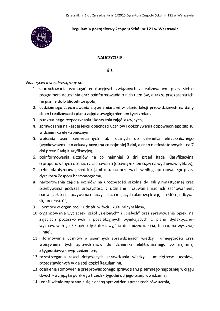 Regulamin porządkowy Zespołu Szkół nr 121 w