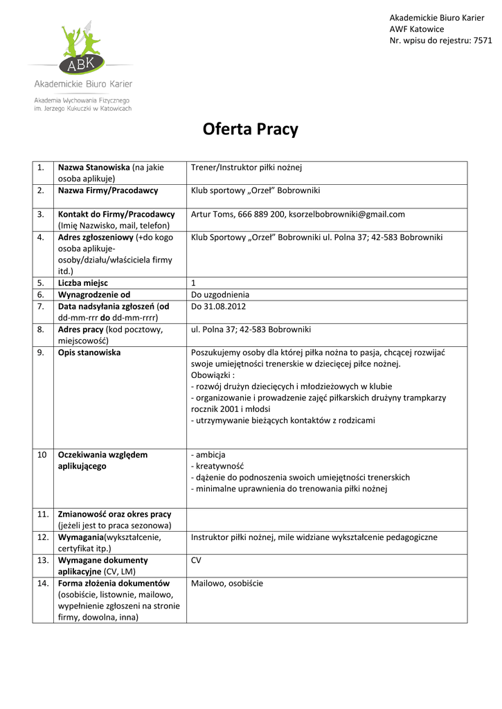 Akademickie Biuro Karier AWF Katowice Nr. wpisu do rejestru: 7571 Oferta Pracy 1. 2. 3. 4. 5. 6. 7. 8. 9. 10 Nazwa Stanowiska (na jakie osoba aplikuje) Nazwa Firmy/Pracodawcy Trener/Instruktor piłki nożnej Kontakt do Firmy/Pracodawcy (Imię Nazwisko, mail, telefon) Adres zgłoszeniowy (+do kogo osoba aplikujeosoby/działu/właściciela firmy itd.) Liczba miejsc Wynagrodzenie od Data nadsyłania zgłoszeń (od dd-mm-rrr do dd-mm-rrrr) Adres pracy (kod pocztowy, miejscowość) Opis stanowiska Artur Toms, 666 889 200, [email protected] Oczekiwania względem aplikującego - ambicja - kreatywność - dążenie do podnoszenia swoich umiejętności trenerskich - minimalne uprawnienia do trenowania piłki nożnej 11. Zmianowość oraz okres pracy (jeżeli jest to praca sezonowa) 12. Wymagania(wykształcenie, certyfikat itp.) 13. Wymagane dokumenty aplikacyjne (CV, LM) 14. Forma złożenia dokumentów (osobiście, listownie, mailowo, wypełnienie zgłoszeni na stronie firmy, dowolna, inna) Klub sportowy „Orzeł” Bobrowniki Klub Sportowy „Orzeł” Bobrowniki ul. Polna 37; 42-583 Bobrowniki 1 Do uzgodnienia Do 31.08.2012 ul. Polna 37; 42-583 Bobrowniki Poszukujemy osoby dla której piłka nożna to pasja, chcącej rozwijać swoje umiejętności trenerskie w dziecięcej piłce nożnej. Obowiązki : - rozwój drużyn dziecięcych i młodzieżowych w klubie - organizowanie i prowadzenie zajęć piłkarskich drużyny trampkarzy rocznik 2001 i młodsi - utrzymywanie bieżących kontaktów z rodzicami Instruktor piłki nożnej, mile widziane wykształcenie pedagogiczne CV Mailowo, osobiście
