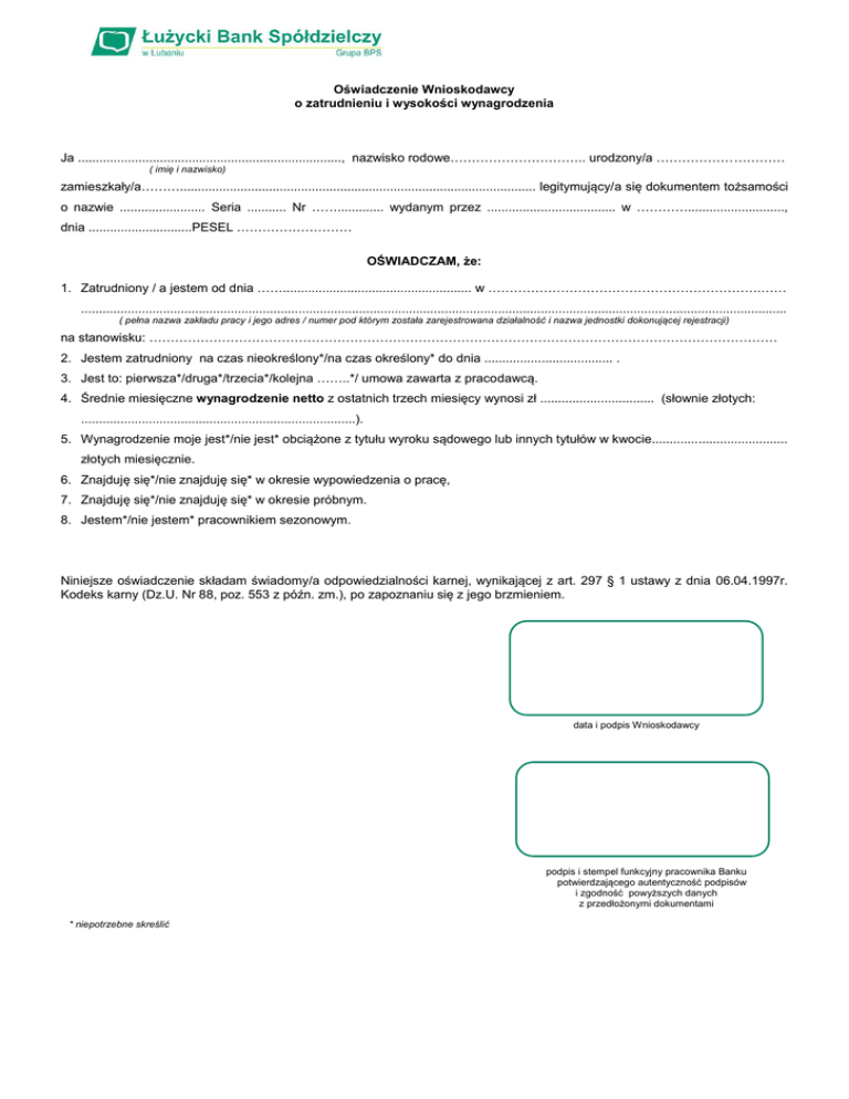 Oświadczenie Wnioskodawcy o zatrudnieniu i wysokości wynagrodzenia Ja .........................................................................., nazwisko rodowe………………………….. urodzony/a ………………………… ( imię i nazwisko) zamieszkały/a……….................................................................................................... legitymujący/a się dokumentem tożsamości o nazwie ........................ Seria ........... Nr ……............. wydanym przez .................................... w …………..........................., dnia .............................PESEL ……………………… OŚWIADCZAM, że: 1. Zatrudniony / a jestem od dnia ……..................................................... w ……………………………………………………….…… ...................................................................................................................................................................................................... ( pełna nazwa zakładu pracy i jego adres / numer pod którym została zarejestrowana działalność i nazwa jednostki dokonującej rejestracji) na stanowisku: ………………………………………………………………………………………………………………………………… 2. Jestem zatrudniony na czas nieokreślony*/na czas określony* do dnia .................................... . 3. Jest to: pierwsza*/druga*/trzecia*/kolejna ……..*/ umowa zawarta z pracodawcą. 4. Średnie miesięczne wynagrodzenie netto z ostatnich trzech miesięcy wynosi zł ................................ (słownie złotych: .............................................................................). 5. Wynagrodzenie moje jest*/nie jest* obciążone z tytułu wyroku sądowego lub innych tytułów w kwocie...................................... złotych miesięcznie. 6. Znajduję się*/nie znajduję się* w okresie wypowiedzenia o pracę, 7. Znajduję się*/nie znajduję się* w okresie próbnym. 8. Jestem*/nie jestem* pracownikiem sezonowym. Niniejsze oświadczenie składam świadomy/a odpowiedzialności karnej, wynikającej z art. 297 § 1 ustawy z dnia 06.04.1997r. Kodeks karny (Dz.U. Nr 88, poz. 553 z późn. zm.), po zapoznaniu się z jego brzmieniem. data i podpis Wnioskodawcy podpis i stempel funkcyjny pracownika Banku potwierdzającego autentyczność podpisów i zgodność powyższych danych z przedłożonymi dokumentami * niepotrzebne skreślić