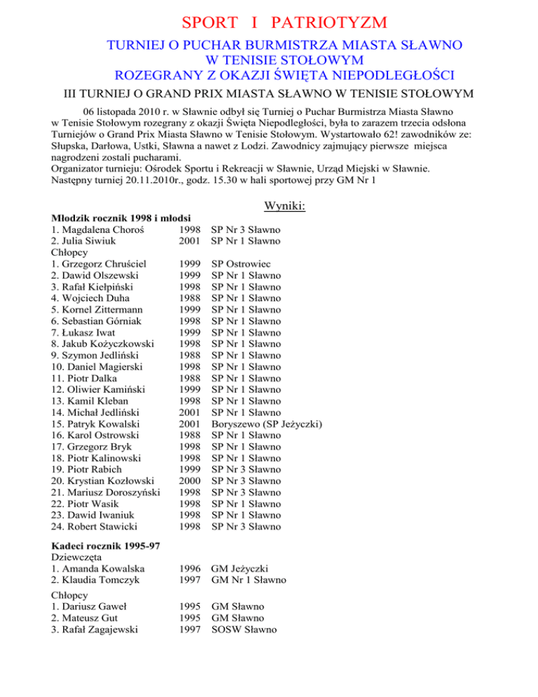 SPORT I PATRIOTYZM TURNIEJ O PUCHAR BURMISTRZA MIASTA SŁAWNO W TENISIE STOŁOWYM ROZEGRANY Z OKAZJI ŚWIĘTA NIEPODLEGŁOŚCI III TURNIEJ O GRAND PRIX MIASTA SŁAWNO W TENISIE STOŁOWYM 06 listopada 2010 r. w Sławnie odbył się Turniej o Puchar Burmistrza Miasta Sławno w Tenisie Stołowym rozegrany z okazji Święta Niepodległości, była to zarazem trzecia odsłona Turniejów o Grand Prix Miasta Sławno w Tenisie Stołowym. Wystartowało 62! zawodników ze: Słupska, Darłowa, Ustki, Sławna a nawet z Lodzi. Zawodnicy zajmujący pierwsze miejsca nagrodzeni zostali pucharami. Organizator turnieju: Ośrodek Sportu i Rekreacji w Sławnie, Urząd Miejski w Sławnie. Następny turniej 20.11.2010r., godz. 15.30 w hali sportowej przy GM Nr 1 Młodzik rocznik 1998 i młodsi 1. Magdalena Choroś 1998 2. Julia Siwiuk 2001 Chłopcy 1. Grzegorz Chruściel 1999 2. Dawid Olszewski 1999 3. Rafał Kiełpiński 1998 4. Wojciech Duha 1988 5. Kornel Zittermann 1999 6. Sebastian Górniak 1998 7. Łukasz Iwat 1999 8. Jakub Kożyczkowski 1998 9. Szymon Jedliński 1988 10. Daniel Magierski 1998 11. Piotr Dalka 1988 12. Oliwier Kamiński 1999 13. Kamil Kleban 1998 14. Michał Jedliński 2001 15. Patryk Kowalski 2001 16. Karol Ostrowski 1988 17. Grzegorz Bryk 1998 18. Piotr Kalinowski 1998 19. Piotr Rabich 1999 20. Krystian Kozłowski 2000 21. Mariusz Doroszyński 1998 22. Piotr Wasik 1998 23. Dawid Iwaniuk 1998 24. Robert Stawicki 1998 Wyniki: SP Nr 3 Sławno SP Nr 1 Sławno SP Ostrowiec SP Nr 1 Sławno SP Nr 1 Sławno SP Nr 1 Sławno SP Nr 1 Sławno SP Nr 1 Sławno SP Nr 1 Sławno SP Nr 1 Sławno SP Nr 1 Sławno SP Nr 1 Sławno SP Nr 1 Sławno SP Nr 1 Sławno SP Nr 1 Sławno SP Nr 1 Sławno Boryszewo (SP Jeżyczki) SP Nr 1 Sławno SP Nr 1 Sławno SP Nr 1 Sławno SP Nr 3 Sławno SP Nr 3 Sławno SP Nr 3 Sławno SP Nr 1 Sławno SP Nr 1 Sławno SP Nr 3 Sławno Kadeci rocznik 1995-97 Dziewczęta 1. Amanda Kowalska 2. Klaudia Tomczyk 1996 GM Jeżyczki 1997 GM Nr 1 Sławno Chłopcy 1. Dariusz Gaweł 2. Mateusz Gut 3. Rafał Zagajewski 1995 1995 1997 GM Sławno GM Sławno SOSW Sławno Juniorzy rocznik 1994-92 Chłopcy 1. Mateusz Jakuszewski 2. Szymon Narbut 3. Mateusz Żebrowski 4. Dariusz Sawosz 5. Oskar Mazur 6. Jacek Miela 7. Pawel Gliwa 8. Andrzej Wygaś 9. Marcin Zawada 1992 ZS Sławno 1993 ZS Sławno 1993 ZS Sławno 1994 Malechowo 1994 ZSP Tychowo 1992 ZSA Sławno 1992 SOSW Sławno 1994 ZS Sławno 1993 ZSA Sławno Seniorzy rocznik 1991 i starsi Kobiety 1. Renata Pietruszka Sławno 2. Jadwiga Choroś Sławno Mężczyźni 1. Włodzimierz Wasielewski 1945 2. Zdzisław Kwaśniak 1960 3. Mirosław Mielczarski 1964 4. Mateusz Lichota 1991 5. Stanisław Lidziński 1957 6. Władysław Mankiewicz 1942 7. Przemysław Stola 1985 8. Ireneusz Partyka 1968 9. Andrzej Malinowski 1953 10. Stanisław Kuciński 1933 11. Jerzy Majchrzak 1972 12. Paweł Przewrocki 1982 13. Bogdan Przybyła 1958 14. Andrzej Piasecki 1953 15. Zenon Mizerek 1960 16. Marcin Miękus 1977 17. Wiesław Mijewski 1954 18. Jerzy Ziółkowski 1947 19. Czesław Kowalski 1968 20. Piotr Marek 1971 Słupsk Słupsk Darłowo Karwice Słupsk Ustka Słupsk Sławno Sławno Łódź Wrześnica Słupsk Bobrowiczki Wrzesnica Gumieniec Boryszewo Gumieniec Słupsk Boryszewo Dębowo