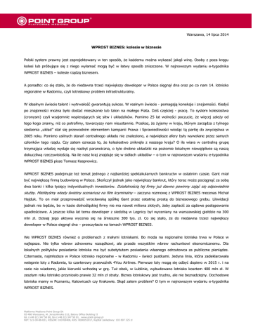 Warszawa, 14 lipca 2014 WPROST BIZNES: kolesie w biznesie Polski system prawny jest zaprojektowany w ten sposób, że każdemu można wykazać jakąś winę. Osoby z poza kręgu kolesi lub próbujące się z niego wyłamać mogą być w łatwy sposób zniszczone. W najnowszym wydaniu e-tygodnika WPROST BIZNES – kolesie rządzą biznesem. A ponadto: co się stało, że do niedawna trzeci największy deweloper w Polsce sięgnął dna oraz po co nam 14. lotnisko regionalne w Radomiu, czyli lotniskowy problem infrastrukturalny. W idealnym świecie talent i wytrwałość gwarantują sukces. W realnym świecie - pomagają koneksje i znajomości. Kiedyś po znajomości można było dostać mieszkanie lub talon na małego Fiata. Dziś częściej - pracę. To system kolesiostwa (cronysm) czyli wzajemnie wspierających się sitw i układzików. Pomimo 25 lat wolności poczucie, że więcej zależy od tego kogo znamy, niż co potrafimy, towarzyszy nam nieustannie. Przekaz, że żyjemy w kraju, którym zarządza z tylnego siedzenia „układ” stał się przewodnim elementem kampanii Prawa i Sprawiedliwości wiodąc tą partię do zwycięstwa w 2005 roku. Pomimo usilnych starań centralnego układu nie znaleziono, a największe afery były wywołane przez samych członków tego rządu. Czy zatem oznacza to, że kolesiostwo zniknęło z naszego kraju? O ile wiara w centralną grupę trzymająca władzę wydaje się nazbyt paranoiczna, o tyle drobne układziki na poziomie lokalnym niewątpliwie są naszą dokuczliwą rzeczywistością. Na ile nasz kraj znajduje się w sidłach układów – o tym w najnowszym wydaniu e-tygodnika WPROST BIZNES pisze Tomasz Kasprowicz. WPROST BIZNES podejmuje też temat jednego z najbardziej spektakularnych bankructw w ostatnim czasie. Gant miał być największą firmą budowlaną w Polsce. Skończył jednak jako największy bankrut, który teraz może pociągnąć za sobą dwa banki i kilka tysięcy indywidualnych inwestorów. Działalnością tej firmy już dawno powinny zająć się odpowiednie służby. Mielibyśmy wtedy świetny scenariusz na film kryminalny – zaczyna rozmowę z WPROST BIZNES mecenas Michał Hajduk. To on miał przeprowadzić wrocławską spółkę Gant przez ostatnią prostą do biznesowego grobu. Likwidacji jednak nie będzie, bo w kasie dolnośląskiej firmy nie ma nawet miliona złotych, żeby zapłacić za sądowe postępowanie upadłościowe. A jeszcze kilka lat temu deweloper z siedzibą w Legnicy był wyceniany na warszawskiej giełdzie na 300 mln zł. Dzisiaj jego aktywa wycenia się na śmieszne 300 tys. zł. Co się stało, że do niedawna trzeci największy deweloper w Polsce sięgnął dna – przeczytacie na łamach WPROST BIZNES. We WPROST BIZNES również o problemach z małymi lotniskami. Bo moda na regionalne lotniska trwa w Polsce w najlepsze. Nie tylko wbrew zdrowemu rozsądkowi, ale przede wszystkim wbrew rachunkowi ekonomicznemu. Dla lokalnych polityków posiadanie lotniska ma być substytutem posiadania własnego odrzutowca za publiczne pieniądze. Czternaste, najmłodsze w Polsce lotnisko regionalne - w Radomiu - świeci pustkami. Jedyna linia, która zadeklarowała wstępnie loty z Radomia, to czarterowy przewoźnik 4You Airlines. Pierwsze loty mogą się odbyć dopiero w 2015 r. i na razie nie wiadomo, jakie kierunki wchodzą w grę. Tuż obok, w Lublinie, wybudowano lotnisko kosztem 400 mln zł. W zeszłym roku lotnisko przyniosło prawie 32 mln zł straty. Biznes lotniskowy jest trudny, ale nie beznadziejny. Dochodowe lotniska mamy w Poznaniu, Katowicach czy Krakowie. Skąd zatem problem? O tym w najnowszym wydaniu e-tygodnika WPROST BIZNES. Platforma Mediowa Point Group SA 02-486 Warszawa, Al. Jerozolimskie 212, Batory Office Building II tel. (+48 22) 347 50 00, fax (+48 22) 347 50 01, www.point-group.pl NIP: 521-00-88-831, REGON: 010768408, KRS: 0000051017, Kapitał zakładowy: 103 897 325 zł WPROST BIZNES to tygodnik gospodarczy dostępny wyłącznie w formie e-wydania. Tygodnik jest dostępny w formie cyfrowej dla prenumeratorów w systemie dystrybucji e-wydań wydawcy na stronie: ewydanie.wprostbiznes.pl. Magazyn jest także dostępny u wszystkich dystrybutorów prasy cyfrowej oraz na platformach na urządzenia mobilne w formie pojedynczych wydań i prenumeraty. Czytelnicy, którzy kupują papierowe wydanie WPROST, co tydzień znajdą w nim kod dostępu do e-wydania WPROST BIZNES, którym mogą się zalogować na stronie wydawcy. E-tygodnik WPROST BIZNES jest już również dostępny w aplikacji natywnej, zarówno w App Store, jak i w Google Play. Aplikacja na iOS jest dostępna pod adresem: https://itunes.apple.com/us/app/wprost-biznes/id861093888?mt=8. Aplikacja na urządzenia z Androidem - pod adresem:https://play.google.com/store/apps/details?id=pl.wprost.biznes. Ważne linki: - e-wydanie dostępne z kodem i główna strona www www.wprostbiznes.pl - e-wydanie dostępne odpłatnie: www.ewydanie.wprostbiznes.pl Twitter: www.twitter.com/Wprostbiznes, @WprostBiznes FB: www.facebook.com/WprostBiznes LinkedIn: www.linkedin.com/company/wprost-biznes e-mail: [email protected] Platforma Mediowa Point Group SA 02-486 Warszawa, Al. Jerozolimskie 212, Batory Office Building II tel. (+48 22) 347 50 00, fax (+48 22) 347 50 01, www.point-group.pl NIP: 521-00-88-831, REGON: 010768408, KRS: 0000051017, Kapitał zakładowy: 103 897 325 zł