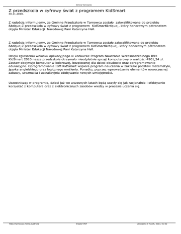 Gmina Tarnowiec Z przedszkola w cyfrowy świat z programem KidSmart 30.11.2010. Z radością informujemy, że Gminne Przedszkole w Tarnowcu zostało zakwalifikowane do projektu „Z przedszkola w cyfrowy świat z programem KidSmart”, który honorowym patronatem objęła Minister Edukacji Narodowej Pani Katarzyna Hall. Z radością informujemy, że Gminne Przedszkole w Tarnowcu zostało zakwalifikowane do projektu „Z przedszkola w cyfrowy świat z programem KidSmart”, który honorowym patronatem objęła Minister Edukacji Narodowej Pani Katarzyna Hall. Dzięki zgłoszeniu wniosku aplikacyjnego w konkursie Program Nauczania Wczesnoszkolnego IBMKidSmart 2010 nasze przedszkole otrzymało nieodpłatnie sprzęt komputerowy o wartości 4901,24 zł. Zestaw obejmuje komputer w kolorowej, bezpiecznej dla dzieci obudowie oraz oprogramowanie edukacyjne. Oprogramowanie IBM KidSmart wspiera program nauczania w zakresie podstaw matematyki, języka angielskiego oraz logicznego myślenia. Ponadto, poprzez wprowadzenie elementów nowoczesnej zabawy, urozmaica i uatrakcyjnia zdobywanie nowych umiejętności. Uczestnicząc w programie, dzieci już we wczesnych latach będą uczyły się jak racjonalnie i efektywnie korzystać z komputera oraz z elektronicznych zasobów wiedzy w procesie uczenia się. http://tarnowiec.home.pl/strona Kreator PDF Utworzono 9 March, 2017, 01:02