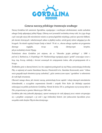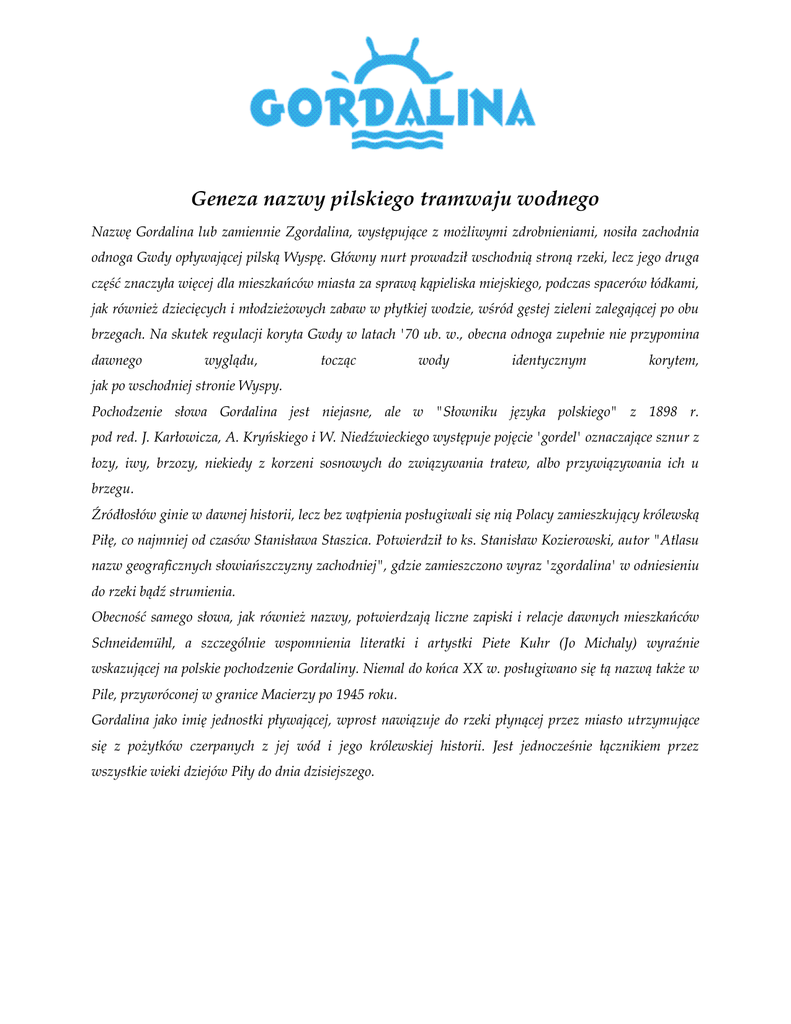 Geneza nazwy pilskiego tramwaju wodnego Nazwę Gordalina lub zamiennie Zgordalina, występujące z możliwymi zdrobnieniami, nosiła zachodnia odnoga Gwdy opływającej pilską Wyspę. Główny nurt prowadził wschodnią stroną rzeki, lecz jego druga część znaczyła więcej dla mieszkańców miasta za sprawą kąpieliska miejskiego, podczas spacerów łódkami, jak również dziecięcych i młodzieżowych zabaw w płytkiej wodzie, wśród gęstej zieleni zalegającej po obu brzegach. Na skutek regulacji koryta Gwdy w latach '70 ub. w., obecna odnoga zupełnie nie przypomina dawnego wyglądu, tocząc wody identycznym korytem, jak po wschodniej stronie Wyspy. Pochodzenie słowa Gordalina jest niejasne, ale w "Słowniku języka polskiego" z 1898 r. pod red. J. Karłowicza, A. Kryńskiego i W. Niedźwieckiego występuje pojęcie 'gordel' oznaczające sznur z łozy, iwy, brzozy, niekiedy z korzeni sosnowych do związywania tratew, albo przywiązywania ich u brzegu. Źródłosłów ginie w dawnej historii, lecz bez wątpienia posługiwali się nią Polacy zamieszkujący królewską Piłę, co najmniej od czasów Stanisława Staszica. Potwierdził to ks. Stanisław Kozierowski, autor "Atlasu nazw geograficznych słowiańszczyzny zachodniej", gdzie zamieszczono wyraz 'zgordalina' w odniesieniu do rzeki bądź strumienia. Obecność samego słowa, jak również nazwy, potwierdzają liczne zapiski i relacje dawnych mieszkańców Schneidemühl, a szczególnie wspomnienia literatki i artystki Piete Kuhr (Jo Michaly) wyraźnie wskazującej na polskie pochodzenie Gordaliny. Niemal do końca XX w. posługiwano się tą nazwą także w Pile, przywróconej w granice Macierzy po 1945 roku. Gordalina jako imię jednostki pływającej, wprost nawiązuje do rzeki płynącej przez miasto utrzymujące się z pożytków czerpanych z jej wód i jego królewskiej historii. Jest jednocześnie łącznikiem przez wszystkie wieki dziejów Piły do dnia dzisiejszego. Autor tekstu – Wojciech Skowroński