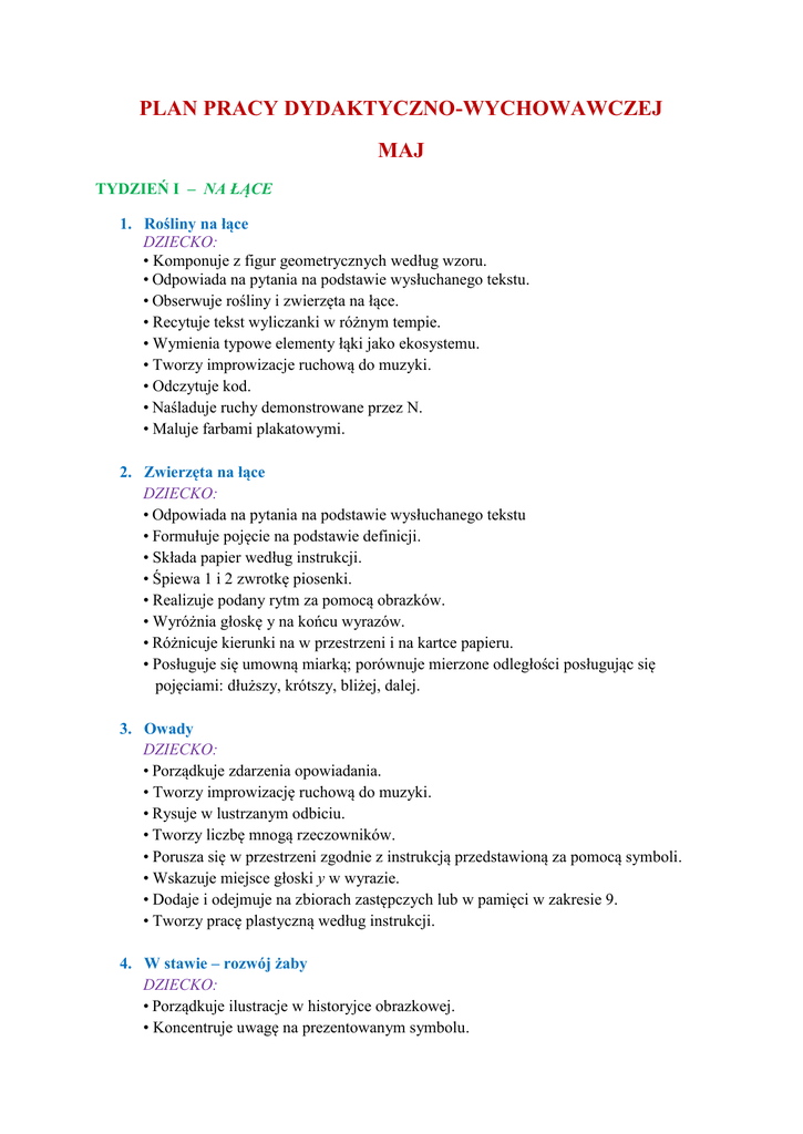 PLAN PRACY DYDAKTYCZNO-WYCHOWAWCZEJ MAJ TYDZIEŃ I – NA ŁĄCE 1. Rośliny na łące DZIECKO: • Komponuje z figur geometrycznych według wzoru. • Odpowiada na pytania na podstawie wysłuchanego tekstu. • Obserwuje rośliny i zwierzęta na łące. • Recytuje tekst wyliczanki w różnym tempie. • Wymienia typowe elementy łąki jako ekosystemu. • Tworzy improwizacje ruchową do muzyki. • Odczytuje kod. • Naśladuje ruchy demonstrowane przez N. • Maluje farbami plakatowymi. 2. Zwierzęta na łące DZIECKO: • Odpowiada na pytania na podstawie wysłuchanego tekstu • Formułuje pojęcie na podstawie definicji. • Składa papier według instrukcji. • Śpiewa 1 i 2 zwrotkę piosenki. • Realizuje podany rytm za pomocą obrazków. • Wyróżnia głoskę y na końcu wyrazów. • Różnicuje kierunki na w przestrzeni i na kartce papieru. • Posługuje się umowną miarką; porównuje mierzone odległości posługując się pojęciami: dłuższy, krótszy, bliżej, dalej. 3. Owady DZIECKO: • Porządkuje zdarzenia opowiadania. • Tworzy improwizację ruchową do muzyki. • Rysuje w lustrzanym odbiciu. • Tworzy liczbę mnogą rzeczowników. • Porusza się w przestrzeni zgodnie z instrukcją przedstawioną za pomocą symboli. • Wskazuje miejsce głoski y w wyrazie. • Dodaje i odejmuje na zbiorach zastępczych lub w pamięci w zakresie 9. • Tworzy pracę plastyczną według instrukcji. 4. W stawie – rozwój żaby DZIECKO: • Porządkuje ilustracje w historyjce obrazkowej. • Koncentruje uwagę na prezentowanym symbolu. • Posługuje się liczebnikami porządkowymi w zakresie 9. • Ilustruje ruchem treść opowiadania. • Tworzy sensowne zdania na podany temat. • Dokonuje analizy i syntezy głoskowej wyrazów. • Różnicuje kierunki na kartce. 5. Plener malarski DZIECKO: • Ilustruje za pomocą liczmanów treść zadania; dodaje i odejmuje na zbiorach zastępczych. • Ilustruje ruchem treść opowiadania. • Czyta wspólnie z N. prosty tekst obrazkowo-wyrazowy. • Rysuje według wzoru. • Naśladuje ruchy warg, języka, policzków demonstrowane przez N. • Tworzy improwizację ruchową do muzyki. TYDZIEŃ II – MOJE ZWIERZĄTKO 6. Mój przyjaciel – pies i kot DZIECKO: • Zgodnie współpracuje w zabawie i przestrzega zasad gry. • Recytuje z pamięci wiersz. • Tworzy zbór siedmioelementowy. • Posługuje się liczebnikami porządkowymi. • Wyodrębnia głoski na końcu i początku wyrazu. • Kreśli wzory po śladzie zgonie z podanym kierunkiem. • Dodaje i odejmuje na zbiorach zastępczych. • Rozumie konieczność opieki nad zwierzętami. 7. To, co pływa, gryzie, piszczy DZIECKO: • Zgodnie współpracuje w zabawie i przestrzega zasad gry. • Opowiada o swoim ulubionym zwierzęciu. • W skupieniu słucha opowiadania. • Tworzy pojęcie na podstawie definicji. • Wystukuje rytm piosenki. • Naśladuje odgłosy zwierząt. • Łączy takie same kształty. • Koloruje obrazek według wzoru. • Układa według wzoru wyraz. 8. U weterynarza DZIECKO: • Naśladuje ruchy wykonywane przez inną osobę. • Wypowiada się na temat wysłuchanego tekstu. • Posługuje się pojęciem weterynarz. • Dodaje i odejmuje na zbiorach zastępczych i tworzy zbiór pusty. • Składa obrazek z pamięci. • Przyjmuje określone role w zabawie tematycznej. • Obserwuje podczas wycieczki • Maluje swoje spostrzeżenia. • Wypowiada się na temat obrazka; dostrzega ukryte elementy. 9. W zoo DZIECKO: • Nazywa zwierzęta egzotyczne. • Dokonuje analizy i syntezy głoskowej nazw zwierząt. • Podejmuje próby układania nazw zwierząt z rozsypanki literowej. • Wskazuje zbiór pusty i jego symbol (0). • Rysuje wzór po śladzie i z pamięci z zachowaniem kierunku. • Tworzy pojęcie na podstawie definicji. • Odczytuje liczby 1–9. • Śpiewa piosenkę przy akompaniamencie. • Zgodnie współpracuje w zabawie i przestrzega zasad gry. 10. Uwaga! Nieznajome zwierzę DZIECKO: • Zgodnie współpracuje w zabawie i przestrzega zasad gry. • Koncentruje uwagę na dźwiękach i nazywa je. • Rozumie zakaz zbliżania się do nieznajomych zwierząt. • Przybiera pozycję bezpieczną w wypadku ataku psa. • Łączy zbiór o określonej liczbie elementów z liczbą. • Wykonuje pracę plastyczną według wzoru. TYDZIEŃ III – MAMA i TATA 11. Moja rodzina DZIECKO: • Dokonuje analizy i syntezy głoskowej wyrazów • Podejmuje próby podpisywania obrazków przy pomocy liter. • Uważnie słucha tekstu. • Tworzy zakończenie historii. • Maluje portret bliskiej osoby. • Posługuje się przymiotnikami dla określenia cech osoby. • Nazywa zawody na podstawie opisu słownego i rekwizytów. • Opowiada o zawodzie wykonywanym przez jednego z rodziców. • Tworzy rodzaj żeński na podstawie rodzaju męskiego. 12. Moja mama wszystko umie DZIECKO: • Utrzymuje porządek w miejscu zabaw. • Dokonuje analizy i syntezy głoskowej wyrazów. • Podejmuje próby podpisywania obrazków za pomocą liter. • Odczytuje kod i koloruje według niego. • Rysuje formy geometryczne według wzoru. • Śpiewa dwie pierwsze zwrotki piosenki. • Układa z pamięci podaną figurę i poprawnie ją nazywa. 13. Pomagamy w domu DZIECKO: • Utrzymuje porządek w miejscu zabaw. • Dokonuje analizy i syntezy głoskowej wyrazów. • Podejmuje próby podpisywania obrazków za pomocą liter. • Swobodnie wypowiada się na temat swoich obowiązków w domu. • Różnicuje strony ciała. • Nazywa urządzenia techniczne, rozumie zakaz samodzielnego ich używania. • Układa z patyczków różnorodne figury geometryczne. 14. Przygotowujemy upominki dla Mamy i Taty DZIECKO: • Dokonuje analizy i syntezy głoskowej wyrazów. • Podejmuje próby podpisywania obrazków za pomocą liter. • Celuje piłką do kosza. • Śpiewa piosenkę z różną dynamiką i tempem. • Tworzy zbiory trzy-, czteroelementowe. • Wykonuje kolejne czynności podczas pi
