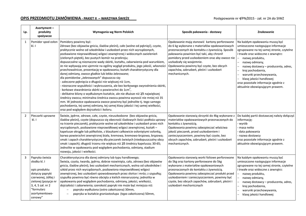 OPIS PRZEDMIOTU ZAMÓWIENIA - PAKIET II – WARZYWA ŚWIEŻE Lp. Asortyment – produkty spożywcze Wymagania wg Norm Polskich Postępowanie nr 4/PN/2015 - zał. nr 2A do SIWZ Sposób pakowania - dostawy Znakowanie 1 Pomidor spod osłon Pomidory powinny być: kl. I Zdrowe (bez objawów gnicia, śladów pleśni), całe (wolne od pęknięć), czyste, praktycznie wolne od szkodników i uszkodzeń przez nich wyrządzonych, pozbawione nieprawidłowej wilgoci zewnętrznej i widocznych zazielenień (zielonych piętek), bez pustych komór na przekroju; dopuszczalne są nieznaczne wady skórki, kształtu, zabarwienia pod warunkiem, że nie wpływają one ujemnie na ogólny wygląd produktu, jego jakość, własności przechowalnicze, prezentację w opakowaniu; kształt charakterystyczny dla danej odmiany, owoce gładkie lub lekko żebrowane; dla pomidorów „żebrowanych” dopuszcza się: - zaleczone pęknięcia o długości nie większej niż 1cm, - nieznaczne wypukłości i wybrzuszenia, ale bez korkowego zwyrodnienia skórki, 2 - korkowe stwardnienia skórki o powierzchni do 1cm , - delikatne blizny o wydłużonym kształcie, ale nie dłuższe niż 2/3 największej średnicy owocu; minimalna średnica owocu powinna wynosić nie mniej niż 35 mm. W jednostce opakowania owoce powinny być jednolite tj. tego samego pochodzenia, tej samej odmiany, tej samej klasy jakości i tej samej wielkości, oraz pod względem dojrzałości i koloru. Opakowanie mają stanowić kartony perforowane do 6 kg wykonane z materiałów opakowaniowych przeznaczonych do kontaktu z żywnością. Sposób pakowania powinien być taki, aby chronił pomidory przed uszkodzeniem oraz aby owoce nie uszkadzały się wzajemnie. Opakowania powinny być czyste, bez obcych zapachów, zabrudzeń, pleśni i uszkodzeń mechanicznych. Na każdym opakowaniu muszą być umieszczone następujące informacje zgrupowane na tej samej stronie, czytelne i trwałe oraz widoczne z zewnątrz: − nazwę produktu, − nazwę odmiany, − nazwę dostawcy – producenta, adres, − kraj pochodzenia, − warunki przechowywania, − klasę jakości handlowej oraz pozostałe informacje zgodnie z aktualnie obowiązującym prawem. 2 Pieczarki uprawne kl. I Świeże, jędrne, zdrowe, całe, czyste, nieuszkodzone (bez objawów gnicia, śladów pleśni), czyste (dopuszcza się obecność śladowych ilości podłoża uprawy na trzonie pieczarek), praktycznie wolne od szkodników i uszkodzeń przez nich wyrządzonych, pozbawione nieprawidłowej wilgoci zewnętrznej, kształt – kapelusze okrągłe lub półkoliste, z blaszkami całkowicie osłoniętymi osłonką, barwa powierzchni zewnętrznej biała, kremowa, kremowo-brązowa, brązowa; smak i zapach charakterystyczny dla pieczarek świeżych (niedopuszczalny obcy smak i zapach); długość trzonu nie większa niż 2/3 średnicy kapelusza; 30-65; Jednolite w opakowaniu pod względem pochodzenia, odmiany, stadium rozwoju, jakości i wielkości. Opakowanie stanowią skrzynki do 4kg wykonane z materiałów opakowaniowych przeznaczonych do kontaktu z żywnością. Opakowania powinny zabezpieczać właściwa jakość pieczarek, przed uszkodzeniem i zanieczyszczeniem, powinny być czyste, bez obcych zapachów, zabrudzeń, pleśni i uszkodzeń mechanicznych. Do każdej partii dostawczej należy dołączyć informację: - wyrób - masa netto - data pakowania - nazwa dostawcy oraz pozostałe informacje zgodnie z aktualnie obowiązującym prawem. 3 Papryka świeża słodka kl. I Charakterystyczna dla danej odmiany lub typu handlowego; Świeża, czysta, twarda, jędrna, dobrze rozwinięta, cała, zdrowa (bez objawów gnicia, śladów pleśni), bez uszkodzeń mechanicznych, wolna od szkodników i szkód przez nich wyrządzonych, pozbawiona nieprawidłowej wilgoci zewnętrznej, bez uszkodzeń spowodowanych przez słońce i mróz; z szypułką; szypułka powinna być równo obcięta a kielich nienaruszony; jednolita w opakowaniu pod względem pochodzenia, odmiany, jakości, wielkości, dojrzałości i zabarwienia; szerokość papryki nie może być mniejsza niż: − papryka wydłużona (ostro zakończona) 30mm, − papryka w kształcie graniastosłupa (tępo zakończona) 50mm, Opakowania stanowią worki foliowe perforowane do 5kg oraz kartony perforowane do 5kg wykonane z materiałów opakowaniowych przeznaczonych do kontaktu z żywnością. Opakowania powinny zabezpieczać produkt przed uszkodzeniem i zanieczyszczeniem, powinny być czyste, bez obcych zapachów, zabrudzeń, pleśni i uszkodzeń mechanicznych Na każdym opakowaniu muszą być umieszczone następujące informacje zgrupowane na tej samej stronie, czytelne i trwałe oraz widoczne z zewnątrz: − nazwę produktu, − nazwę odmiany, − nazwę dostawcy – producenta, adres, − kraj pochodzenia, − warunki przechowywania, − klasę jakości handlowej opis produktu dotyczy papryki czerwonej, żółtej i zielonej (pozycje nr 3, 4, 5 zał. nr 2 ”formularz asortymentowocenowy” − − oraz pozostałe informacje zgodnie z aktualnie obowiązującym prawem. papryka w kształcie graniastosłupa (ostro zakończona) 40mm, papryka spłaszczona (pomidorokształtna) 55mm 4 Pomidor koktajlowy Pomidory powinny być: kl. I − całe; zdrowe; nie dopuszcza się pomidorów z objawami gnicia lub z takimi zmianami, które czynią je niezdatnymi do spożycia; − czyste, praktycznie wolne od jakichkolwiek widocznych zanieczyszczeń obcych; − o świeżym wyglądzie; wolne od szkodników i uszkodzeń spowodowanych przez szkodniki, − wolne od nadmiernego zawilgocenia powierzchniowego; − bez obcych zapachów i/lub smaków, − w przypadku pomidorów na gałązkach szypułki powinny być świeże, zdrowe, czyste oraz bez liści i widocznych zanieczyszczeń obcych. Opakowanie jednostkowe 500g. Opakowanie stanowią kartony perforowane od 10 kg do 15kg oraz skrzynki do 20kg wykonane z materiałów opakowaniowych przeznaczonych do kontaktu z żywnością. Sposób pakowani