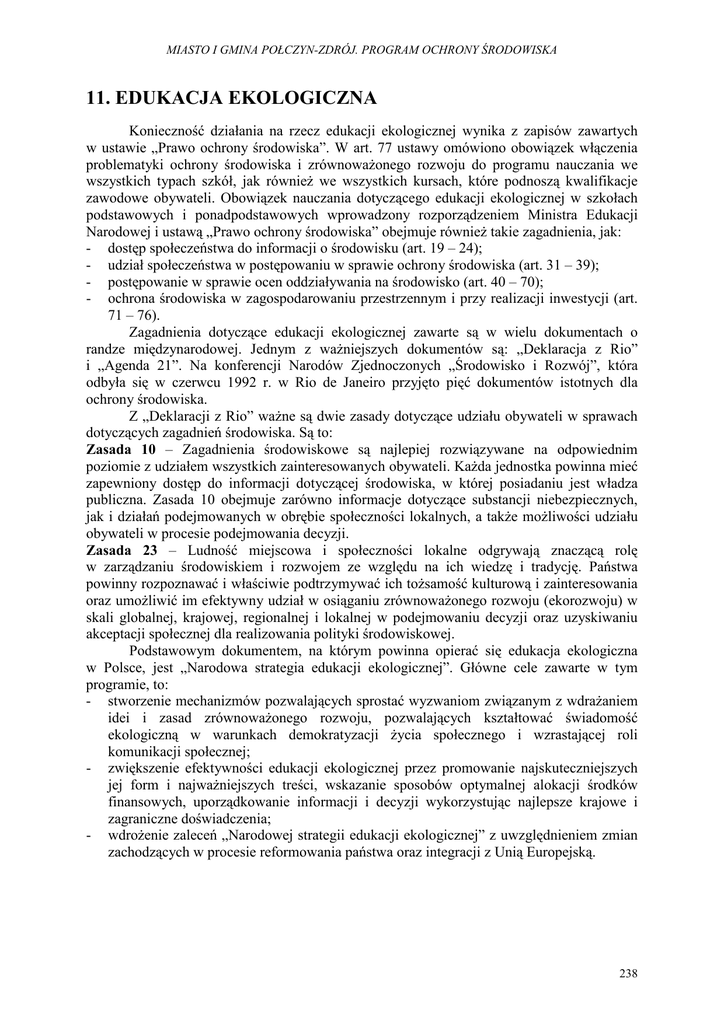 MIASTO I GMINA POŁCZYN-ZDRÓJ. PROGRAM OCHRONY ŚRODOWISKA 11. EDUKACJA EKOLOGICZNA Konieczność działania na rzecz edukacji ekologicznej wynika z zapisów zawartych w ustawie „Prawo ochrony środowiska”. W art. 77 ustawy omówiono obowiązek włączenia problematyki ochrony środowiska i zrównowaŜonego rozwoju do programu nauczania we wszystkich typach szkół, jak równieŜ we wszystkich kursach, które podnoszą kwalifikacje zawodowe obywateli. Obowiązek nauczania dotyczącego edukacji ekologicznej w szkołach podstawowych i ponadpodstawowych wprowadzony rozporządzeniem Ministra Edukacji Narodowej i ustawą „Prawo ochrony środowiska” obejmuje równieŜ takie zagadnienia, jak: - dostęp społeczeństwa do informacji o środowisku (art. 19 – 24); - udział społeczeństwa w postępowaniu w sprawie ochrony środowiska (art. 31 – 39); - postępowanie w sprawie ocen oddziaływania na środowisko (art. 40 – 70); - ochrona środowiska w zagospodarowaniu przestrzennym i przy realizacji inwestycji (art. 71 – 76). Zagadnienia dotyczące edukacji ekologicznej zawarte są w wielu dokumentach o randze międzynarodowej. Jednym z waŜniejszych dokumentów są: „Deklaracja z Rio” i „Agenda 21”. Na konferencji Narodów Zjednoczonych „Środowisko i Rozwój”, która odbyła się w czerwcu 1992 r. w Rio de Janeiro przyjęto pięć dokumentów istotnych dla ochrony środowiska. Z „Deklaracji z Rio” waŜne są dwie zasady dotyczące udziału obywateli w sprawach dotyczących zagadnień środowiska. Są to: Zasada 10 – Zagadnienia środowiskowe są najlepiej rozwiązywane na odpowiednim poziomie z udziałem wszystkich zainteresowanych obywateli. KaŜda jednostka powinna mieć zapewniony dostęp do informacji dotyczącej środowiska, w której posiadaniu jest władza publiczna. Zasada 10 obejmuje zarówno informacje dotyczące substancji niebezpiecznych, jak i działań podejmowanych w obrębie społeczności lokalnych, a takŜe moŜliwości udziału obywateli w procesie podejmowania decyzji. Zasada 23 – Ludność miejscowa i społeczności lokalne odgrywają znaczącą rolę w zarządzaniu środowiskiem i rozwojem ze względu na ich wiedzę i tradycję. Państwa powinny rozpoznawać i właściwie podtrzymywać ich toŜsamość kulturową i zainteresowania oraz umoŜliwić im efektywny udział w osiąganiu zrównowaŜonego rozwoju (ekorozwoju) w skali globalnej, krajowej, regionalnej i lokalnej w podejmowaniu decyzji oraz uzyskiwaniu akceptacji społecznej dla realizowania polityki środowiskowej. Podstawowym dokumentem, na którym powinna opierać się edukacja ekologiczna w Polsce, jest „Narodowa strategia edukacji ekologicznej”. Główne cele zawarte w tym programie, to: - stworzenie mechanizmów pozwalających sprostać wyzwaniom związanym z wdraŜaniem idei i zasad zrównowaŜonego rozwoju, pozwalających kształtować świadomość ekologiczną w warunkach demokratyzacji Ŝycia społecznego i wzrastającej roli komunikacji społecznej; - zwiększenie efektywności edukacji ekologicznej przez promowanie najskuteczniejszych jej form i najwaŜniejszych treści, wskazanie sposobów optymalnej alokacji środków finansowych, uporządkowanie informacji i decyzji wykorzystując najlepsze krajowe i zagraniczne doświadczenia; - wdroŜenie zaleceń „Narodowej strategii edukacji ekologicznej” z uwzględnieniem zmian zachodzących w procesie reformowania państwa oraz integracji z Unią Europejską. 238 MIASTO I GMINA POŁCZYN-ZDRÓJ. PROGRAM OCHRONY ŚRODOWISKA W Strategii wyróŜniamy trzy sfery: Edukacja formalna - to zorganizowany system kształcenia zgodny z określonymi zasadami sformułowanymi w odpowiednich aktach prawnych. Polski system edukacji formalnej obejmuje system oświaty i szkolnictwa wyŜszego. Ekologiczna świadomość społeczna – jest to stan poglądów i wyobraŜeń ludzi o środowisku przyrodniczym, jego antropogenicznym obciąŜeniu, stopniu wyeksploatowania, zagroŜeniach i ochronie, w tym takŜe stan wiedzy o sposobach i instrumentach sterowania, uŜytkowania i ochrony środowiska. Świadomość ta kształtowana jest przede wszystkim przez organizacje państwowe, społeczne oraz media. Szkolenia – to formy przekazywania wiedzy i umiejętności dla określonej grupy zawodowej lub społecznej, słuŜące podnoszeniu kwalifikacji niezbędnych zarówno w Ŝyciu zawodowym, działalności społecznej, jak i dla potrzeb indywidualnych. Zgodnie z „Narodową strategią edukacji ekologicznej” rząd powinien zapewnić wsparcie finansowe, organizacyjne i techniczne instytucjom publicznym na rzecz działań edukacyjnych realizowanych przez organizacje ekologiczne. WaŜnym jest, aby znaleźć odpowiednie środki przekazu, Ŝeby informacja w zakresie wiedzy ekologicznej docierała do wszystkich grup społecznych i to zarówno do dzieci, jak i dorosłych. Powinna ona docierać do pracowników samorządowych, nauczycieli, do dzieci i młodzieŜy oraz wszystkich dorosłych mieszkańców miasta i gminy. Działania, jakie powinno się prowadzić na rzecz edukacji ekologicznej, to przede wszystkim: utworzenie w Urzędzie Miasta i Gminy elektronicznej bazy danych o stanie środowiska; • edukacja w lokalnych mediach i Internecie; • edukacja ekologiczna w szkołach; • organizowanie wystaw, konkursów, przedstawień, wycieczek, festynów; • promowanie alternatywnej (rower, komunikacja zbiorowa) komunikacji w stosunku do samochodu osobowego; • organizowania specjalistycznych szkoleń, między innymi w zakresie: − gospodarki wodno - ściekowej, − selektywnej zbiórki odpadów, − ochrony gruntów, wód powierzchniowych i podziemnych, − nawoŜenia i ochrony roślin, wydawanie broszur informacyjnych np. na temat prawidłowej gospodarki wodą itp. 239
