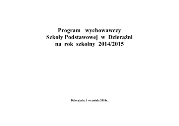 Program wychowawczy Szkoły Podstawowej w Dzierążni na rok szkolny 2014/2015 Dzierążnia, 1 września 2014r. Cel główny : - wszechstronny rozwój ucznia w sferze emocjonalnej, społecznej, duchowej, fizycznej i intelektualnej; Cele szczegółowe: - wdrażanie do przestrzegania ogólnie przyjętych norm moralnych i społecznych, - budowanie więzi uczuciowych: przyjaźni, szacunku, tolerancji oraz prawidłowego komunikowania się, - budzenie odpowiedzialności dziecka za siebie i środowisko , w którym żyje, - rozbudzanie i rozwijanie indywidualnych zdolności twórczych oraz samodzielnego myślenia i działania, - rozwijanie postaw patriotycznych i obywatelskich, przygotowanie do życia w społeczeństwie; Szkolny program wychowawczy podlega ewaluacji 1. Sposoby ewaluacji: a) udział w obchodach świąt narodowych, b) udział w szkolnych konkursach, c) sposób zachowania podczas apeli, akademii, d) gry i zabawy integracyjne, e) dbałość o otoczenie szkoły, klasę, f) analiza ocen z zachowania, g) analiza dokumentacji. 2. Narzędzia ewaluacji: a) badania statystyczne, b) dokumenty, c) ankiety, d) rozmowy, e) obserwacja. I. Wdrażanie do przestrzegania ogólnie przyjętych norm moralnych i społecznych Zadania szczegółowe Formy realizacji Odpowiedzialni Termin 1.Wyrabianie umiejętności przestrzegania określonych - zapoznanie z Wewnątrzszkolnym Systemem norm i reguł życia w szkole, klasie, grupie. Oceniania, Kodeksem zachowania, Regulaminami klasopracowni, zasadami BHP - zawarcie kontraktów klasowych, organizacja zespołów klasowych - 2. Uczenie współdziałania w grupie rówieśniczej z nastawieniem na szacunek dla różnic między ludźmi. - - wdrażanie do pracy w grupach na wszystkich zajęciach, podczas zabaw i gier jak również w czasie rozwiązywania zadań i problemów dydaktycznych wychowawcy klas, - wychowawcy świetlicy - bibliotekarz - n-le wychowania fizycznego - 3. Rozwijanie koleżeństwa, wzajemna pomoc i życzliwość. 4. Uczenie konstruktywnego rozwiązywania konfliktów, negocjowania, przepraszania i przebaczania. - organizowanie zajęć, zabaw, gier integrujących zespoły, wzajemne składanie sobie życzeń z okazji imienin, urodzin, - pomoc bardziej potrzebującym, udział w akcji charytatywnej Zakręceni, Góra grosza - - pogadanki, - trening poprawnej komunikacji, - odgrywanie ról, - szukanie sposobów na pokojowe rozwiązywanie konfliktów i problemów wszyscy nauczyciele, wychowawcy świetlicy opiekunowie organizacji wychowawcy klas, wychowawcy świetlicy, opiekun gromady zuchowej - wychowawcy, - nauczyciele przedmiotów - wychowawcy świetlicy IX - X cały rok cały rok cały rok - nauczyciele zajęć ruchowych, plastycznych, muzycznych, wychowawcy świetlicy 5. Pokazywanie sposobów rozładowywania złych emocji. - aktywność fizyczna, muzyczna, plastyczna sposobem na złość, agresję 6. Odpowiedzialność za własne słowa i czyny. - uczeń zna konsekwencje niewłaściwego zachowania, uczy się samooceny, - prowadzenie zeszytów obserwacji uczniów - wychowawcy klas - nauczyciele cały rok 7. Tworzenie kultury dnia codziennego, troska o kulturę języka, wdrażanie do posługiwania się poprawną polszczyzną. - zapoznanie uczniów z podstawowymi zasadami savoir – vivru - obchody Tygodnia życzliwości w szkole pt. " Obycie umila życie" -przygotowanie Tygodnia Kultury Języka - cały rok - nauczyciel j. polskiego - uczenie dzieci zachowania ładu i porządku na stanowisku pracy - dbałość uczniów wspólnie z wychowawcami o klasopracownie, - przygotowywanie gazetek, prezentacji, - umiejętne gospodarowanie materiałem, - wychowawcy klas, nauczyciele 8. Wyrabianie nawyków poszanowania wspólnego dobra i dóbr osobistych. - - wychowawcy klas, świetlicy bibliotekarze cały rok XI III praca ciągła 9.Uczenie właściwego stosunku do przyrody. 10. Wzmacnianie więzi szkolnych, koleżeńskich , rodzinnych , środowiskowych . 11. Wdrażanie do przestrzegania przepisów ruchu drogowego. - udział uczniów w akcji: „Sprzątanie Świata” - prowadzenie kącików przyrodniczych w kl.I- III, - dbałość o zieleń wokół szkoły - wychowawcy IX , IV cały rok - organizowanie ogólnoszkolnych uroczystości, apeli, dyskotek, akcji,, - prezentowanie umiejętności i prac uczniów, - przygotowywanie imprez szkolnych z udziałem rodziców i zaproszonych gości , - wykonywanie laurek, upominków dla najbliższych z okazji Dnia Babci i Dziadka, ,,Walentynek”, Dnia Matki itp. - wychowawcy cały rok - odpowiedzialni nauczyciele zgodnie z kalendarzem uroczystości wg kalendarza uroczystości - pogadanki, film -praktyczna nauka przechodzenia przez jezdnię - poznanie podstawowych znaków drogowych - wychowawcy I- III praca ciągła II. Rozwój zainteresowań i umiejętności efektywnego uczenia się oraz wykorzystania wiadomości 1. Rozwijanie zainteresowań, zdolności i umiejętności uczniów. 2. Motywowanie uczniów do intelektualnego wysiłku. - udział uczniów w kołach zainteresowań - uczestnictwo w konkursach szkolnych , pozaszkolnych, prezentowanie zdolności i umiejętności uczniów podczas występów, apeli, spotkań -promowanie twórczości uczniów na gazetkach ,wystawach, w prasie, internecie, kronice szkoły -nagradzanie zwycięzców - edukacja teatralna z Teatrem telewizji - opiekunowie kół zainteresowań, cały rok -nauczyciele i wychowawcy, n-le prowadzący kronikę, stronę internetową - warsztaty dla uczniów „ Uczymy się uczyć – organizacja nauki własnej” - udział uczniów w konkursie humanistycznym, matematyczno –przyrodniczym z j. angielskiego - Konkurs Biblijny - przeprowadzenie Szkolnych zmagań z ortografią - zorganizow. kon. Mistrz rachunków kl. I-VI - korzystanie z różnych źródeł wiedzy (książki, słowniki, czasopisma, komputerowe programy edukacyjne, Internet) - propagowanie czytelnictwa: quizy,zagadki itp. - spotkania - wizyty biblioteczne, - prezentacje ciekawej literatury, udostępnianie