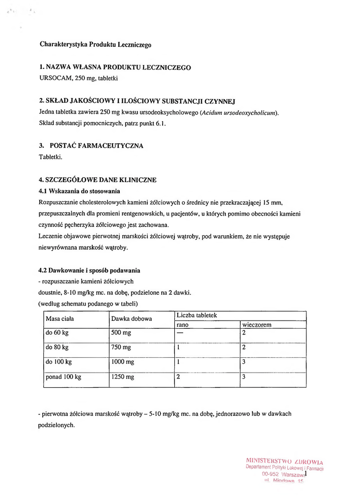 Charakterystyka Produktu Leczniczego 1. NAZWA WŁASNA PRODUKTU LECZNICZEGO URSOCAM, 250 mg, tabletki 2. SKŁAD JAKOŚCIOWY I ILOŚCIOWY SUBSTANCJI CZYNNEJ Jedna tabletka zawiera 250 mg kwasu ursodeoksycholowego (Acidum ursodeoxycholicum). Skład substancji pomocniczych, patrz punkt 6.1. 3. POSTAĆ FARMACEUTYCZNA Tabletki. 4. SZCZEGÓŁOW E DANE KLINICZNE 4.1 Wskazania do stosowania Rozpuszczanie cholesterolowych kamieni żółciowych o średnicy nie przekraczającej 15 mm, przepuszczalnych dla promieni rentgenowskich, u pacjentów, u których pomimo obecności kamieni czynność pęcherzyka żółciowego jest zachowana. Leczenie objawowe pierwotnej marskości żółciowej wątroby, pod warunkiem, że nie występuje niewyrównana marskość wątroby. 4.2 Dawkowanie i sposób podawania - rozpuszczanie kamieni żółciowych doustnie, 8-10 mg/kg mc. na dobę, podzielone na 2 dawki. (według schematu podanego w tabeli) 500 mg Liczba tabletek rano — wieczorem 2 do 80 kg 750 mg 1 2 do 100 kg 1000 mg 1 3 ponad 100 kg 1250 mg 2 3 Masa ciała Dawka dobowa do 60 kg - pierwotna żółciowa marskość wątroby - 5-10 mg/kg mc. na dobę, jednorazowo lub w dawkach podzielonych. m in is t e r s t w o z d r o w ia Departament Polityki Lekowej i Farmacii 00-952 Warszaw^ ui M io d o w a 1F 4.3 Przeciwwskazania - nadwrażliwość na substancję czynną i (lub) substancje pomocnicze, - ostre zapalenie pęcherzyka żółciowego i dróg żółciowych, - niedrożność przewodu żółciowego wspólnego lub przewodu pęcherzykowego. Preparatu Ursocam nie należy stosować, jeśli pęcherzyk żółciowy jest niewidoczny na zdjęciu rentgenowskim, jeśli występują zwapnienia w obrębie złogów, jeśli czynność skurczowa pęcherzyka żółciowego jest zaburzona lub jeśli często występuje kolka żółciowa. 4.4 Specjalne ostrzeżenia i środki ostrożności Ursocam należy stosować pod nadzorem lekarza. Parametry czynności wątroby - AspAT (GOT), AIAT (GPT) i y-GT należy kontrolować co 4 tygodnie przez pierwsze 3 miesiące leczenia, a następnie co 3 miesiące. Z myślą o ocenie skuteczności leczenia i wczesnym wykryciu zwapnień w obrębie złogów żółciowych, należy wykonać badanie radiologiczne pęcherzyka żółciowego (cholecystografię doustną) po 6-10 miesiącach od rozpoczęcia leczenia, w zależności od średnicy złogów. Zdjęcia (przeglądowe i po podaniu kontrastu) należy wykonać zarówno w pozycji stojącej, jak i leżącej (monitorowanie ultrasonograficzne). 4.5 Interakcje z innymi lekami i inne rodzaje interakcji Preparatu Ursocam nie należy stosować z cholestryaminą, kolestypolem lub wodorotlenkiem glinu i (lub) lekami zobojętniającymi kwas solny, zawierającymi wodorotlenek glinu i trójkrzemian magnezu. Wymienione substancje wiążą kwas ursodeoksycholowy w przewodzie pokarmowym i uniemożliwiają jego wchłanianie, co powoduje, że leczenie jest nieskuteczne. Jeśli stosowanie preparatu zawierającego jedną z wymienionych substancji jest konieczne, to Ursocam należy przyjmować dwie godziny przed lub po zastosowaniu tego preparatu. Ursocam może nasilać wchłanianie cyklosporyny z przewodu pokarmowego. U pacjentów leczonych cyklosporyną należy kontrolować stężenie cyklosporyny we krwi, a w razie konieczności zmniejszyć dawkę cyklosporyny. W pojedynczych przypadkach, Ursocam może zmniejszać wchłanianie cyprofloksacyny. Kwas ursodeoksycholowy zmniejsza szczytowe stężenie antagonisty wapnia, nitrendypiny, w osoczu krwi (Cnuj) oraz pole pod krzywą AUC przedstawiają zmiany stężenia tego leku w osoczu krwi-w 7J )1U)WI* rtoLdament Polityki Lekowej i Farmaa czasie. W jednym przypadku opisano interakcję z dapsonem (zmniejszenia działania terapeutycznego ni yilorinw fi 1? 2 tego leku). Na podstawie wpływu na własności farmakokinetyczne nitrendypiny, wpływu na działanie dapsonu oraz wyników badań in vitro można przypuszczać, że kwas ursodeoksycholowy pobudza izoenzym 3A4 cytochromu P450, metabolizujący leki. Należy zatem zachować ostrożność przy jednoczesnym stosowaniu leków, metabolizowanych z udziałem tego enzymu. Może być konieczne skorygowanie dawek leków. 4.6 Ciąża lub laktacja Badania na zwierzętach wykazały ryzyko uszkodzenia w trakcie stosowania preparatu Ursocam we wczesnej fazie ciąży. Ze względu na brak dokładnych badań przeprowadzonych u ludzi, kobiety w wieku rozrodczym powinny przyjmować ten lek tylko z równoczesnym stosowaniem środków antykoncepcyjnych. Przed rozpoczęciem leczenia należy sprawdzić czy pacjentka nie jest w ciąży. Ze względów bezpieczeństwa nie należy stosować leku w pierwszym trymestrze ciąży. Nie ma wystarczających danych na temat przenikania kwasu ursodeoksycholowego do mleka matki. Preparatu Ursocam nie należy stosować w okresie karmienia piersią. 4.7 Wpływ na zdolność prowadzenia pojazdów mechanicznych i obsługiwania urządzeń mechanicznych w ruchu Nie obserwowano wpływu leku na zdolność prowadzenia pojazdów mechanicznych i obsługiwania urządzeń mechanicznych w ruchu. 4.8 Działania niepożądane Częstość występowania działań nieporządanych określa się według następujących klasyfikacji: Bardzo często: u ponad 1 na 10 pacjentów; Często: u ponad 1 na 100 pacjentów; Niezbyt często: u ponad 1 na 1000 pacjentów; Rzadko: u ponad 1 na 10 000 pacjentów Bardzo rzadko: w jednym przypadku na 10 000 pacjentów, w tym pojedyncze przypadki. Zaburzenia żołądka i jelit: W badaniach klinicznych często zgłaszano jasne stolce lub biegunkę podczas przyjmowania kwasu ursodeoksycholowego. Bardzo rzadko podczas leczenia pierwotnej marskości żółciowej występował silny ból w prawym górnym kwadrancie brzucha. ncT\VO ZDKO'V1 [YtlNlS i k „ ,. i aUowp1; FaniiP' Departament Pomyk' U>kow«! Zaburzenia wątroby i dróg żółciowych: W trakcie leczenia kwasem ursodeoksycholowym w bardzo rzadkich przypadkach może dojść do zwapnienia kamieni żółciowyc