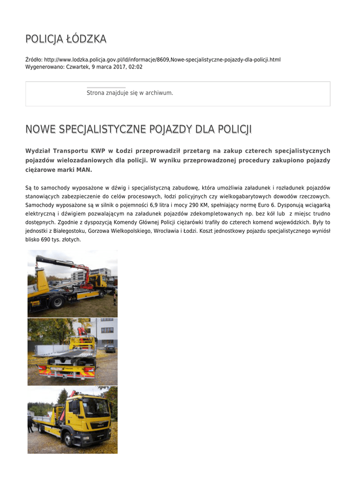 POLICJA ŁÓDZKA Źródło: http://www.lodzka.policja.gov.pl/ld/informacje/8609,Nowe-specjalistyczne-pojazdy-dla-policji.html Wygenerowano: Czwartek, 9 marca 2017, 02:02 Strona znajduje się w archiwum. NOWE SPECJALISTYCZNE POJAZDY DLA POLICJI Wydział Transportu KWP w Łodzi przeprowadził przetarg na zakup czterech specjalistycznych pojazdów wielozadaniowych dla policji. W wyniku przeprowadzonej procedury zakupiono pojazdy ciężarowe marki MAN. Są to samochody wyposażone w dźwig i specjalistyczną zabudowę, która umożliwia załadunek i rozładunek pojazdów stanowiących zabezpieczenie do celów procesowych, łodzi policyjnych czy wielkogabarytowych dowodów rzeczowych. Samochody wyposażone są w silnik o pojemności 6,9 litra i mocy 290 KM, spełniający normę Euro 6. Dysponują wciągarką elektryczną i dźwigiem pozwalającym na załadunek pojazdów zdekompletowanych np. bez kół lub z miejsc trudno dostępnych. Zgodnie z dyspozycją Komendy Głównej Policji ciężarówki trafiły do czterech komend wojewódzkich. Były to jednostki z Białegostoku, Gorzowa Wielkopolskiego, Wrocławia i Łodzi. Koszt jednostkowy pojazdu specjalistycznego wyniósł blisko 690 tys. złotych. Ocena: 0/5 (0) Tweetnij ciężarówka