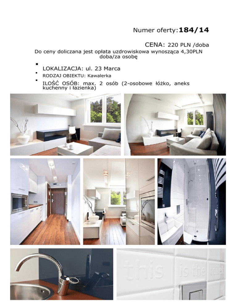 Numer oferty:184/14 CENA: 220 PLN /doba Do ceny doliczana jest opłata uzdrowiskowa wynosząca 4,30PLN doba/za osobę LOKALIZACJA: ul. 23 Marca RODZAJ OBIEKTU: Kawalerka ILOŚĆ OSÓB: max. 2 osób (2-osobowe łóżko, aneks kuchenny i łazienka) Numer oferty: 184/14 LOKALIZACJA: ul. 23 Marca Lp. PRZEDMIOT OCENY UWAGI 1. Nowe/stare budownictwo Stare 2. Nowe/stare meble Nowe meble 3. Parking na posesji/Garaż Parking przy posesji 4. Balkon / taras / ogródek Nie 5. Telewizor (Kablówka, TV Sat), Radio TV 6. Dostęp do telefonu Nie 7. Dostęp do internetu Nie 8. Kuchnia Tak, wyposażona w naczynia, garnki oraz sztućce. 9. Łazienka Tak 10. Pościel, ręczniki Pościel i ręczniki 11. Dostęp do szafy / półek Tak 12. Pobyt ze zwierzątkiem Nie 14. Niepełnosprawni (winda, podjazd) Nie 15. Plac zabaw dla dzieci Nie 16. Lokalizacja Apartament mieści się na cichej, spokojnej ulicy, blisko las 17. Centrum – Dworzec PKP Plaża, park Dzielnica Komunikacja miejska Osoby palące 18. Piwnica/schowek Nie 19. Faktura VAT lub Rachunek 20. Inne Nie